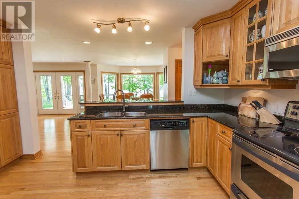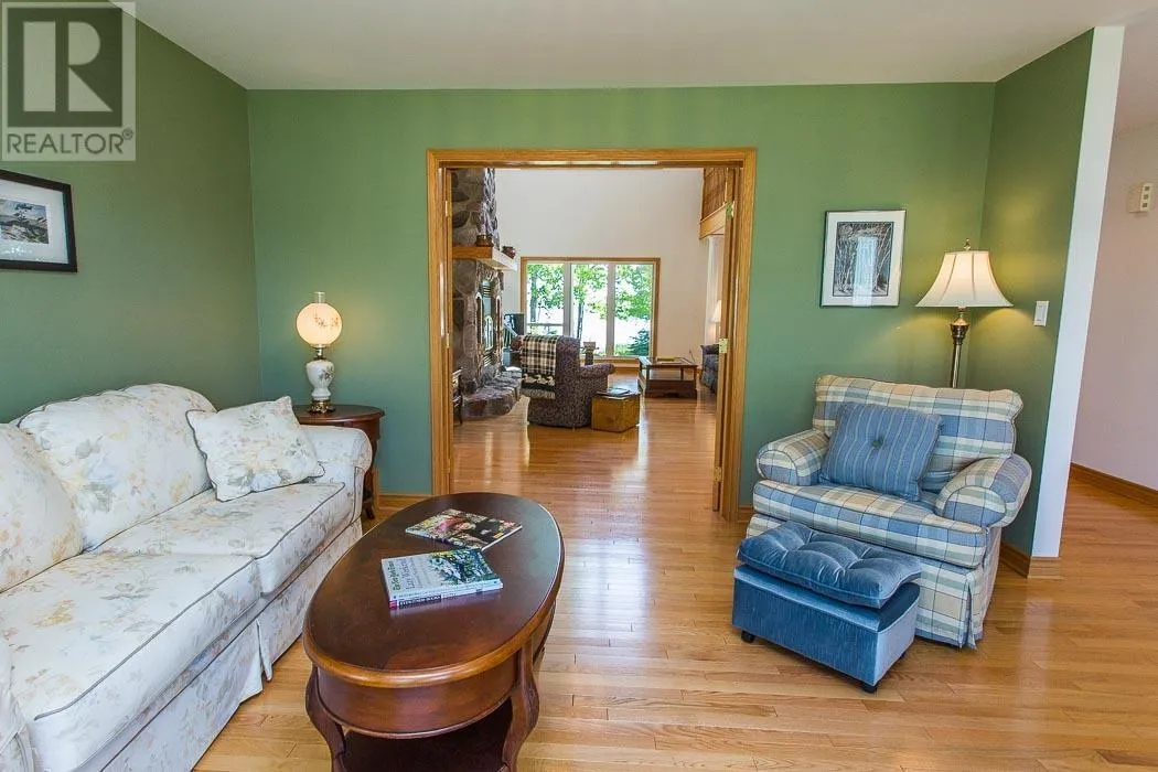 Highway 17 East to Thessalon, Lighthouse Point Subdivision is at the South end Custom-built, meticulously maintained, and perfectly positioned on a double lot, this waterfront home offers year-round comfort and elevated living! Step inside to an expansive great room featuring hardwood floors, cathedral ceilings, and a show-stopping floor-to-ceiling stone fireplace. The open-concept main level includes a spacious kitchen with raised breakfast bar and views of the lake through curved wall-to-wall windows. Garden doors lead to a covered lakeside deck - perfect for morning coffee or summer entertaining. The main-floor primary suite offers a luxurious lakeside retreat with patio access, his & hers walk-in closets, and an ensuite bath with jet tub, double vanity, and separate shower. Additional main-level features include a large dining area, sitting room, living room, half bath, laundry room with double sink, and access to the attached double+ garage. Upstairs, the lofted living space includes a bonus/rec room, large family room and office area with serene treetop views. Two bedrooms, each with a 4-pc bathroom ensuite complete the upper level. The partially finished basement is clean, drywalled, and painted with great ceiling height, divided into open rooms with storage, workshop area, mechanical room, and rough-ins - offering incredible potential to finish to your needs. A true Northern Ontario gem built for relaxed elegance, entertaining, and life on the water. With full town services including natural gas and cable, and convenient access to the highway and all town amenities, yet a world away from the ordinary at this exclusive peninsula location in Lake Huron. (id:27476)