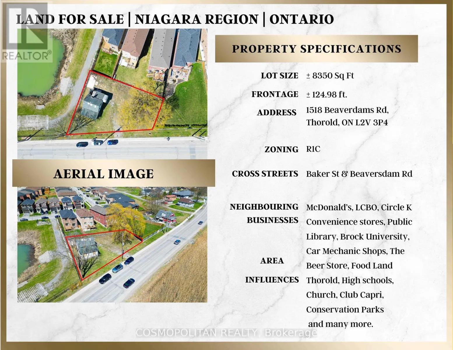 Cross Streets: Collier Road South and Battle Street. ** Directions: From QEW W, take Hwy 406 S, exit onto Hwy 58 S through the Thorold Tunnel, then turn right on Beaverdams Rd. Continue straight 1518 Beaverdams Rd is near Collier Rd. Attention builders and developers! This is a rare opportunity to secure a prime 8,350 sq.ft. infill lot with 124.98 ft of frontage in a rapidly growing Thorold community. Zoned R1C, this site allows for singles, semis, duplex/triplex, or street townhomes giving you flexibility to maximize your build. Perfectly positioned, the property backs onto a brand-new subdivision with 448 detached homes and 60 apartment units, ensuring strong future value and buyer demand. Located just 6 minutes to Brock University and The Pen Centre, and only 2 minutes to Highway 406, it offers excellent connectivity for commuters and students alike. Nearby conveniences include McDonalds, LCBO, schools, public library, shopping, conservation areas, and more, all adding to the appeal of this desirable location. With the upcoming 1.2M sq.ft. South Niagara Hospital and Niagara Falls GO Train expansion, this area is poised for significant growth. Bring your vision and offers today! (id:27476)
