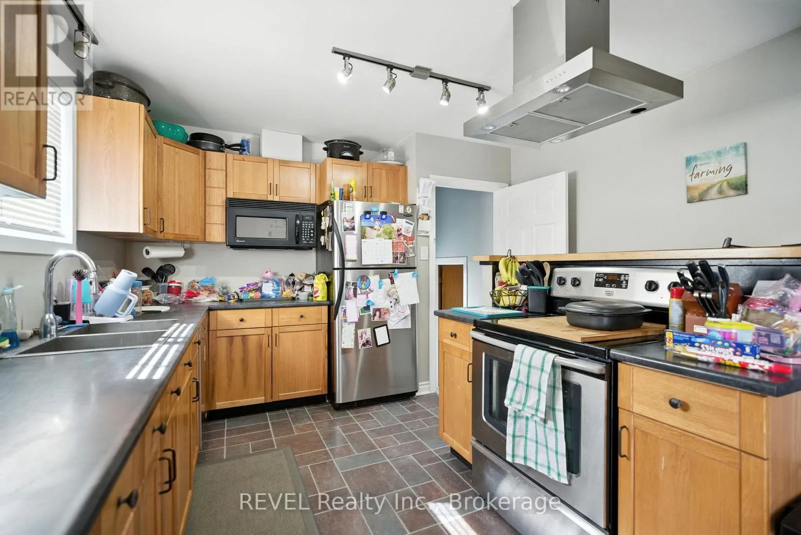 Cross Streets: Hwy 58 to Collier. ** Directions: Turn left onto Burleigh Hill Dr/Regional Rd 56 Continue to follow Regional Rd 56 Destination will be on the left. Welcome to 46 Collier Rd S! This charming 3-bedroom, 2-bathroom brick bungalow with a 1.5-car garage and finished basement is ideally located close to schools, shopping, and highway access. Step inside to an inviting open-concept main floor, featuring a spacious living room with hardwood floors. The kitchen and dining area have been updated with modern cabinetry and stainless steel appliances, and from the dining area, patio doors lead directly to the backyard, with a generous size yard and a hot tub, perfect for entertaining or relaxing outdoors. Down the hall, you'll find three well-sized bedrooms with original hardwood flooring, along with a bright 3-piece bathroom. The fully finished basement expands your living space with a large recreation room complete with a cozy sitting/TV area and a wet bar a fantastic space for gatherings. You'll also find a generous storage area, a cold cellar, and a second 3-piece bathroom.This home offers a wonderful balance of comfort, updates, and convenience ready for you to move in and enjoy. (id:27476)