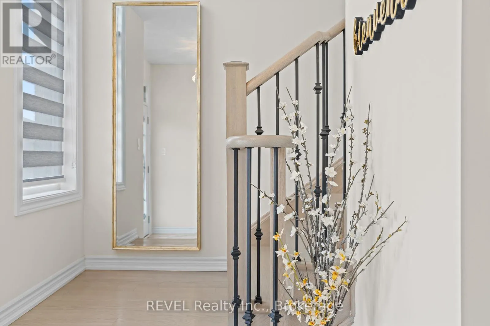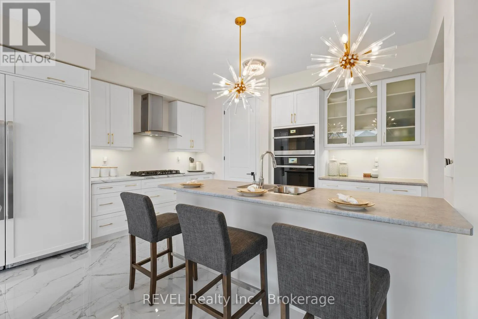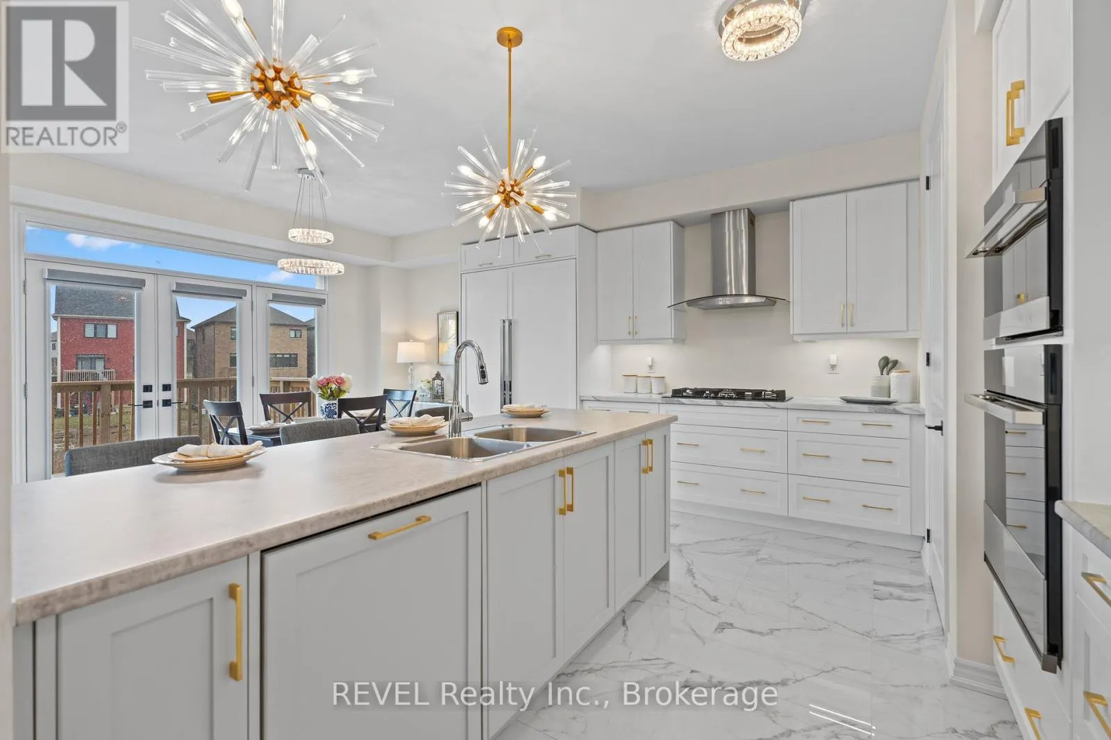 Cross Streets: Barker Pkwy. ** Directions: ON-58-Barker Pkwy-Explorer Wy. Modern Architectural Masterpiece Backing Onto Ravine Views: Perfectly positioned on a premium 50-ft ravine lot with stunning sunset views, this architecturally striking two-story home offers an exceptional blend of modern design, privacy, and elevated living. A bold exterior sets the tone, while inside, carefully selected finishes create a refined yet functional space. Double entry doors open to a bright main level with 9-ft ceilings, solid 8-ft interior doors, and oversized 24x24 porcelain tile. Engineered hardwood flows through the dining and living areas, highlighted by a sleek gas fireplace and expansive windows overlooking the ravine. Triple French doors lead to a spacious deck with gas BBQ hookup-ideal for entertaining or relaxing outdoors. The chef-inspired kitchen is a true statement, featuring custom cabinetry, soft-close drawers, glass accents, and elegant gold hardware, paired with premium built-in Dacor appliances including a 30-inch column fridge, 24-inch freezer, glass cooktop, and combination wall oven/microwave. Upstairs, an oak staircase with wrought-iron detailing leads to generous bedrooms. The primary suite offers a spa-like ensuite with double vanities, a freestanding soaker tub, and a frameless glass shower. Secondary bedrooms share a stylish Jack & Jill bathroom with floating vanities. The walkout basement provides excellent flexibility with oversized windows, triple French doors, laundry hookup, rough-in bath, and separate side entrance-ideal for an in-law suite, home office, or future income potential. Notable upgrades include Nest thermostat, motorized blinds, upgraded lighting, central vacuum, humidifier, air conditioning, mudroom with garage access, walk-in pantry, garage door opener, and EV charger rough-in. A sophisticated home designed for those who expect more. (id:27476)