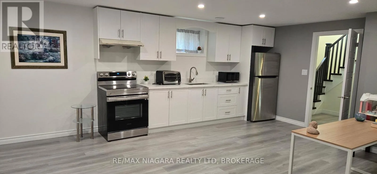 Off Merritt Road / Eastman Modern and bright 2-bedroom basement apartment featuring high ceilings, large windows, and quality finishes throughout. The open-concept layout features a contemporary kitchen with granite countertops, soft-close cabinetry, and plenty of pot lights. Both spacious bedrooms include large walk-in closets. The unit is finished with waterproof vinyl flooring and offers central air conditioning and heating for year-round comfort. The bathroom also features granite countertops and modern fixtures. Laundry is conveniently located on the main floor. Parking is available on the driveway and on the street in front of the home. Located in the prestigious Merritt Meadows subdivision, close to Seaway Mall, Niagara College, restaurants, and grocery shopping. $1,790/month - all utilities, Wi-Fi, hydro, and water included. (id:27476)