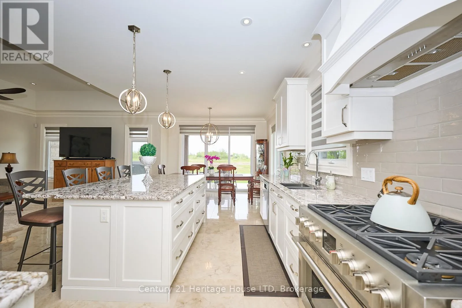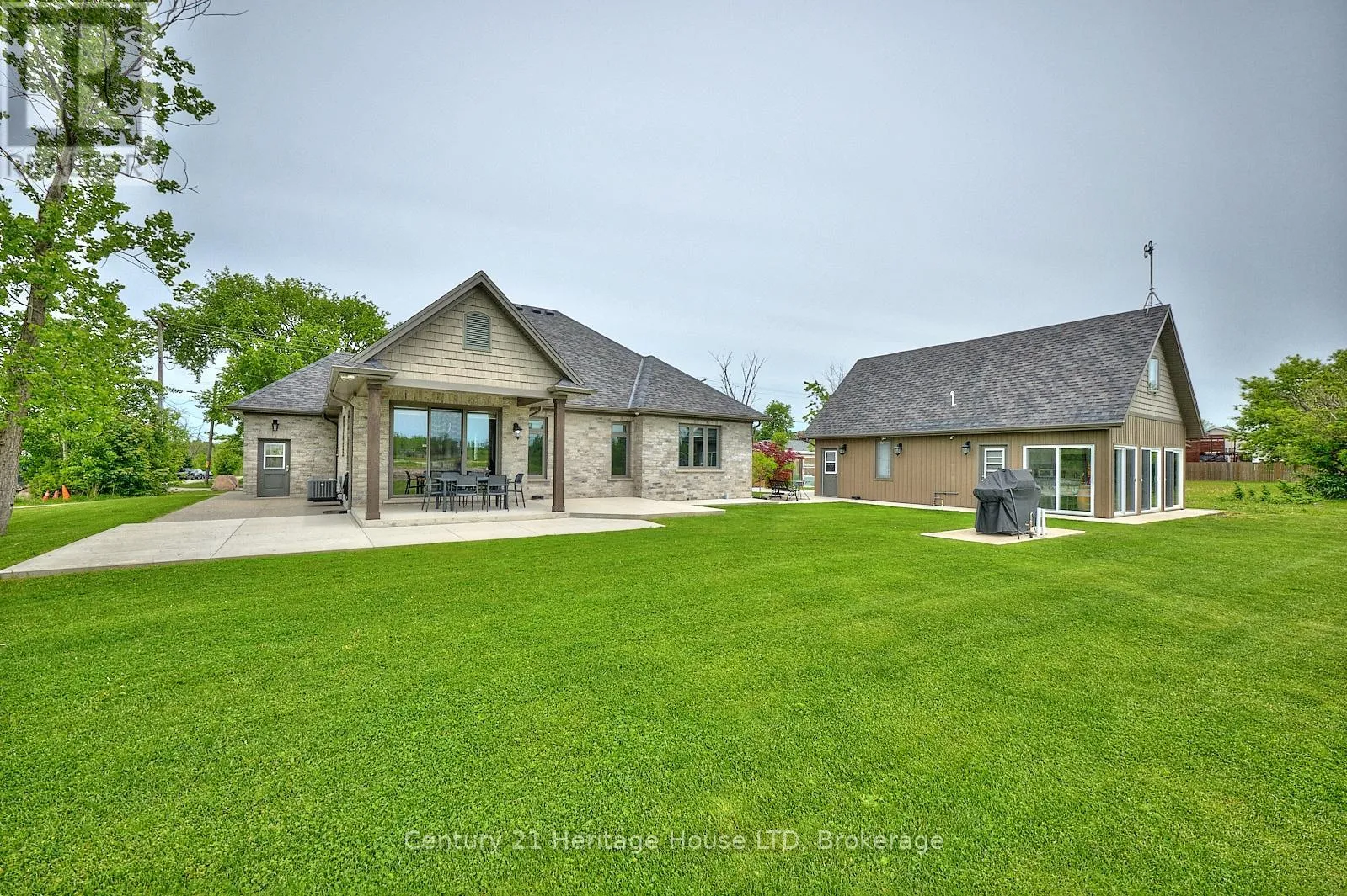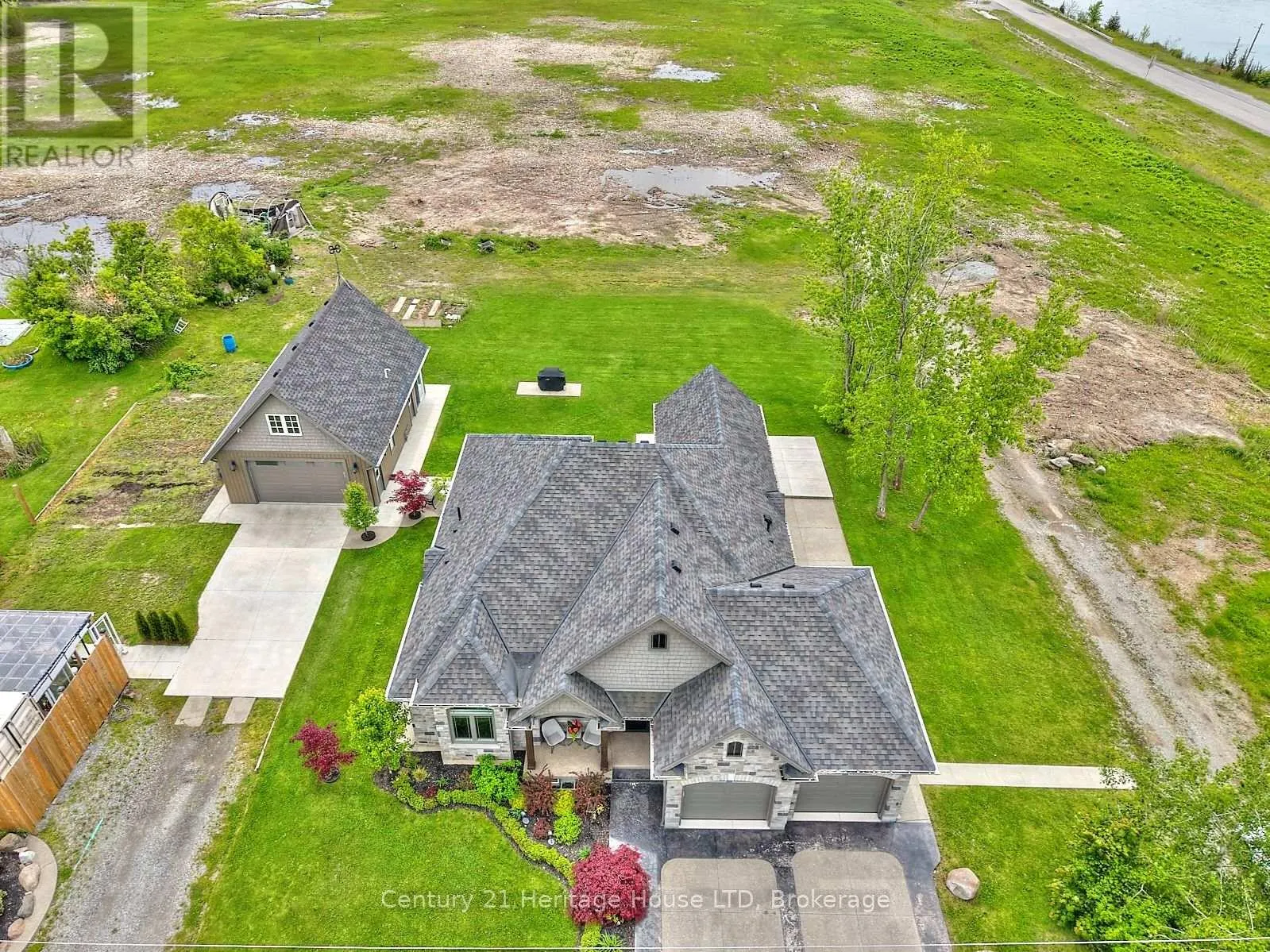 Cross Streets: River and Biggar. ** Directions: Off River St. One of a kind, custom built home with views of the canal, 2800 sq ft of finished living space, with a fully finished basement with in-law capability with a 2nd kitchen and separate walk-up entrance to the double garage, plus a bonus detached double garage with 3rd kitchen, all on 120 ft frontage! Potential to sever side lot into another building lot. Watch the ships go by from your own window, driveway or porch! Located in close proximity to the future South Niagara Hospital. This stunning home offers oversized tile flooring and hardwood flooring throughout, an open concept Great Room with a gorgeous kitchen w/walk-in pantry, high end European s/s appliances, oversized island, granite counters & tile backsplash. Patio doors off the dining area lead to your large covered concrete patio! The primary suite offers a generous sized walk-in closet & 3pc ensuite w/large custom tile and glass shower. A guest bedroom with bonus office or sitting room, 4pc bath, and laundry/mudroom with inside entry from the attached double garage completes the main floor. The basement is fully finished with a separate walk-up to the garage, a full sized 2nd kitchen, a large combo living/dining area with a rough-in for a gas fireplace, a 3rd bedroom, and 3pc bath. The 2 level heated detached garage offers the ultimate man cave experience with a 3rd full sized kitchen with multiple patio doors, and bonus flex space on the 2nd level. Other features include 9ft ceilings on the main floor, tray ceilings, all trim is solid poplar, beautiful 7.5" baseboards, 8" crown moulding throughout main floor, rough in for future in floor heating in basement and attached garage, exposed aggregate driveway, concrete patio, covered front porch, tankless hot water heater, air filtration system, central vacuum, 200 amp service, custom window coverings, security system, 2nd driveway, all stone and solid brick exterior. (id:27476)