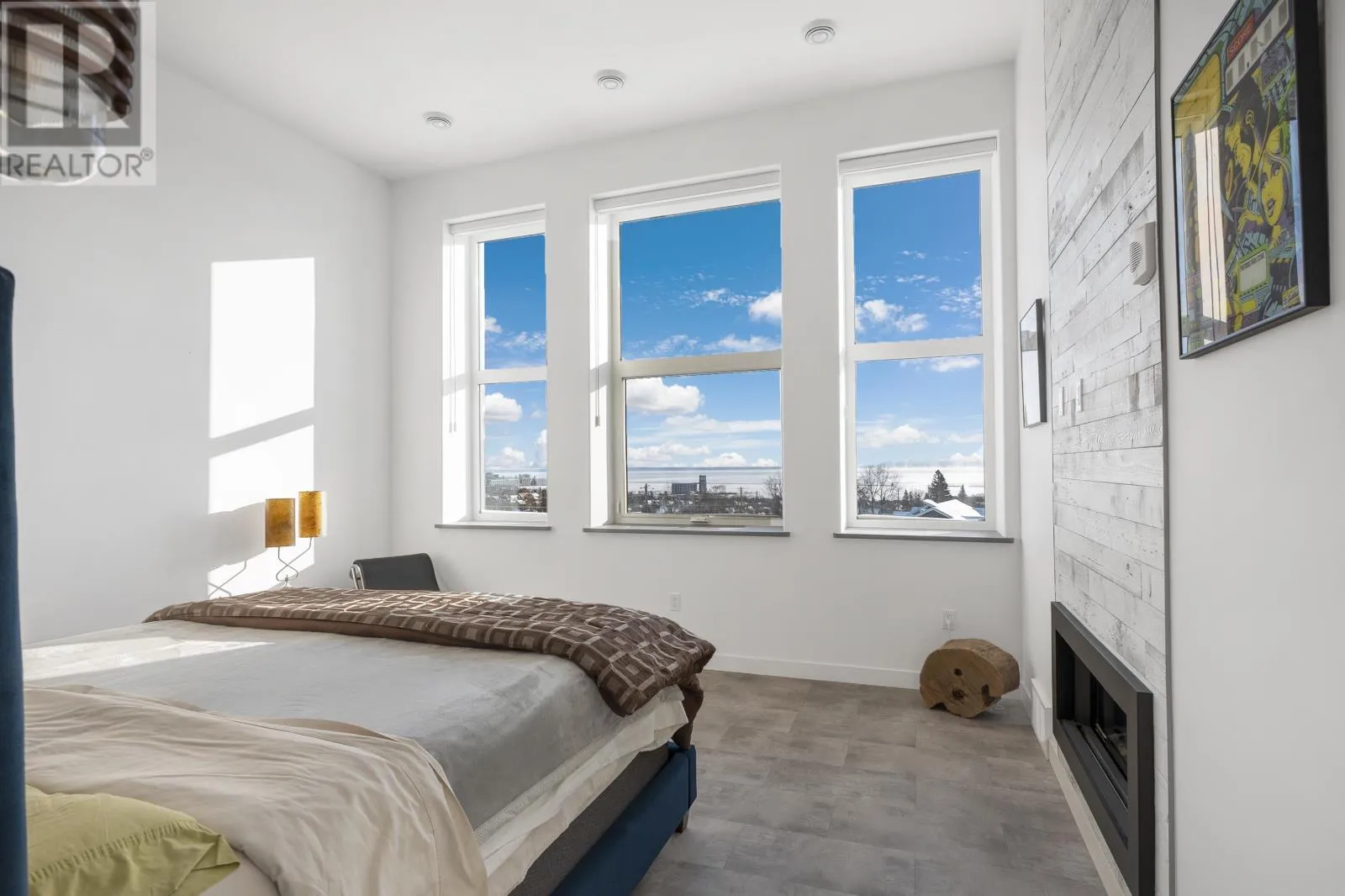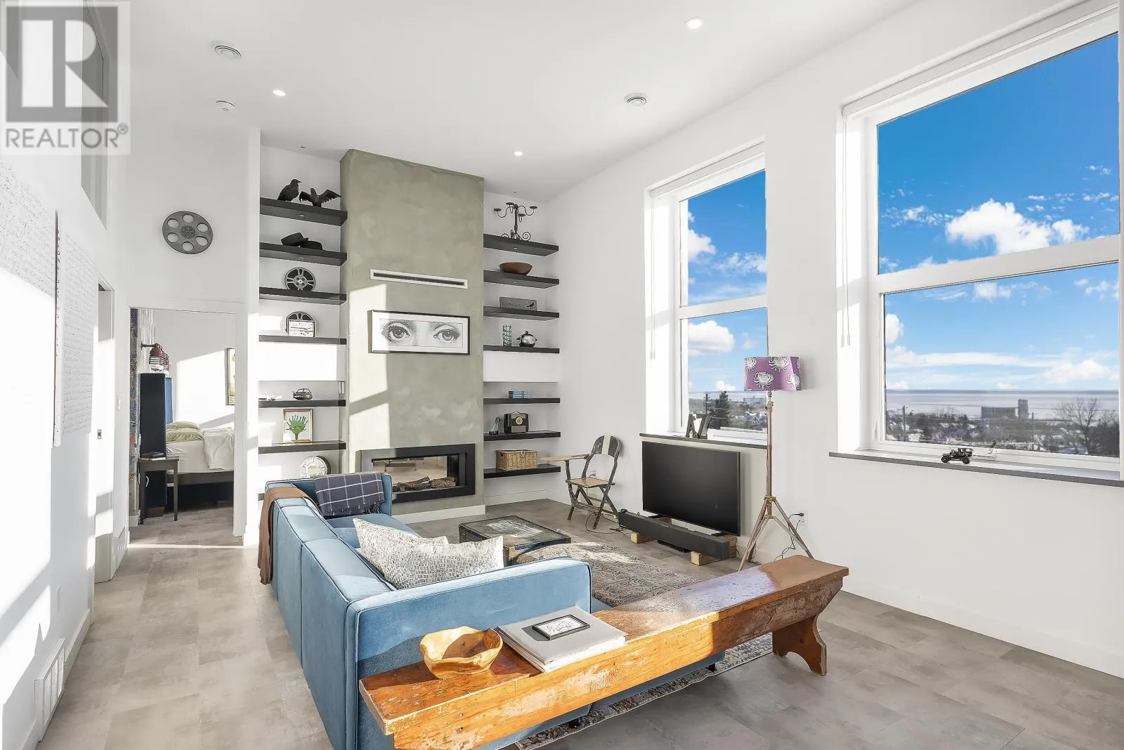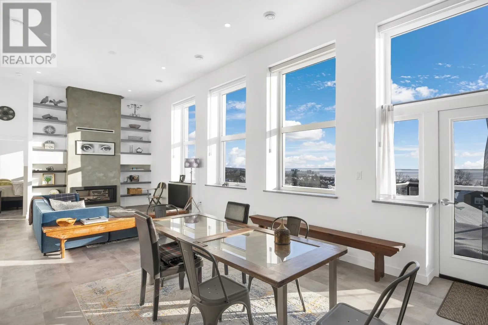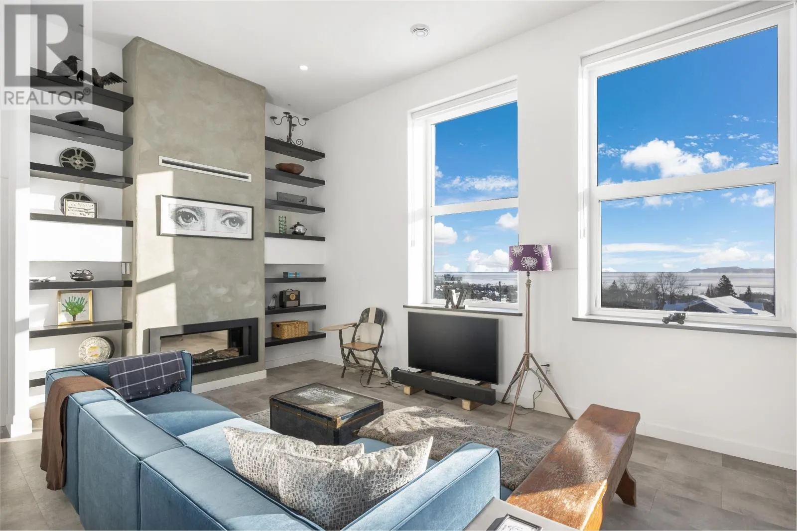 Hillcrest Condos An exceptional top-floor condo offering what is widely considered the best view in the building, perfectly centered to capture breathtaking vistas of the Sleeping Giant and Lake Superior. This outstanding residence features 1,530 square feet of beautifully designed living space with impressive 12-foot high ceilings and an open, light-filled layout. The condo includes two spacious bedrooms and two full bathrooms, highlighted by an exceptional primary suite that flows seamlessly through dual walk-in closets into a spa-inspired ensuite with double sinks, a soaking tub, a walk-in shower, and in-suite laundry. The living and dining areas are anchored by a striking two-sided gas fireplace, creating warmth and elegance throughout the space. Step onto the balcony to enjoy uninterrupted lake views and spectacular sunsets over Lake Superior. Completing this rare offering is a private garage measuring approximately 28â x 10â, potentially to accommodate 2 small cars, and is great for bike storage, shelving and recycling, adding both convenience and exceptional value. Truly the premier condo in the building, combining superior views, thoughtful design, and refined living in one of Thunder Bayâs most sought-after settings. (id:27476)