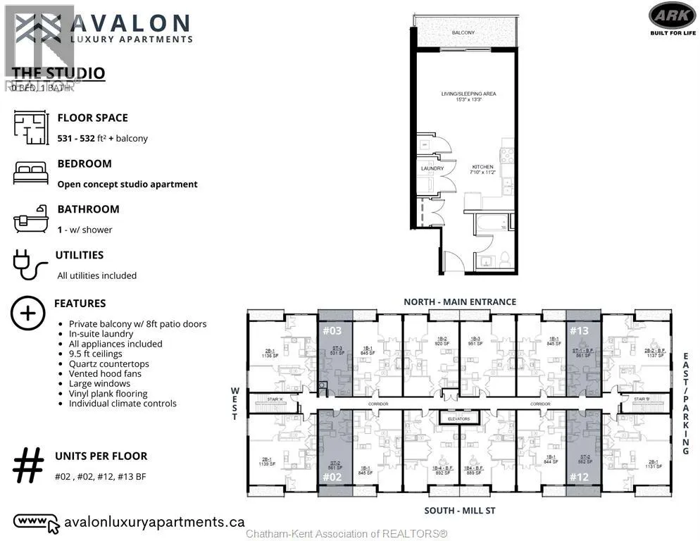 Now Leasing! The Avalon Apartments in Tilbury, a brand new purpose built 5 storey apartment building. Locally owned and operated and built with local trades. This studio apartment is a great choice for someone looking to rent in a new, clean, safe building with fixed costs. Bright and spacious with 9.5 ft ceilings, oversized windows and 8ft tall sliding patio doors. Whirlpool gold appliances throughout, including in-unit laundry. Well appointed kitchen with quartz countertops, double stainless undermount sink, lower pull-outs and extra upper cabinets. Large 3 pc bathroom with walk-in shower. Utilities and parking are included. Contact leasing agent to arrange showing for applicants who have completed rental application. Showings during weekday hours only. Tenant responsible for fee for background/credit check prior to landlord review of application. (id:27476)
