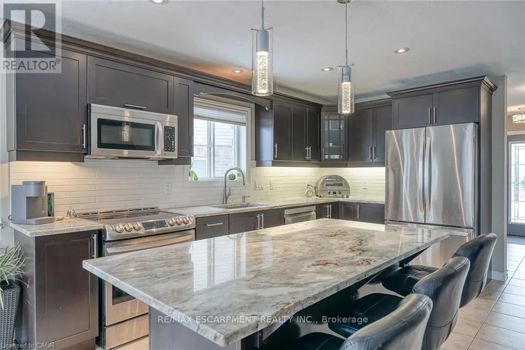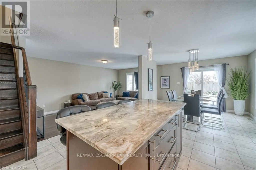 Cross Streets: Quartertown Line. ** Directions: HWY 19 Tillsonburg - Quartertown Line - Landgrell Avenue. 32 Langrell Avenue Situated on a private pie-shaped lot with an extended driveway, this move-in ready home offers over 2,000 square feet of above-grade living space, plus a fully finished basement. The property includes five bedrooms and two and a half bathrooms. The main floor features an open-concept layout with laminate and tile flooring, updated lighting, and large windows providing natural light. The living room and a convenient powder room complete this level. The kitchen is equipped with stainless steel appliances, quartz countertops, a subway tile backsplash, and an island with seating for four. Upstairs includes a family room with access to a covered balcony, a primary bedroom with a walk-in closet and 4-piece ensuite, two additional bedrooms, and another full bathroom. The finished basement includes two bedrooms, a recreation area, and a large laundry room, offering flexible use for guests, office space, or storage. The backyard is fully fenced and features a concrete patio, landscaped areas, and no rear neighbor's. Located in a family-oriented neighbourhood, the property provides proximity to schools, parks, shopping, and quick access to Highway 401. (id:27476)