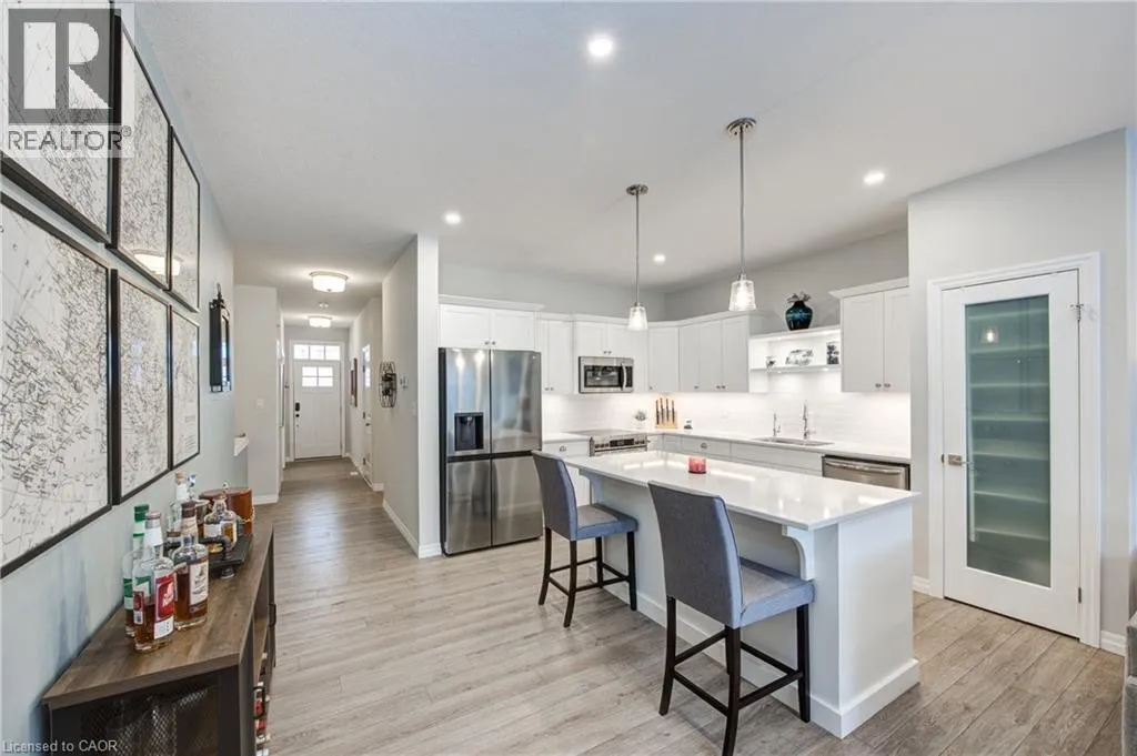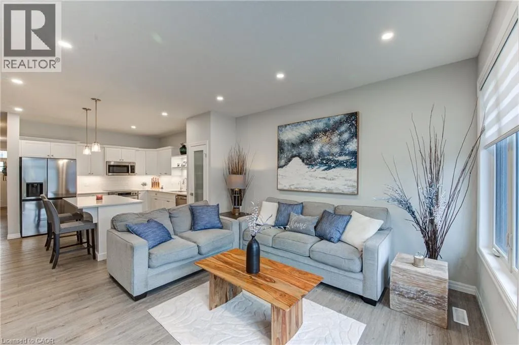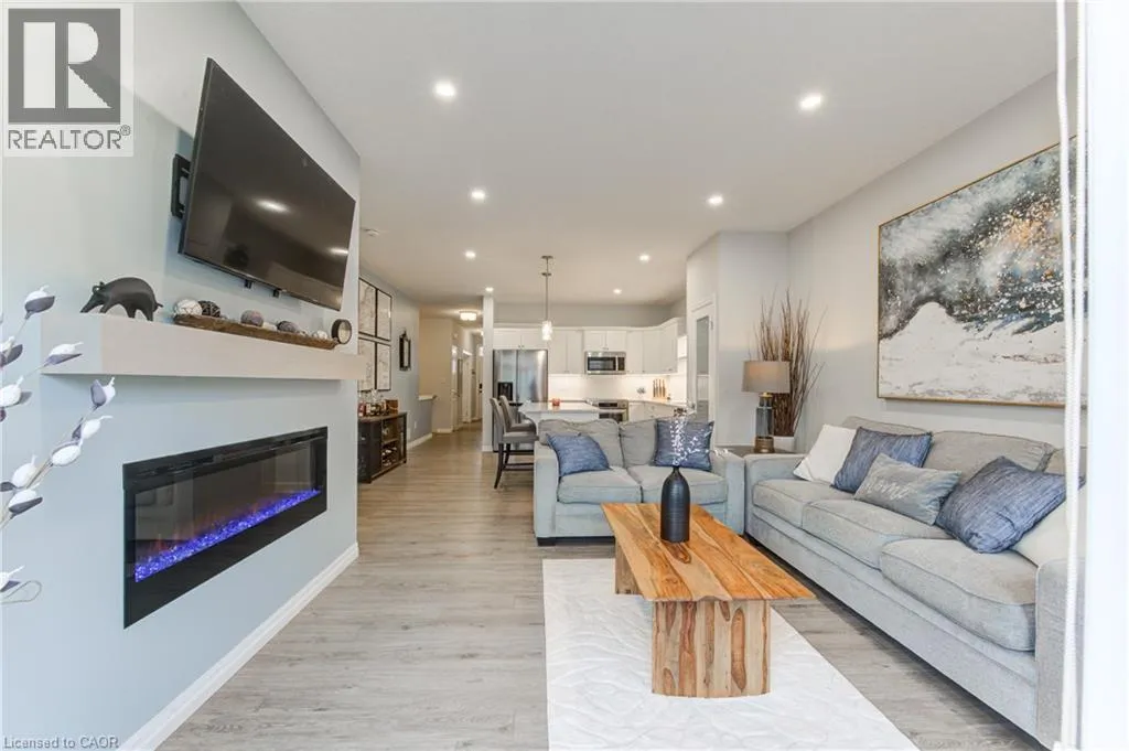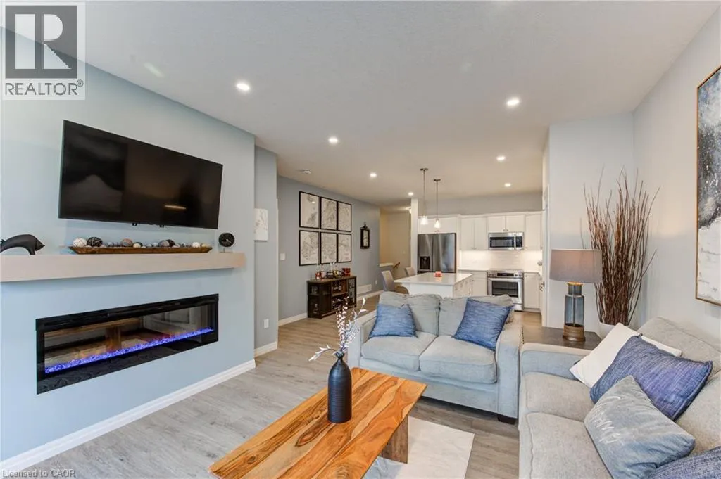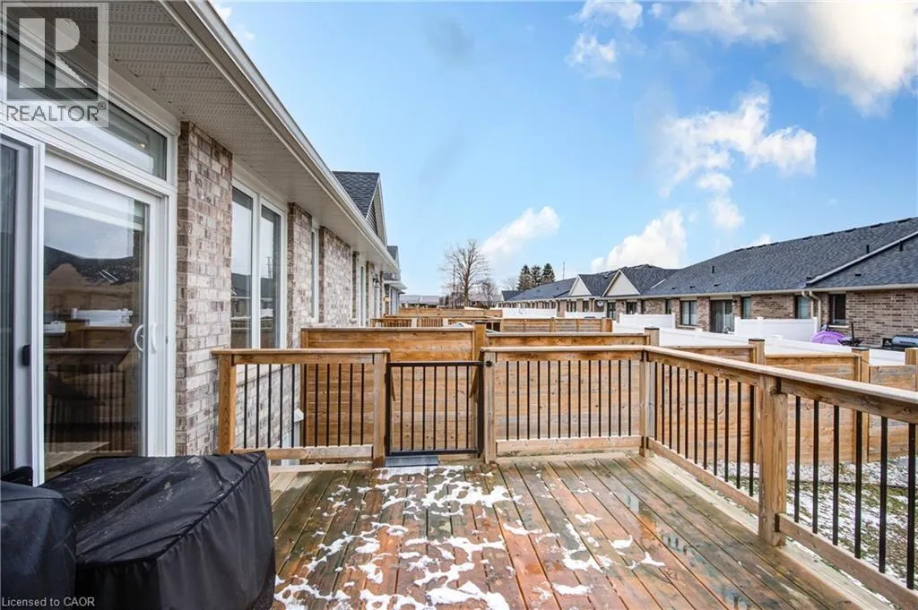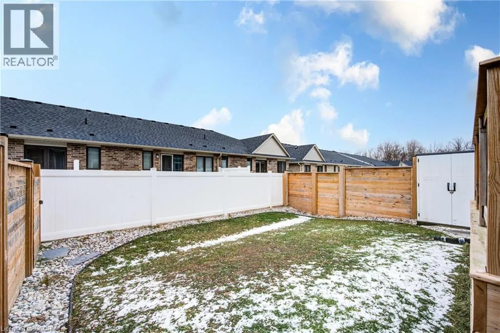 Broadway Street North, take North Street East, turn right (south) onto Coulthard Street, left onto Livingston Drive. Built by award-winning Hayhoe Homes, this meticulously maintained freehold bungalow townhome offers stylish, low-maintenance living with no condo fees. The open-concept main floor features laminate flooring, quartz countertops, a large kitchen island with seating, tile backsplash, pantry, main-floor laundry, and a bright living area with an electric fireplace featuring adjustable LED flame colours. Patio doors lead to a fully fenced back deck, ideal for outdoor entertaining. The main level includes two bedrooms and two bathrooms, including a spacious primary suite with a four-piece ensuite, large double closets, and blackout blinds. The front room offers flexibility as a bedroom, home office, or den. Window blinds are installed throughout the upper level. The fully finished lower level offers a generous recreation room, third bedroom, four-piece bathroom, and ample storageâperfect for guests or extended family. Enjoy a fully fenced, dog-proof backyard with landscaped perennial gardens, stone accents, a custom gate off the deck, gas BBQ hookup, and a professionally installed storage shed. The attached garage measures 19'1 x 10'10. Parking for three vehicles is provided with one garage space and two driveway spaces, freshly coated and sealed. Additional features include quality appliances, water softener, kitchen water filtration, Lifebreath air exchanger, and optional chest freezer. Located in a desirable neighbourhood close to schools, parks, shopping, restaurants, and Highway 401 access, with an easy drive to London, Woodstock, and Lake Erie beaches. A beautifully maintained, move-in-ready home offering exceptional value and convenienceâwith no condo fees. (id:27476)