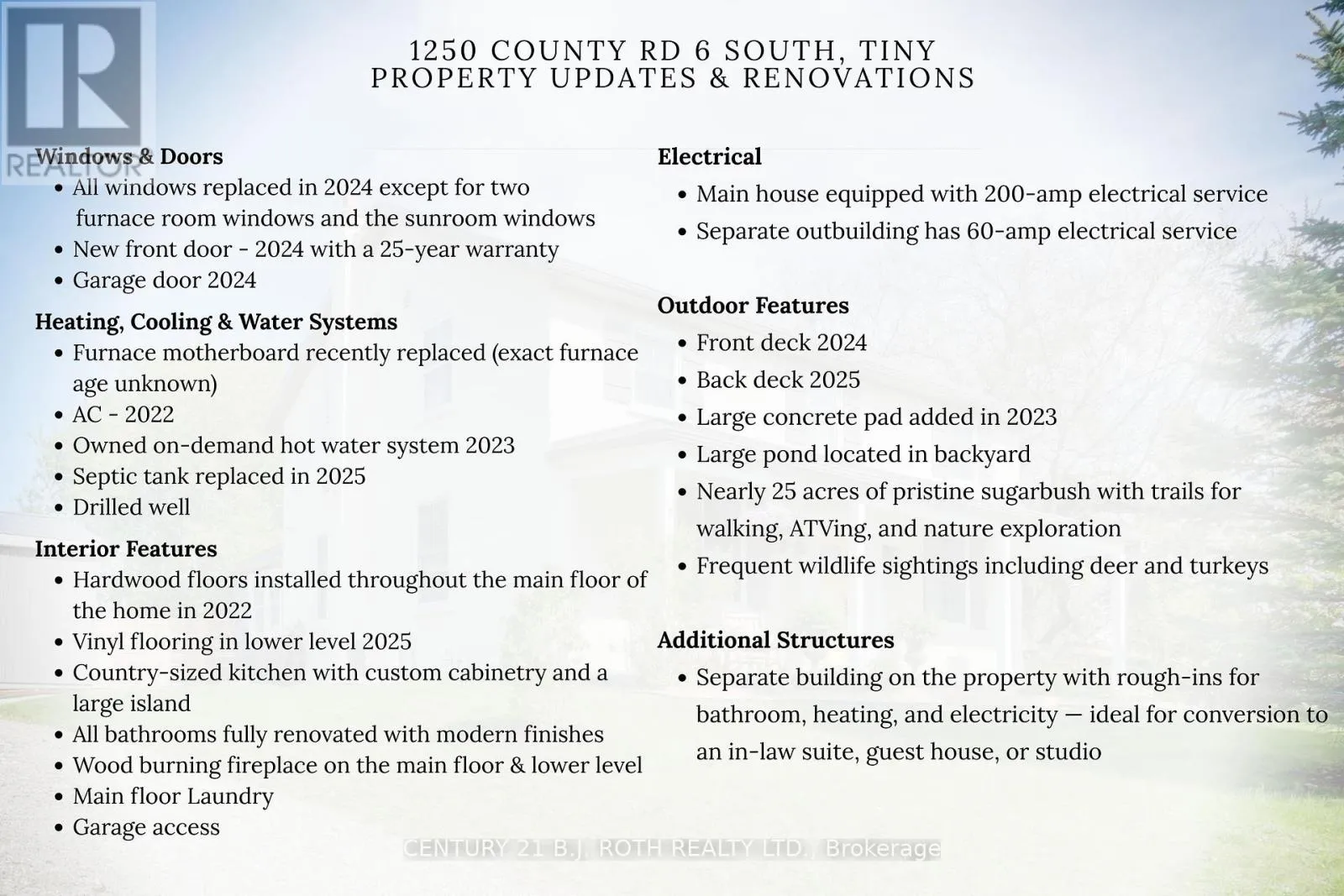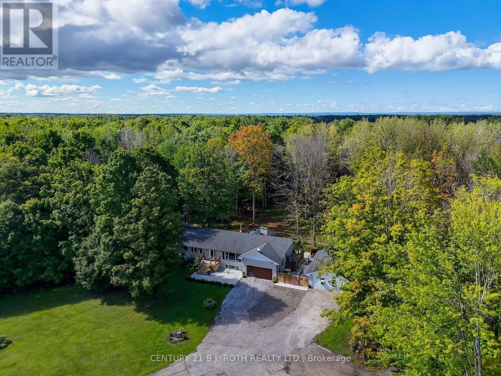 Cross Streets: Concession Rd 3 and Country Rd 6. ** Directions: Hwy 27 to Country Rd 6. Welcome to your own private country escape! A beautifully renovated home set on nearly 25 acres of pristine sugarbush, complete with scenic trails for walking, ATVing, and enjoying the peaceful beauty of nature. This property offers the perfect blend of modern comfort and rustic charm, ideal for those seeking space, tranquility, and a move-in ready lifestyle. This beautifully renovated 3-bedroom, 3-bath home has been thoughtfully updated from top to bottom with quality finishes throughout. Inside, you'll find hardwood floors (2022) that run seamlessly across the main level, a spacious custom kitchen with a large island ideal for family gatherings and entertaining, and gorgeously renovated bathrooms that add a touch of luxury. The windows were replaced in 2024 (excluding furnace room & sunroom), front door installed in 2025 (25-year warranty). Main floor laundry offers everyday convenience, while the fully finished lower level features a massive rec room and a stunning bathroom, providing even more comfortable and versatile living space. New AC in 2022, on-demand hot water system added in 2023, septic replaced in 2025. Outdoor features are just as impressive with the front deck (2024), back deck (2025), a large concrete pad was also added in 2023, offering endless potential for outdoor entertainment or future use. The backyard features a picturesque pond and regular visits from deer, turkeys, and other wildlife, adding to the serene country atmosphere. The main house is equipped with a 200-amp electrical service. As an added bonus, there's a separate building on the property with rough-ins for a bathroom. It has its own 60-amp electrical service and offers excellent potential for conversion into an in-law suite, guest house, workshop, or studio. (id:27476)