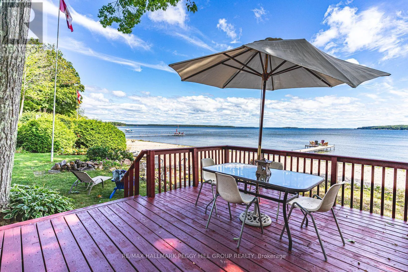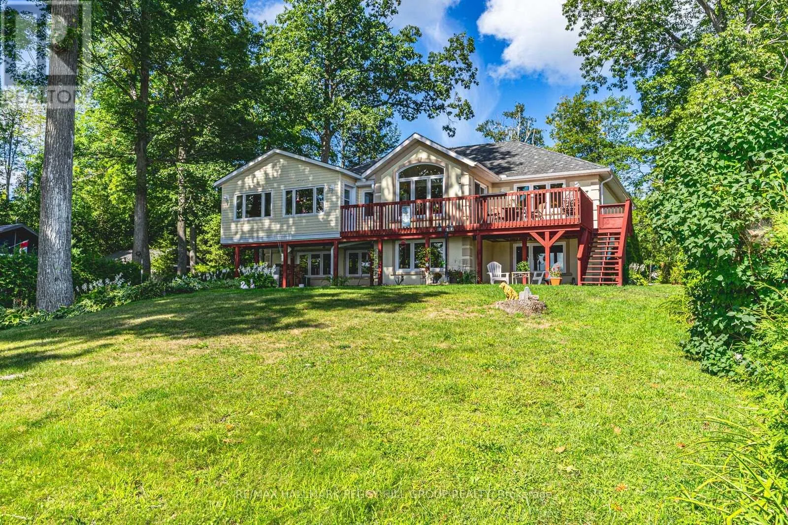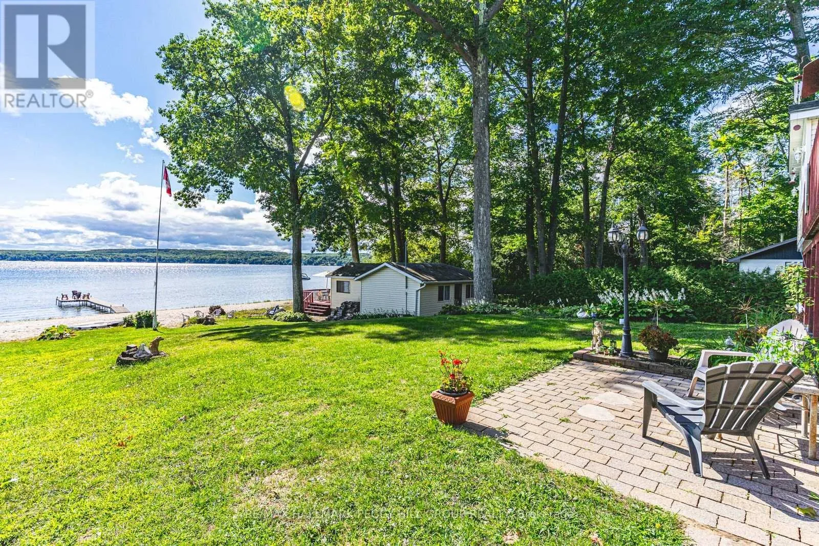 Cross Streets: Champlain Rd/Peek-A-Boo Trl. ** Directions: Concession Rd 16 E/Champlain Rd/Peek-A-Boo Trl. LUXURIOUS GEORGIAN BAY ESTATE WITH 83 FT OF SANDY SHORELINE, SECOND COTTAGE, DETACHED GARAGE & ALMOST HALF AN ACRE! 83 feet of Georgian Bay frontage with eastern exposure presents a private sandy beach with gradual entry, clear waters, and sunrise views that define the waterfront lifestyle. Set on nearly half an acre with a large back deck, the property is further enhanced by an expansive L-shaped dock with a bump-out that extends into the bay, offering an impressive setting for entertaining, lounging, and docking motorcraft. Located on a coveted cul-de-sac along sought-after Peek-A-Boo Trail and just steps from Tee Pee Point Park, the property delivers exclusivity and tranquillity while remaining approximately 10 minutes to local essentials and a short drive to Penetanguishene and Midland for expanded amenities. The primary residence introduces itself with a stately front entry, covered porch, manicured landscaping, and a detached two-car garage with six-car driveway parking. The kitchen is appointed with rich wood cabinetry topped with crown, granite counters, stainless steel appliances, and a built-in desk area. The living room features a bay window, crown moulding, fireplace, and French doors, while the spectacular sunroom boasts soaring ceilings, shiplap accents, pot lights, a dramatic fireplace, and a walkout. The primary bedroom highlights its own walkout to the sunroom, a walk-in closet, and a spa-like 6-piece ensuite. Extending the living space, the finished walkout basement showcases a massive rec room with a third fireplace, pot lights, and room for a pool table, along with a fourth bedroom and full bath, with the entire level opening directly to the yard and waterfront. A versatile second cottage with two bedrooms, a bathroom, a kitchen and a living area, and a private deck enhances the property's functionality for family and guests, while main floor laundry, in-floor radiant heating, central vac, and ERV/HRV systems add to the overall comfort. (id:27476)