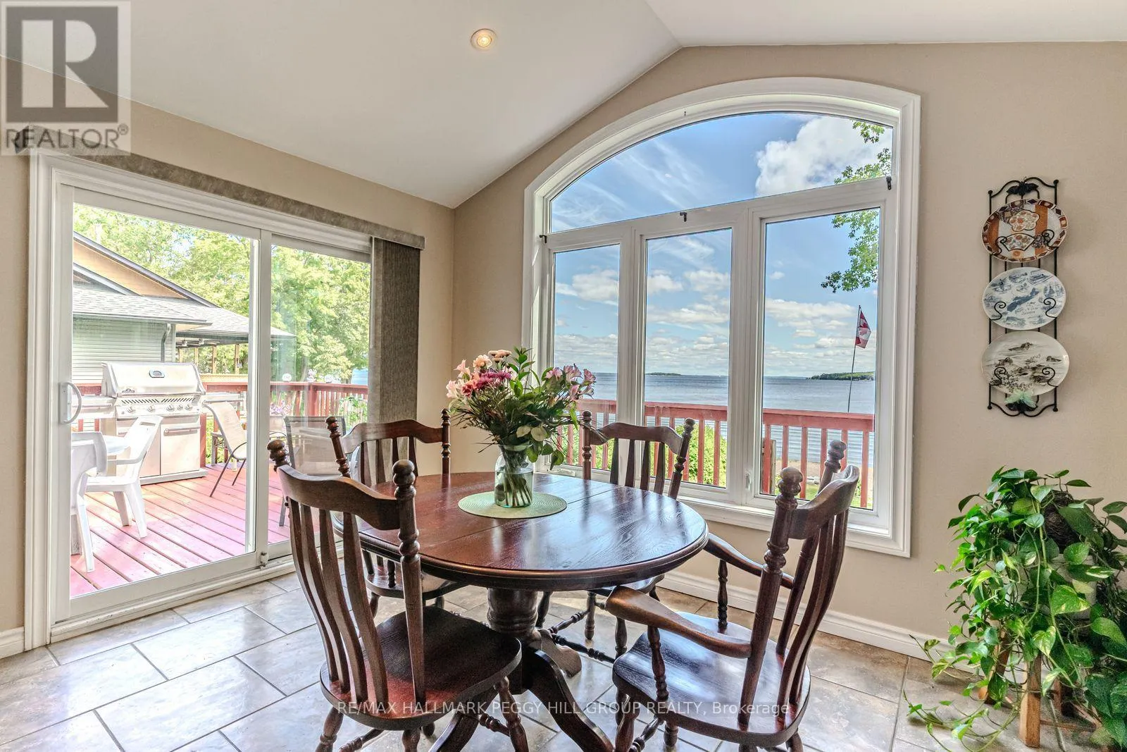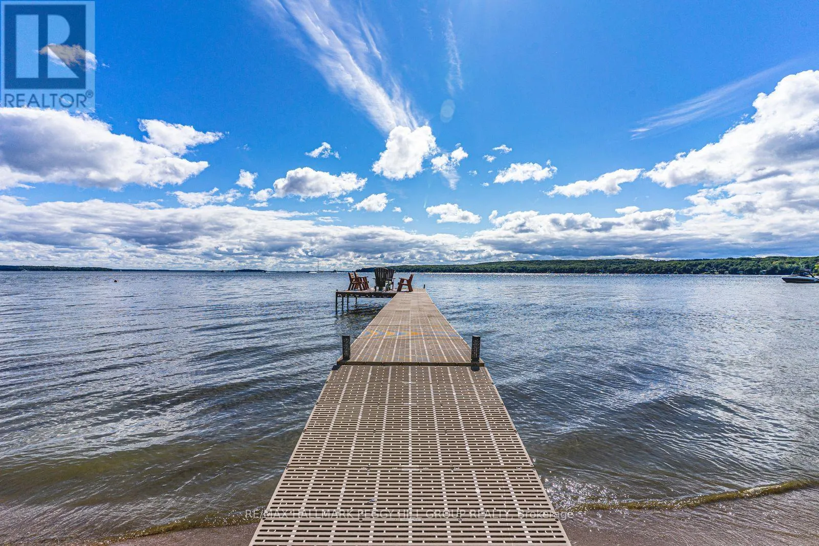 Cross Streets: Champlain Rd/Peek-A-Boo Trl. ** Directions: Concession Rd 16 E/Champlain Rd/Peek-A-Boo Trl. LUXURIOUS GEORGIAN BAY ESTATE WITH 83 FT OF SANDY SHORELINE, SECOND COTTAGE, DETACHED GARAGE & ALMOST HALF AN ACRE! 83 feet of Georgian Bay frontage with eastern exposure presents a private sandy beach with gradual entry, clear waters, and sunrise views that define the waterfront lifestyle. Set on nearly half an acre with a large back deck, the property is further enhanced by an expansive L-shaped dock with a bump-out that extends into the bay, offering an impressive setting for entertaining, lounging, and docking motorcraft. Located on a coveted cul-de-sac along sought-after Peek-A-Boo Trail and just steps from Tee Pee Point Park, the property delivers exclusivity and tranquillity while remaining approximately 10 minutes to local essentials and a short drive to Penetanguishene and Midland for expanded amenities. The primary residence introduces itself with a stately front entry, covered porch, manicured landscaping, and a detached two-car garage with six-car driveway parking. The kitchen is appointed with rich wood cabinetry topped with crown, granite counters, stainless steel appliances, and a built-in desk area. The living room features a bay window, crown moulding, fireplace, and French doors, while the spectacular sunroom boasts soaring ceilings, shiplap accents, pot lights, a dramatic fireplace, and a walkout. The primary bedroom highlights its own walkout to the sunroom, a walk-in closet, and a spa-like 6-piece ensuite. Extending the living space, the finished walkout basement showcases a massive rec room with a third fireplace, pot lights, and room for a pool table, along with a fourth bedroom and full bath, with the entire level opening directly to the yard and waterfront. A versatile second cottage with two bedrooms, a bathroom, a kitchen and a living area, and a private deck enhances the property's functionality for family and guests, while main floor laundry, in-floor radiant heating, central vac, and ERV/HRV systems add to the overall comfort. (id:27476)