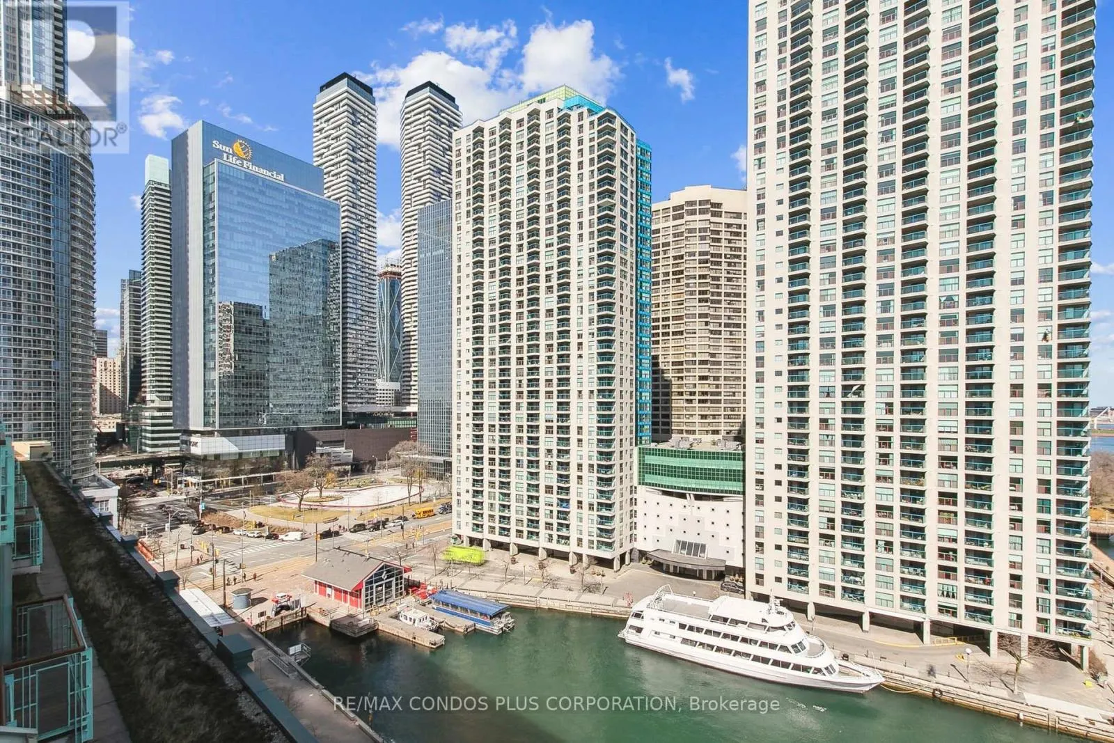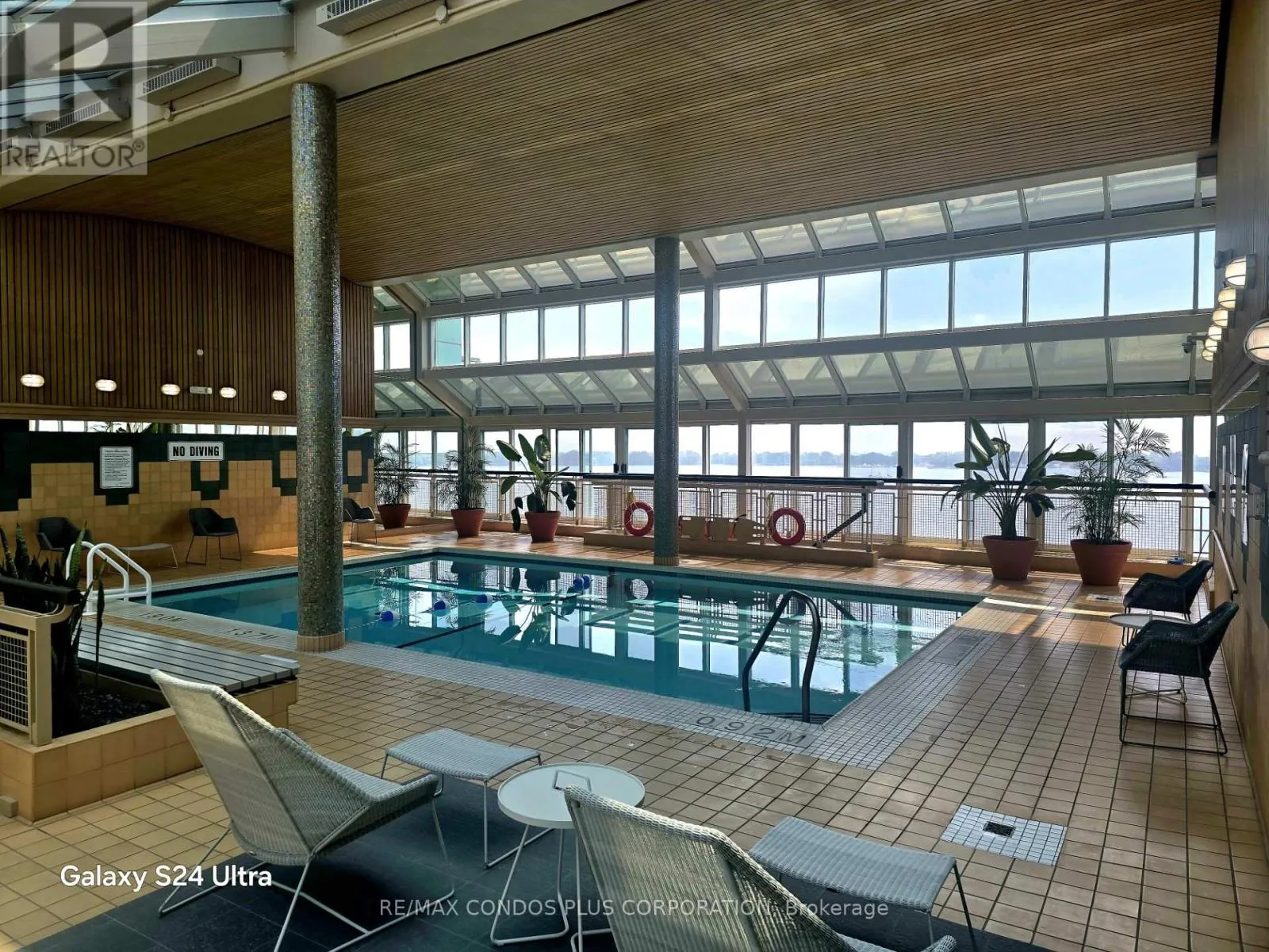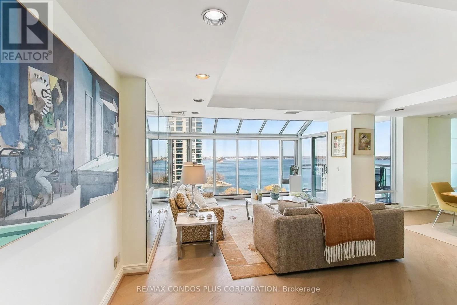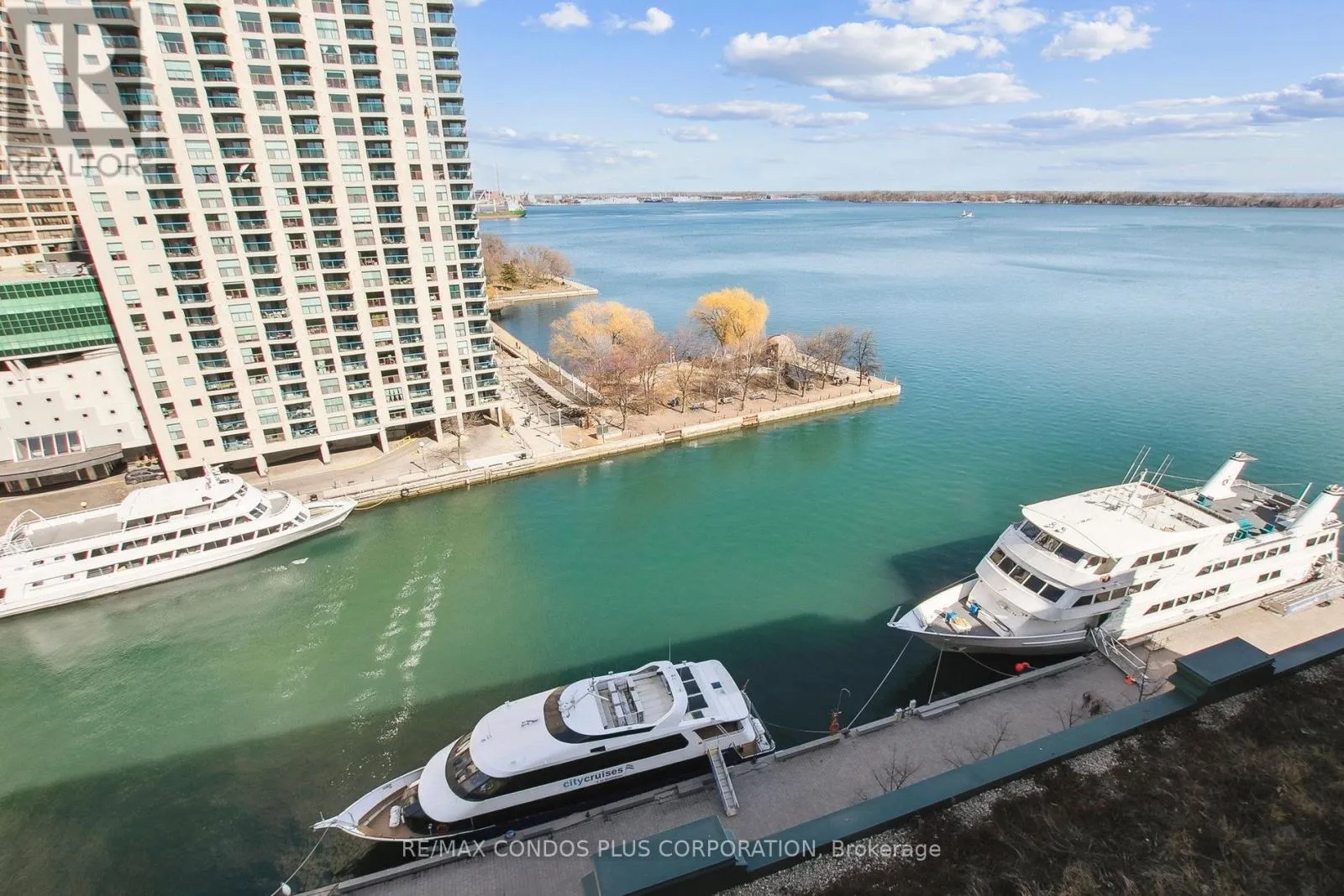 QUEENS QUAY + YORK Two bedroom plus den, over 2000 sq ft of spacious and lovely light filled layout in Prestigious Boutique Building (Queens Quay Terminal). Unit has captivating lake views, functional and well designed layout with generous room sizes. Private balcony overlooks scenic lake views and backdrop of Love Pond in newly built city park. Large size locker and parking in heated garage included. Valet parking, 24 hr. concierge, indoor pool with south facing sundeck overlooking harbour and sauna. Restaurants, barber shop and grocery store located in the building, below condo units. Can easily function as three bedroom. (id:27476)