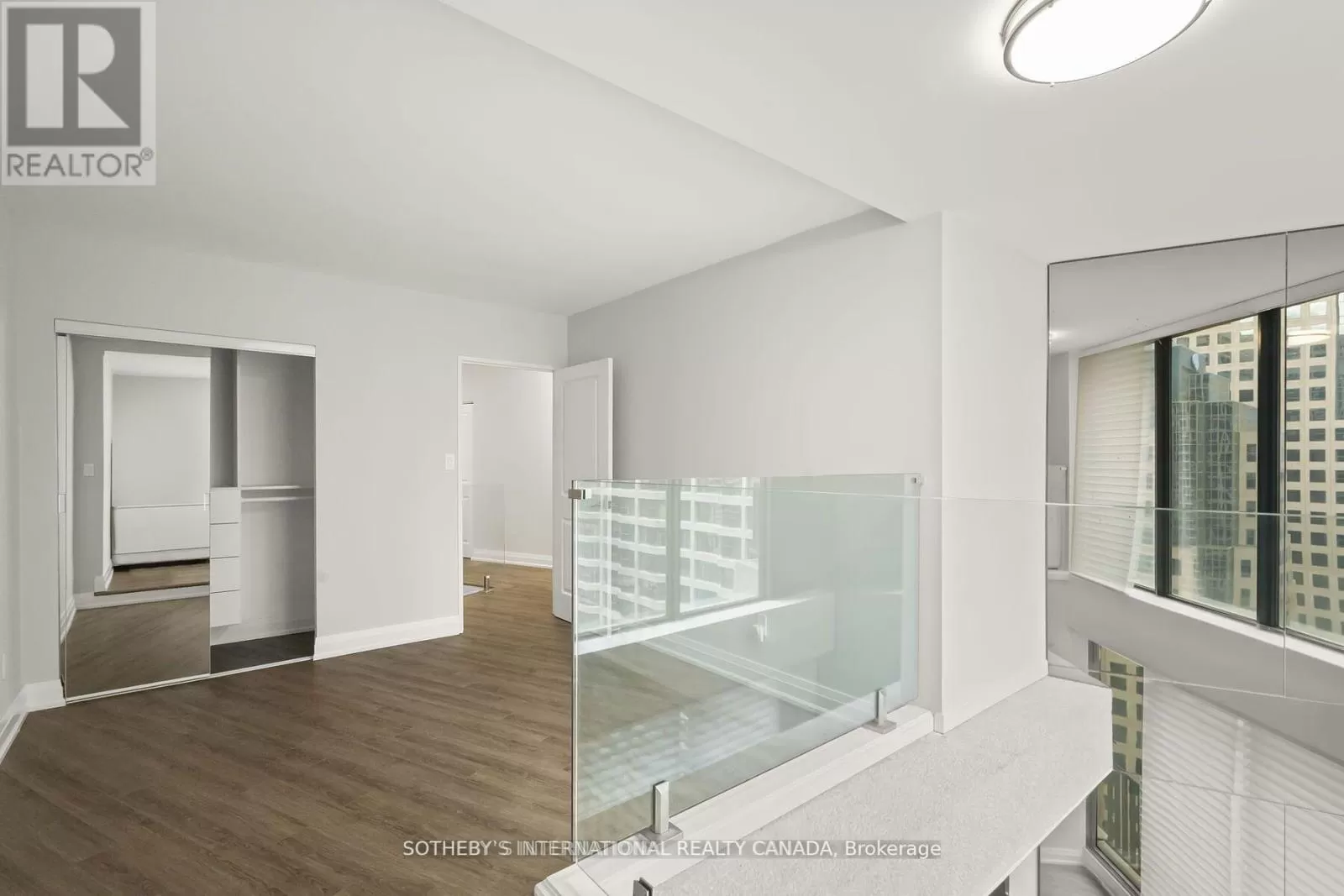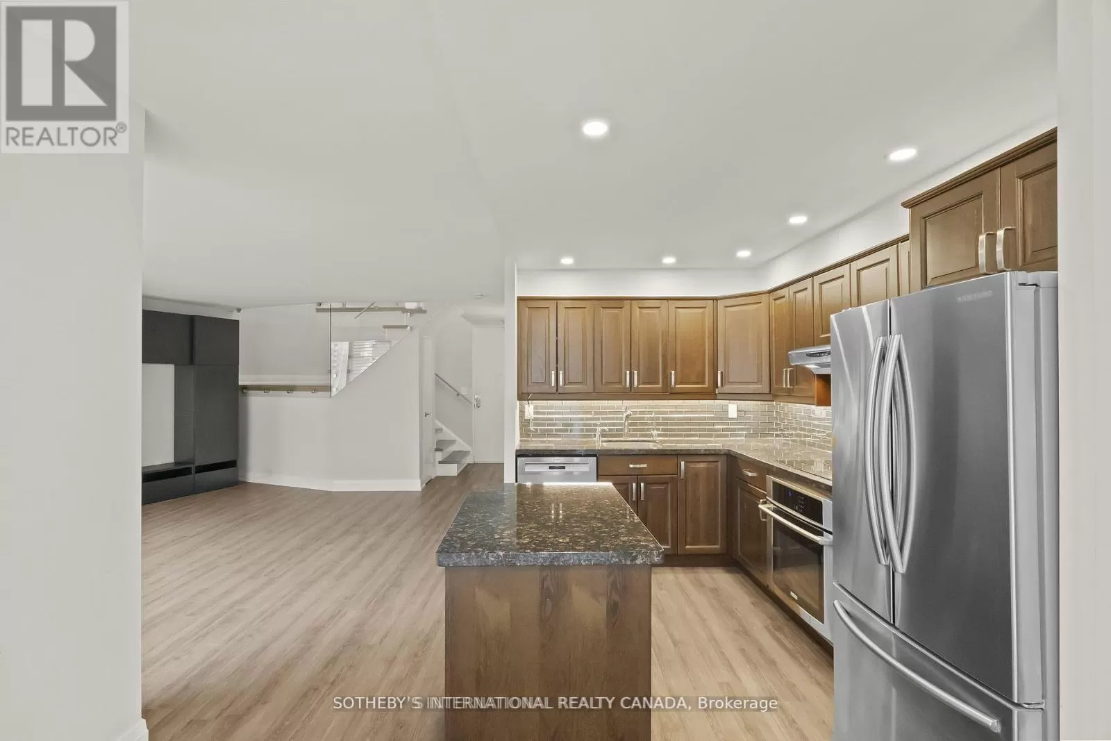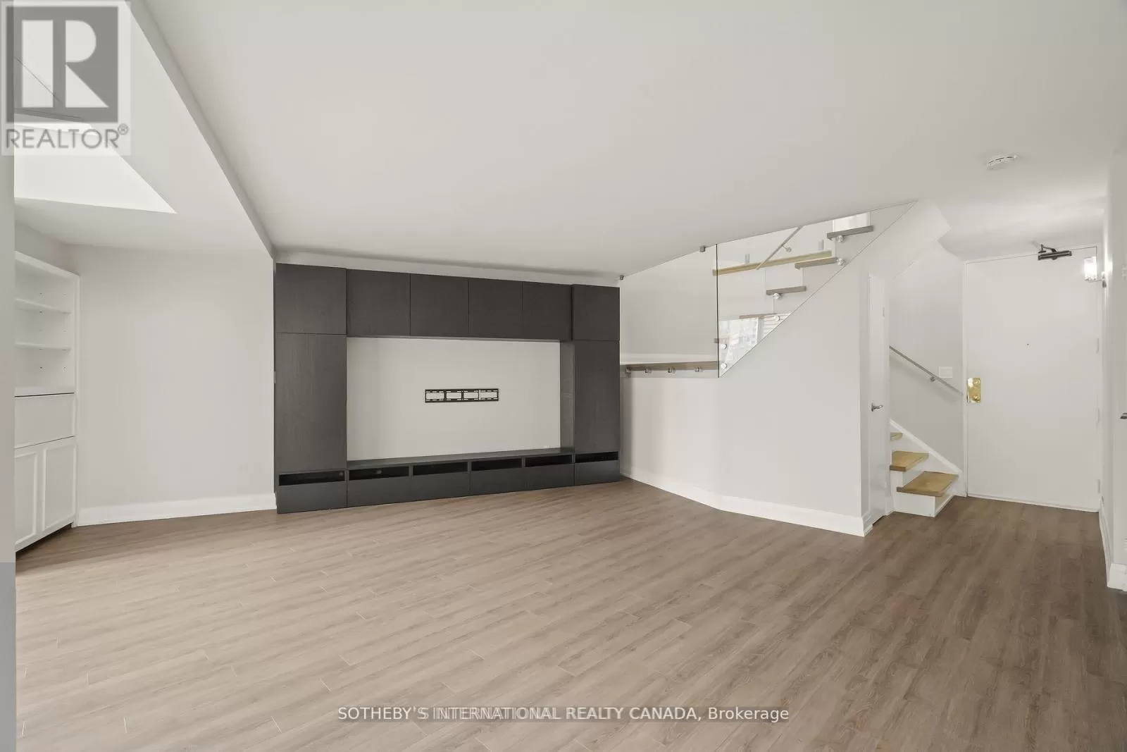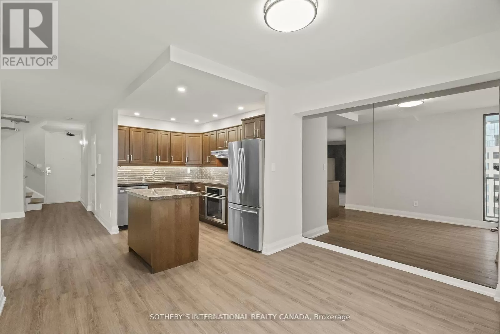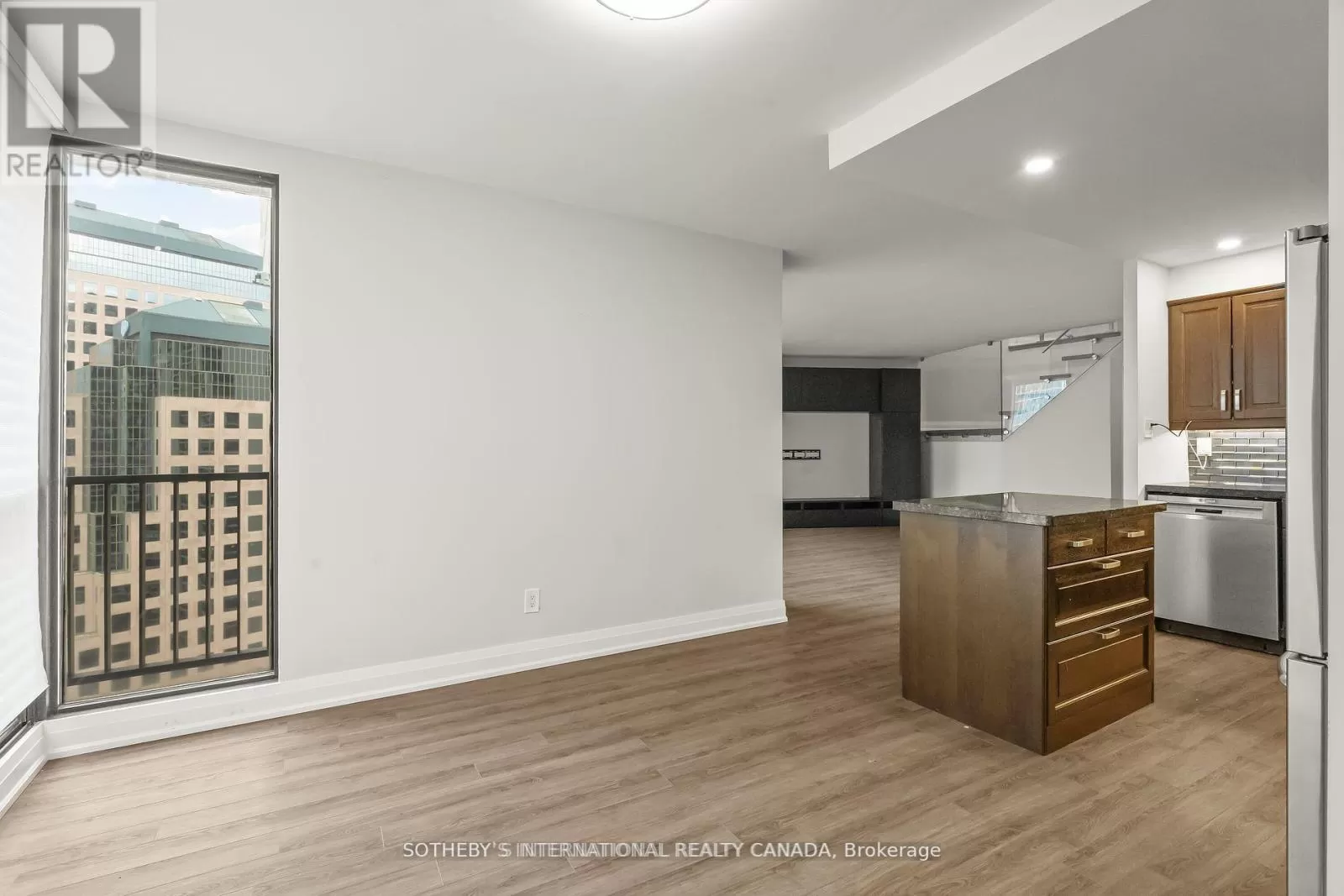 Queens Quay / Bay Immerse yourself in spectacular waterfront luxury living at Harbour Square with this two-storey, quality-updated and redesigned suite spanning approximately 1500 sq ft. The stunning stainless steel and glass staircase welcomes you into a space where modern elegance meets functionality. Enjoy the seamless blend of design and technology, 2 1/2 baths, ensuite laundry in 2pc guest bathroom, and an eat-in kitchen equipped with high-end appliances. Revel in the convenience of smartphone-operable remote blinds and Lutron lighting, while recessed lighting in the kitchen adds a touch of sophistication. Luxury vinyl flooring flows throughout, complemented by extra storage cleverly tucked under the staircase. Get a restful nights sleep in the Primary suite offering a large closet with built-ins and a spa-like 3pc ensuite bath. There is a second floor open-concept study/den, 2nd bedroom with large closet with organizers, large broom closet and linen closet and 4pc bath. Capture beautiful northwest city views from the comfort of your home. Elevate your lifestyle with this meticulously crafted residence that redefines contemporary urban living on the waterfront. Excellent building amenities include Party Room, fully equipped Gym, Indoor Pool on 35th floor, and Concierge Services. (id:27476)