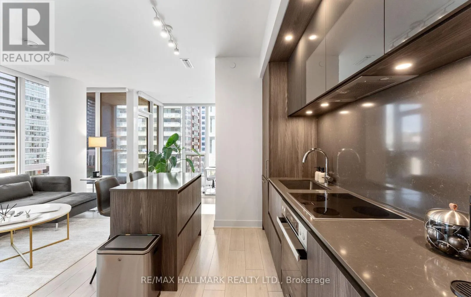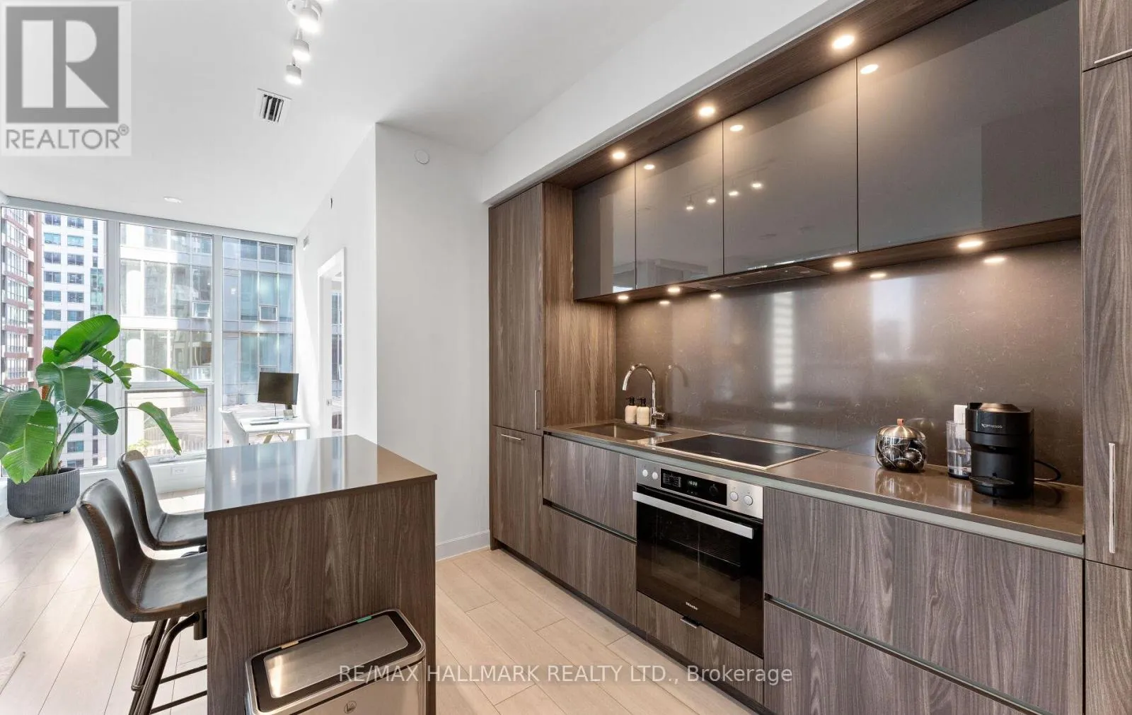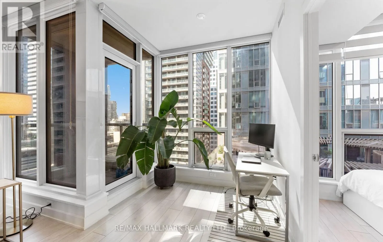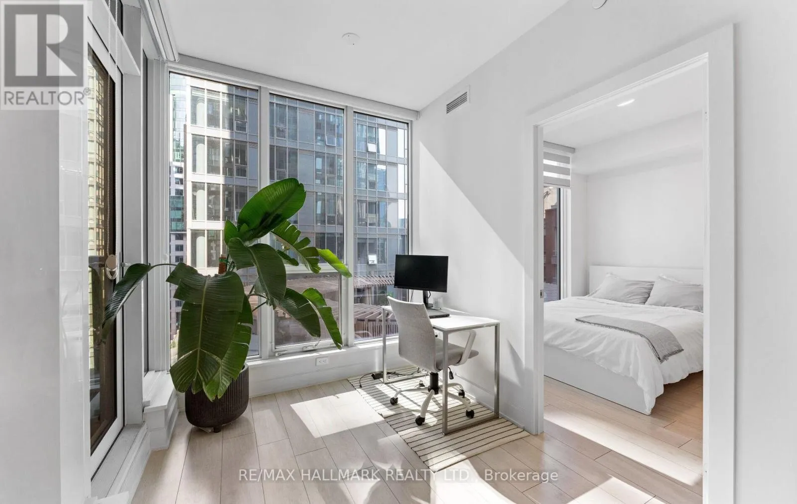 King St W & Blue Jays Way Welcome to the prestigious Nobu Residences, where world-class luxury meets urban sophistication in the heart of Torontos vibrant Entertainment District. This rare 2-bedroom + den, 2-bathroom corner suite offers an exceptional 756 sq. ft. of beautifully designed interior space, complemented by a 28 sq. ft. balcony with breathtaking city views. Soaring 9-foot ceilings, floor-to-ceiling windows, and rich laminate flooring create a light-filled, expansive atmosphere, while the open-concept layout seamlessly connects living, dining, and entertaining spaces. The gourmet kitchen is a chefs dream, complete with integrated Miele appliances, quartz countertops, and a matching backsplash. The spa-inspired bathrooms are adorned with elegant finishes, and the primary suite features a designer ensuite and custom closet organizers. The versatile den offers endless possibilities as a home office, guest room, or reading lounge. Residents enjoy access to five-star amenities including a state-of-the-art fitness centre, hot tub, sauna, yoga studio, private dining, screening room, and the exclusive Nobu Villa terrace. With the iconic NOBU restaurant on-site, and mere steps to the subway, PATH, CN Tower, Rogers Centre, and the Financial District, this is truly elevated urban living at its finest. Dont miss the opportunity to call this architectural masterpiece home. (id:27476)