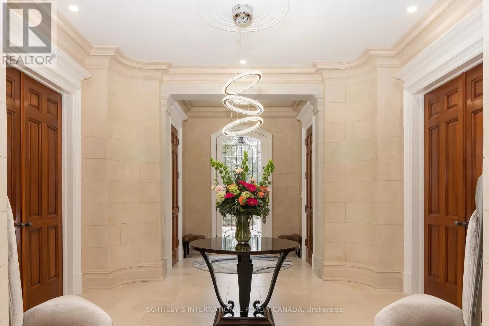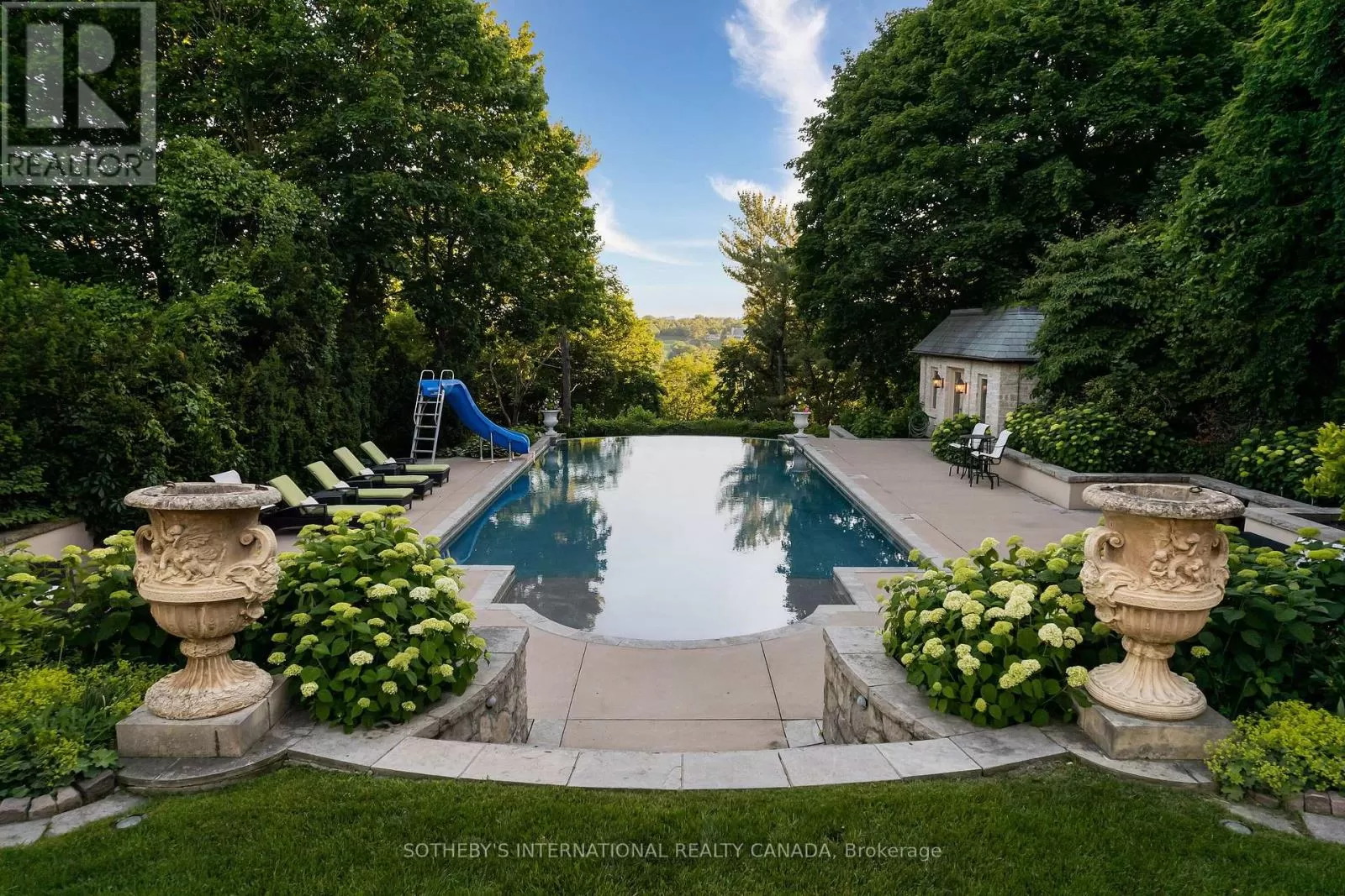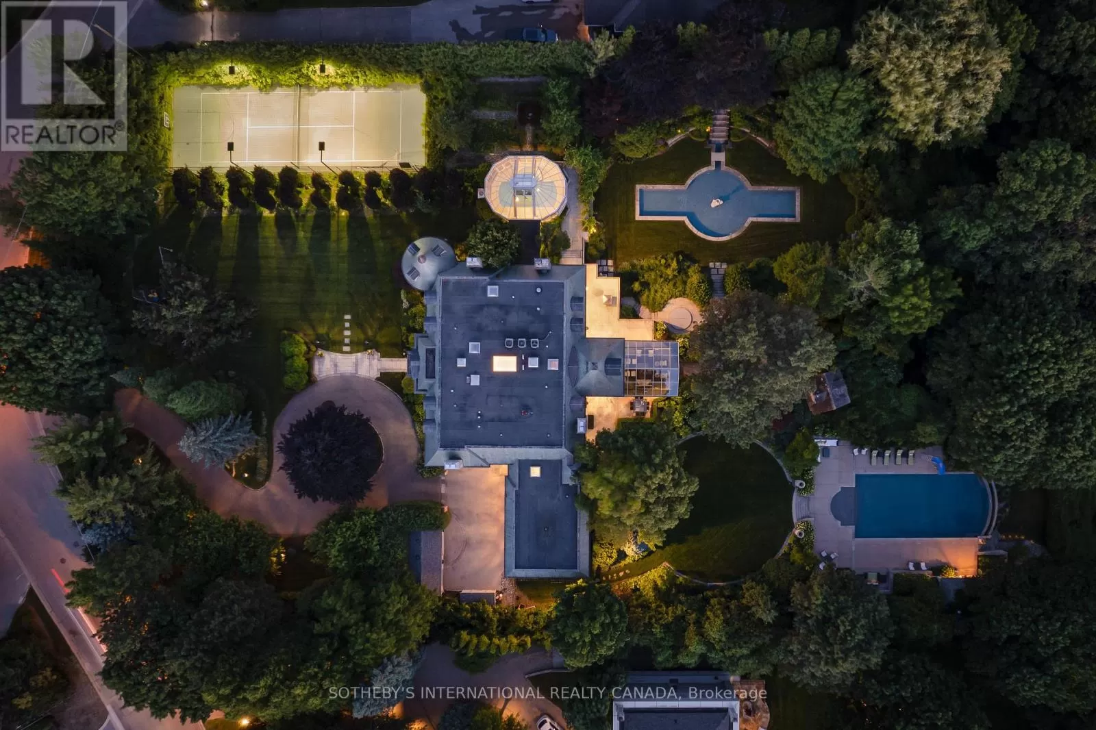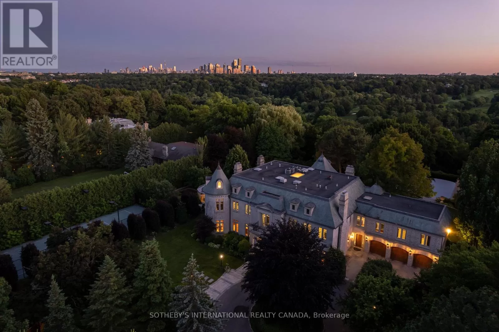 Cross Streets: Bayview And York Mills. ** Directions: Follow your GPS. Arguably one of Torontos most iconic estates, this French-style château is an extraordinary expression of European grandeur on a 3.12-acre double lot in the prestigious enclave of Bayview Ridge. Designed by renowned architect Gordon Ridgely, the residence commands unobstructed western views over the Rosedale Golf Club. Beyond the stately stone gates and circular drive, manicured gardens by Ron Holbrook frame a breathtaking setting featuring a negative-edge infinity pool, a reflecting pond with a stepped waterfall, tennis court, kitchen gardens, flagstone terraces, and a stone cabana. The striking façade spans nearly 150 feet, clad in Indiana buff limestone and rubble stone with Vermont unfaded green slate shingles and lead-coated copper details. An ivy-clad turret anchors the asymmetrical design, lending the home its signature silhouette. Inside, over 15,000 square feet of living space showcases Brazilian cherry wood floors with African wenge inlay, acid-etched antique Crema Marfil marble, coffered ceilings, Indiana limestone fireplaces, and solid North American cherry doors. Six principal bedrooms and two additional suites are complemented by ten baths and warm, richly detailed interiors. The main floor features an impressive library and office with wood-burning fireplace, a grand dining room with artisan-painted walls and ceilings, a conservatory beside the spacious family room, and a sunlit morning room perfect for coffee. Three staircases, including a hidden passage, lead to the lower level with a Bordeaux-inspired wine cellar, cigar room, gym, nanny suite with two bedrooms, a full kitchen, and a large recreation space. Upstairs, the primary suite offers a six-piece spa bathroom, dual dressing rooms, gas fireplace, and sweeping views. Each bedroom enjoys an ensuite bath and sitting area, blending luxury with practicality. This remarkable estate is a once-in-a-generation offering at once grand, intimate, and built to endure. (id:27476)