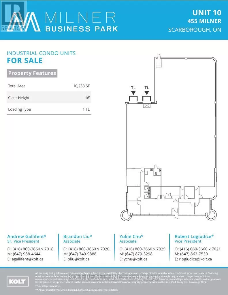 Markham Rd & Hwy 401 Welcome to Milner Business Park; Featuring this Prime industrial unit offering 10,253 sqft with 16' clear height, & 2 Truck Loading Docks, ideal for end users or investors. Great location in high demand industrial area with quick access to Hwy 401, a key benefit for logistics and transport-oriented businesses. Flexible E0.6 zoning can accommodate a wide range of industrial uses. The property's three access points streamline entry and exit, with ample parking spaces for your staff & clients. Vendor options for turnkey office build-outs & renovations, the space is easily adaptable to your needs. This industrial unit is a smart choice for operational efficiency and investment potential. Industrial Condo Unit #23 & 24, Municipal Address Unit 10 - 455 Milner Ave (id:27476)