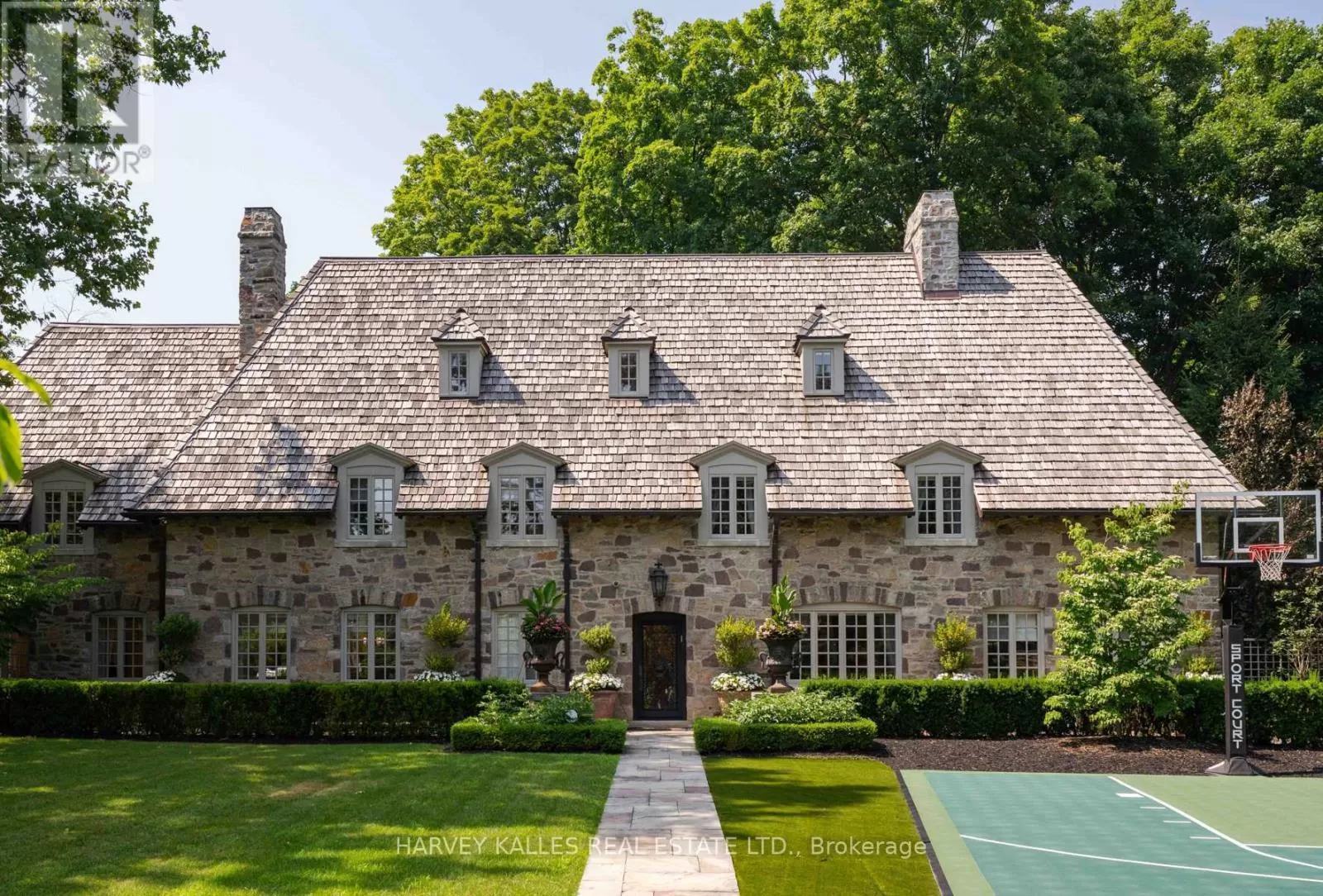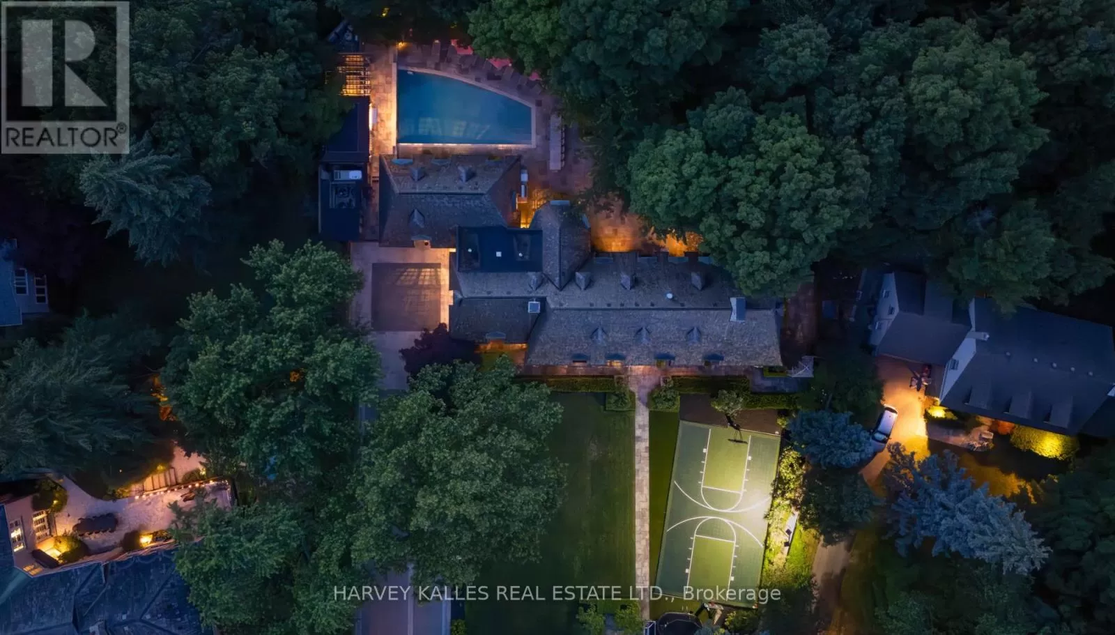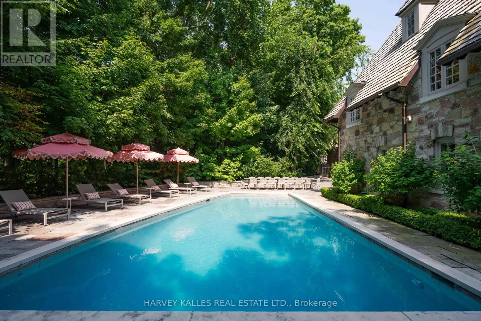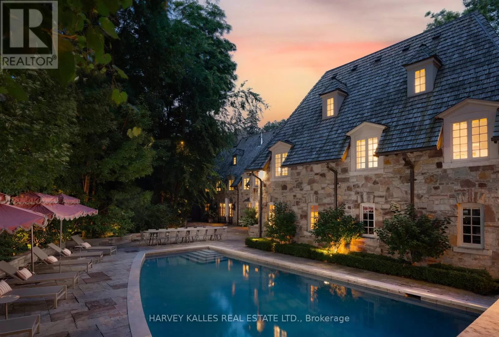 Cross Streets: Wilson Ave. ** Directions: Avenue Rd north to Bombay, east to Barwick, then north to Sandringham. "Rosewood Estate" one of city's most coveted landmark estates, sets the gold standard for luxury real estate in Toronto. Magnificently poised on a 1.18 acre private, ravine lot on a quiet cul-de-sac. Redesigned by Lorne Rose & built by JTF Custom Homes in 2019 this 11,000+ sq ft home is defined by its sophisticated style & magnificent surroundings. Superb craftsmanship, impeccable finishes & meticulous attention to the finest of materials create an exceptional living space perfect for grand entertaining yet eminently comfortable for daily living. The time-honoured principles of symmetry, proportion & balance create an ambiance of refined serenity. Crafted with a vision & passion using the highest quality of materials integrating custom elaborate crown mouldings & wood wainscoting throughout, imported wallpaper from Europe & hardware from around the world, including architectural hardware by world renowned P.E. Guerin. Custom built-in cabinetry & vanities by Falcon Kitchens combine a large chef's kitchen and breakfast area with 2 centre islands & marble slab counters. Three gas fireplaces feature hand carved marble mantlepieces. Custom drapes, automated blinds, hand-crafted walnut panelling and millwork for the office. Soaring cathedral ceilings & dormer windows in the 4 bedrooms on the 2nd level allow natural light to freely cascade throughout. The primary suite features a lavish 6-piece ensuite & his & hers spacious dressing rooms. Family & friends will enjoy the lower level recreation room, games room, gym & state-of-the-art home theatre. A stone & wrought iron fence with stone retaining walls encircle the property to ensure & secure privacy. Lovely grounds, exquisite, lush gardens enchant & delight graced by canopy of mature trees. Sparkling saltwater pool, fountain, official sports court, winterized cabana complete with 3-piece bath and kitchenette, eat-in area shaded by a pergola fashion a private & magical oasis. This remarkable home is a truly rare treasur (id:27476)