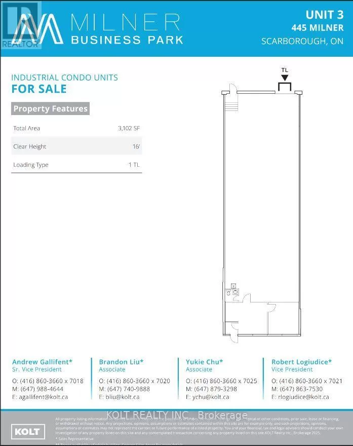 Markham Rd & Hwy 401 Welcome to the Milner Business Park, featuring this Prime Industrial unit offering 3,102 sq. ft. with 16' clear height, & 1 Truck-level Loading Dock. Ideal for end users or investors. Great location in high demand industrial area and offering quick access to Hwy 401, a key benefit for logistics and transport-oriented businesses. Flexible E0.6 zoning can accommodate a wide range of industrial uses. The property's three access points help streamline entry and exit, with ample parking spaces for your staff & clients. Vendor can provide turnkey buildouts & renovations, and the space is easily adaptable to your needs. This industrial unit is a smart choice for operational efficiency and investment potential. Industrial Condo Unit #28, Municipal Address Unit 3 - 445 Milner Ave. (id:27476)