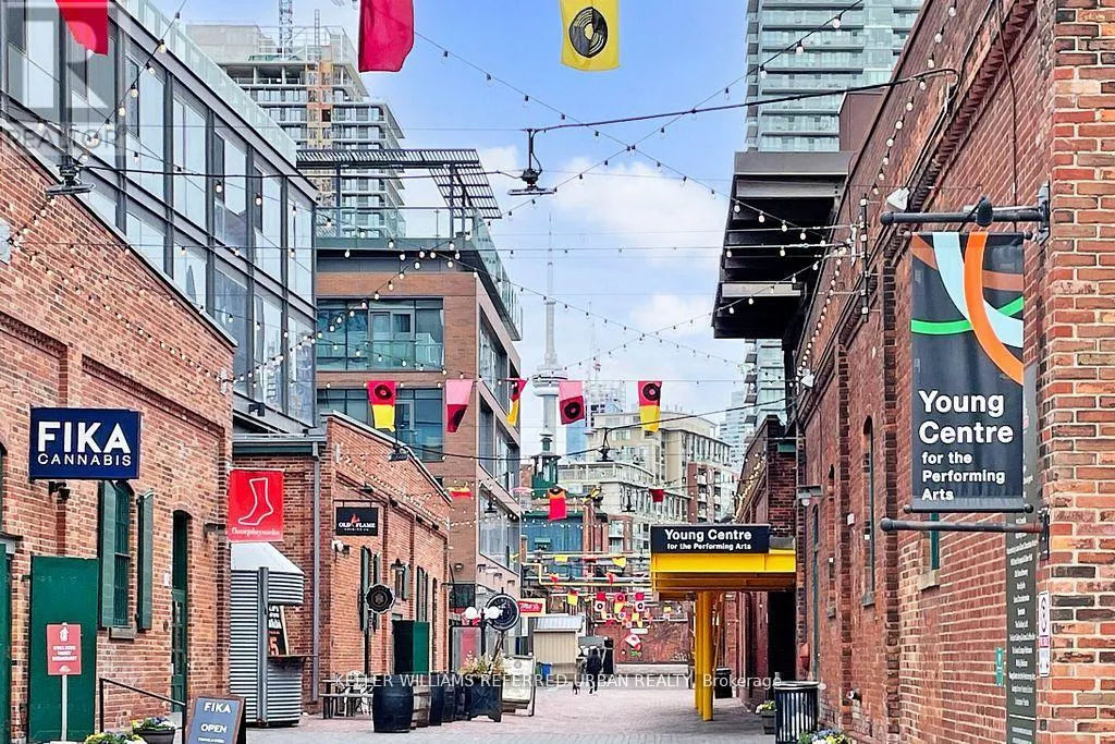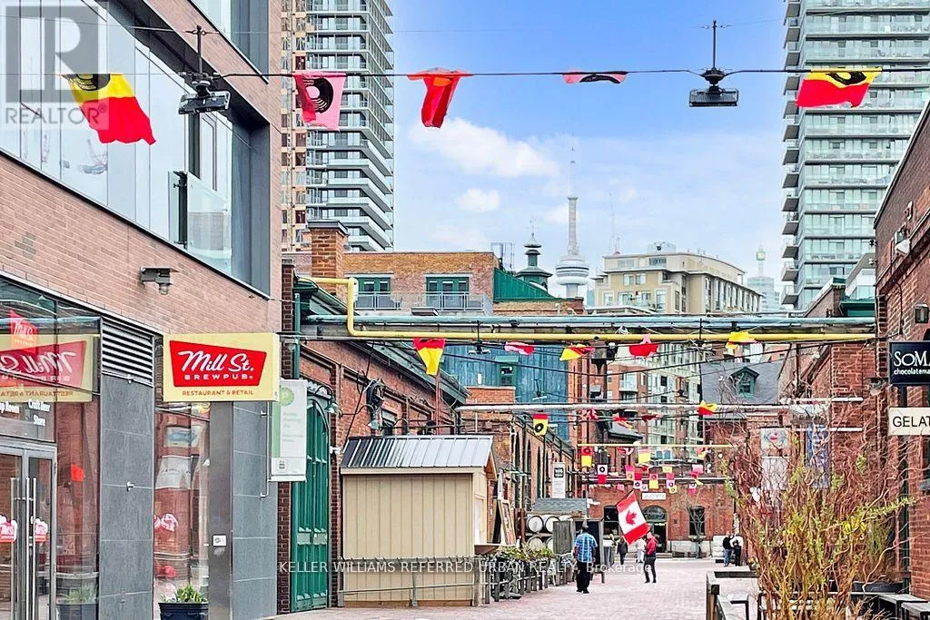 Cherry St & Front St E A Rare Offering This Bright, Airy, and Highly Functional One-Bedroom Residence Is Perfectly Situated in the Heart of the Historic Distillery District. Thoughtfully Upgraded and Meticulously Maintained, It Seamlessly Blends Contemporary Finishes with the Neighbourhood's Rich Heritage, All Within a Sought-After Layout. Designed as an Elegant Pied-à -Terre, It Showcases Engineered Oak Hardwood Floors, Custom Quartz Countertops and Backsplash, and Sun-Soaked Views Overlooking the Charming Historic Streetscape. The Spa-Inspired Bathroom Features Wide-Panelled Tiling, a Luxurious Soaker Tub, and a Modern Floating Vanity. Step Outside to a Sprawling 150-Square-Foot Balcony, the Perfect Setting for Serene Mornings and Stunning Sunsets. Enjoy Unmatched Convenience Just Steps to Transit, Bike Lanes, Parks, Boutique Shops, Cafés, Artistic Vendors, Award-Winning Restaurants, Vibrant Nightlife, and the Famed Christmas Market. Experience a Lifestyle Rich in History, Character, and Comfort, Complete with World-Class Amenities: Rooftop BBQ Terrace, Outdoor Saltwater Pool and Hot Tub, Sauna, State-of-the-Art Fitness Centre, and Guest Suites. (id:27476)