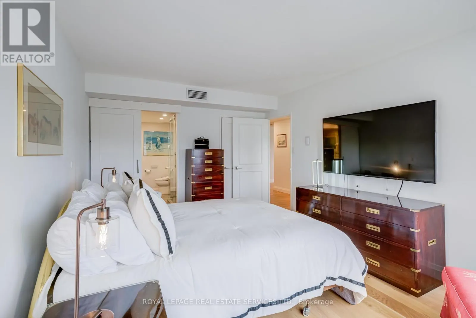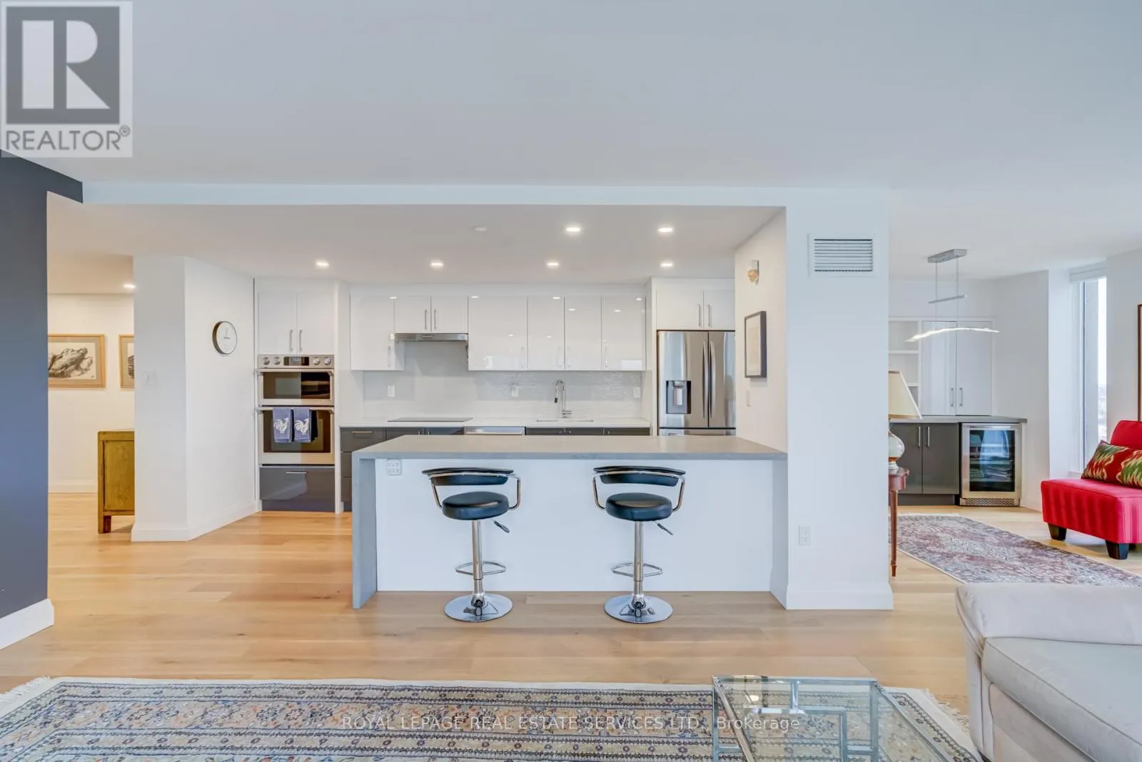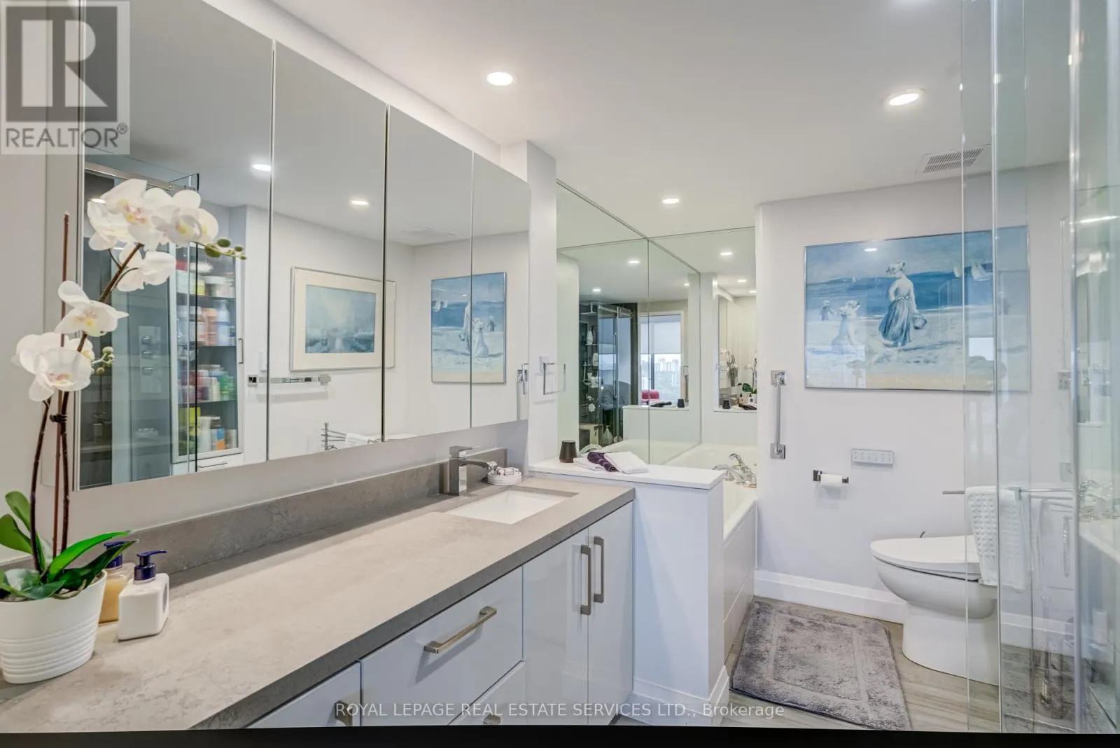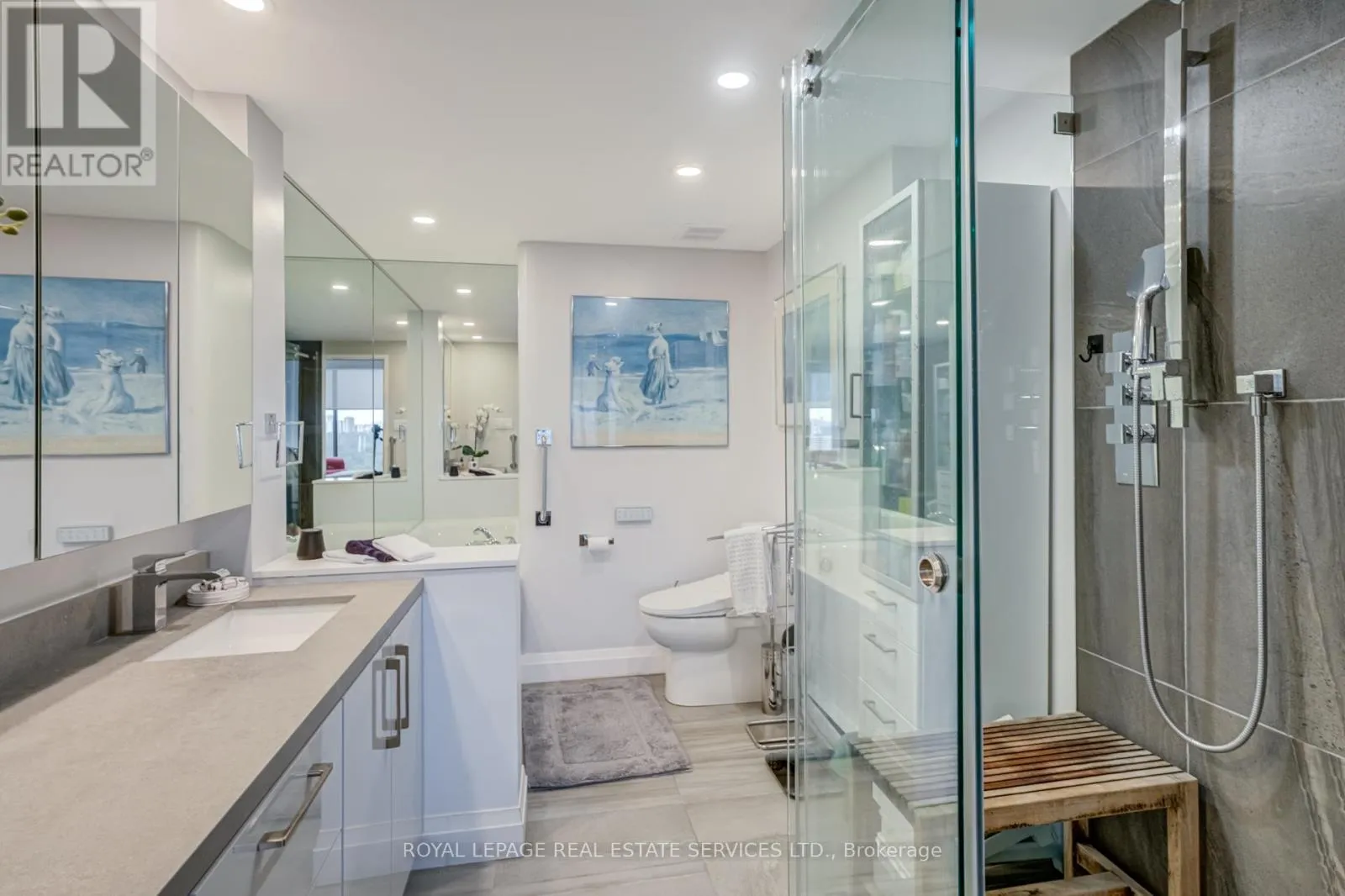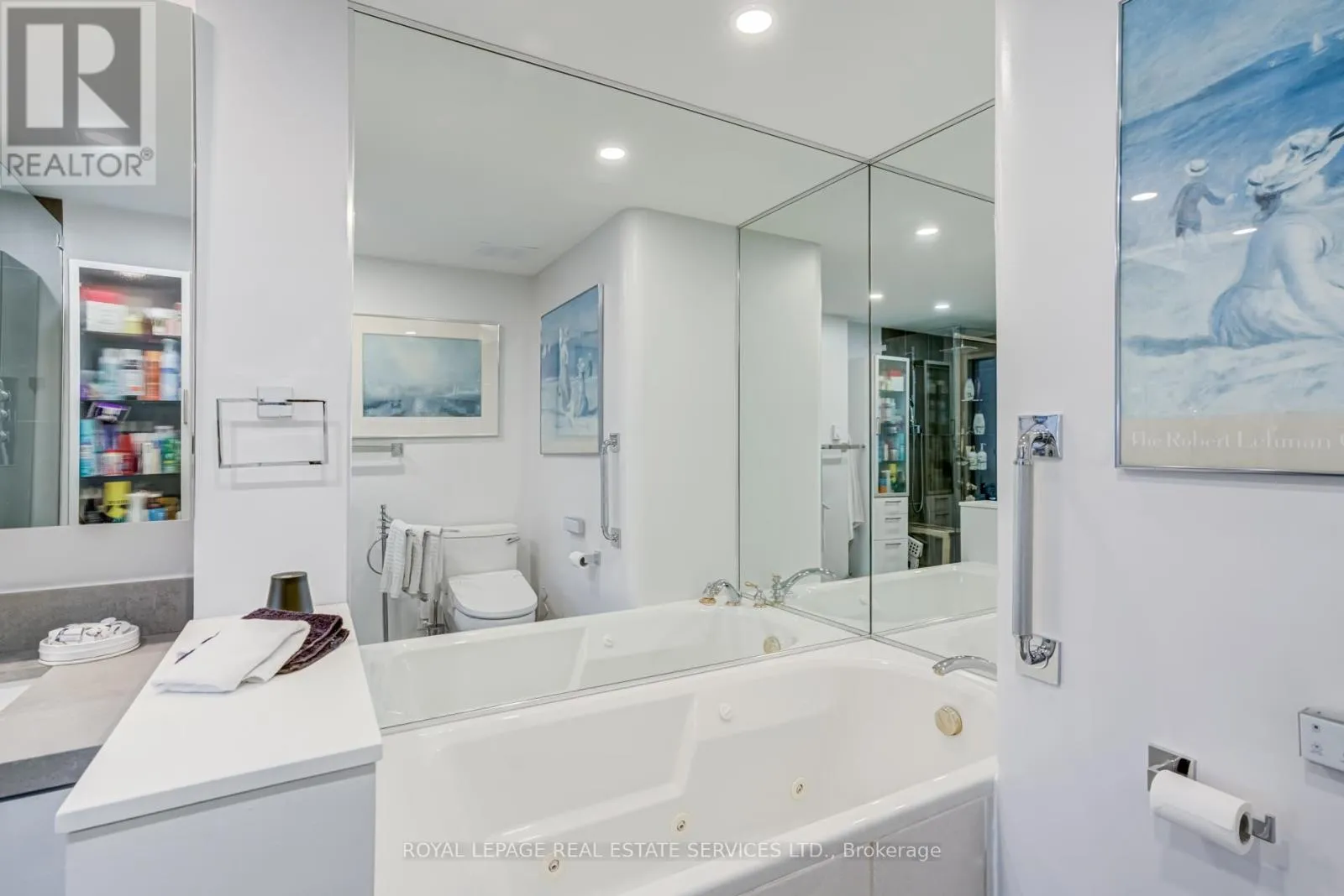 Park Lawn & Lake Shore Welcome to Toronto's luxury landmark high rise, Palace Pier, located on the shore of Lake Ontario. Rarely available, this 1,890 sq.ft. three bedroom, two and a half bath residence is move in ready. Upon entering, to your right, the first or primary bedroom or bonus room, is spacious, and totally private from the rest of the suite. A three piece bath, with walk in shower completes this area. A separate wing, if you will. Proceeding down the hall into the principle living area, floor to ceiling windows frame the views of parkland, the Humber River, particularly beautiful in Autumn and partial view of the city skyline. The living and dining rooms size is accentuated by the open concept kitchen, oversized Caesarstone preparation island, surrounded by German manufactured, white acrylic cupboards and drawers, lots of them, and upscale gleaming Samsung and Bosch S/S/appliances. The kitchen counter has been extended to the dining area for additional storage, bar and wine fridge. The backsplash is unique. Punched stainless steel which compliments the white granite counter tops. Engineered floors of Honey Bleached Oak, easy to maintain, are throughout. The other "primary" ensuite, depending on which you choose, has been made into a mini spa with soaker tub, walk-in rain shower and Icera, toilet/bidet. The additional bedroom is bright and cozy adjacent to a two piece powder room. The full sized LG washer and dryer, have been removed from the kitchen and now tucked away in the hall giving easier access. All this along with grand lobbies and ***** Five Star Amenities: Concierge, 24 hr. security, Valet parking, Private Shuttle to City, Restaurant, Tennis court, BBQ's, Guest Suites, Full service spa, Sports simulator, Gourmet shop, State of the art gym and much more. (id:27476)
