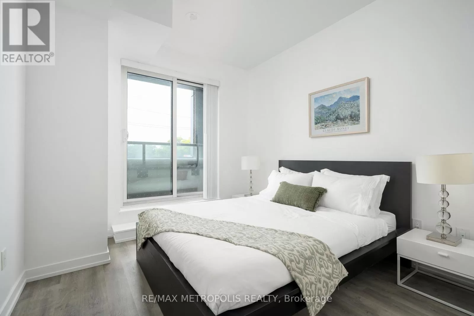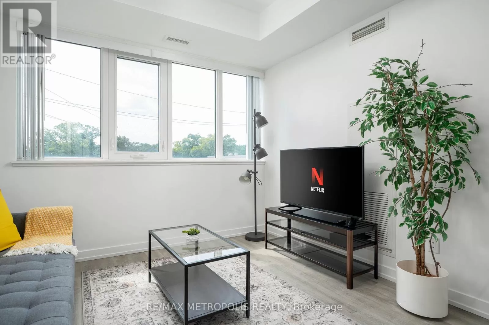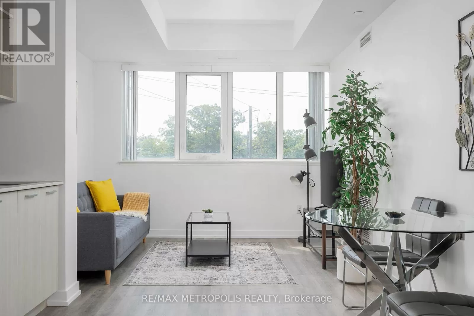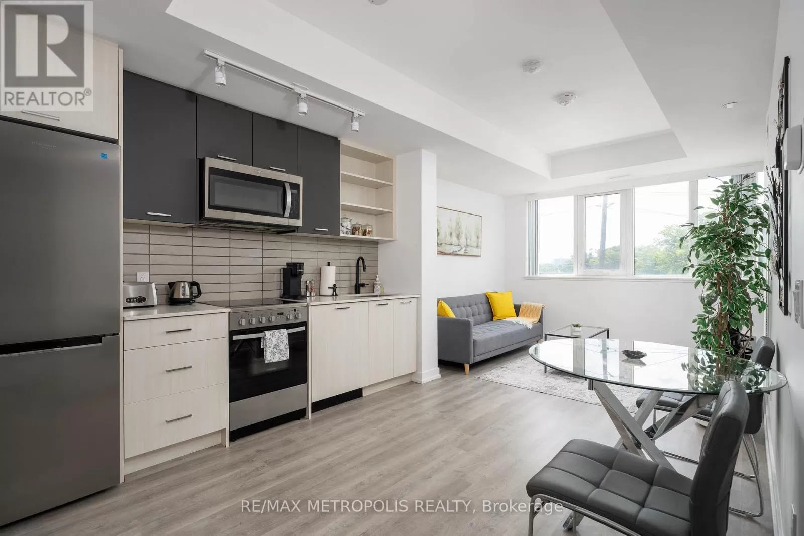 ST CLAIR W / WESTON RD (Open house every Sat/Sun 2-4pm by appointment only.) Welcome to Stockyard Condos by Marlin Spring Developments nestled in the heart of The Junction a prestigious Toronto neighbourhood. Located on the 3rd floor with a South exposure, this spacious 2 bedroom suite offers 607 sq ft of living space, tons of natural light, modern finishes, laminate flooring throughout, ensuite laundry and an open concept balcony to unobstructed city views. The inviting open-concept living and dining areas are perfect for relaxation and entertainment. Enjoy the chef's kitchen that's equipped with contemporary stainless steel appliances, quartz countertops, and a stylish backsplash. The spacious bedroom features a sizeable closet and a walk out to balcony. The second bedroom features sliding doors and convenient closet space. The unit comes with 1 parking space and 1 locker. Building amenities include a 24-hr concierge, gym/exercise room, party/meeting room, outdoor terrace with BBQ area, visitors parking, electric car charging stations, games room and more. Conveniently located near TTC public transit, Stockyards Village, grocery & shopping plazas, restaurants, cafes, parks, banks & other local area amenities. Building allows short-term rentals. Vendor Take Back (VTB) is available. (id:27476)