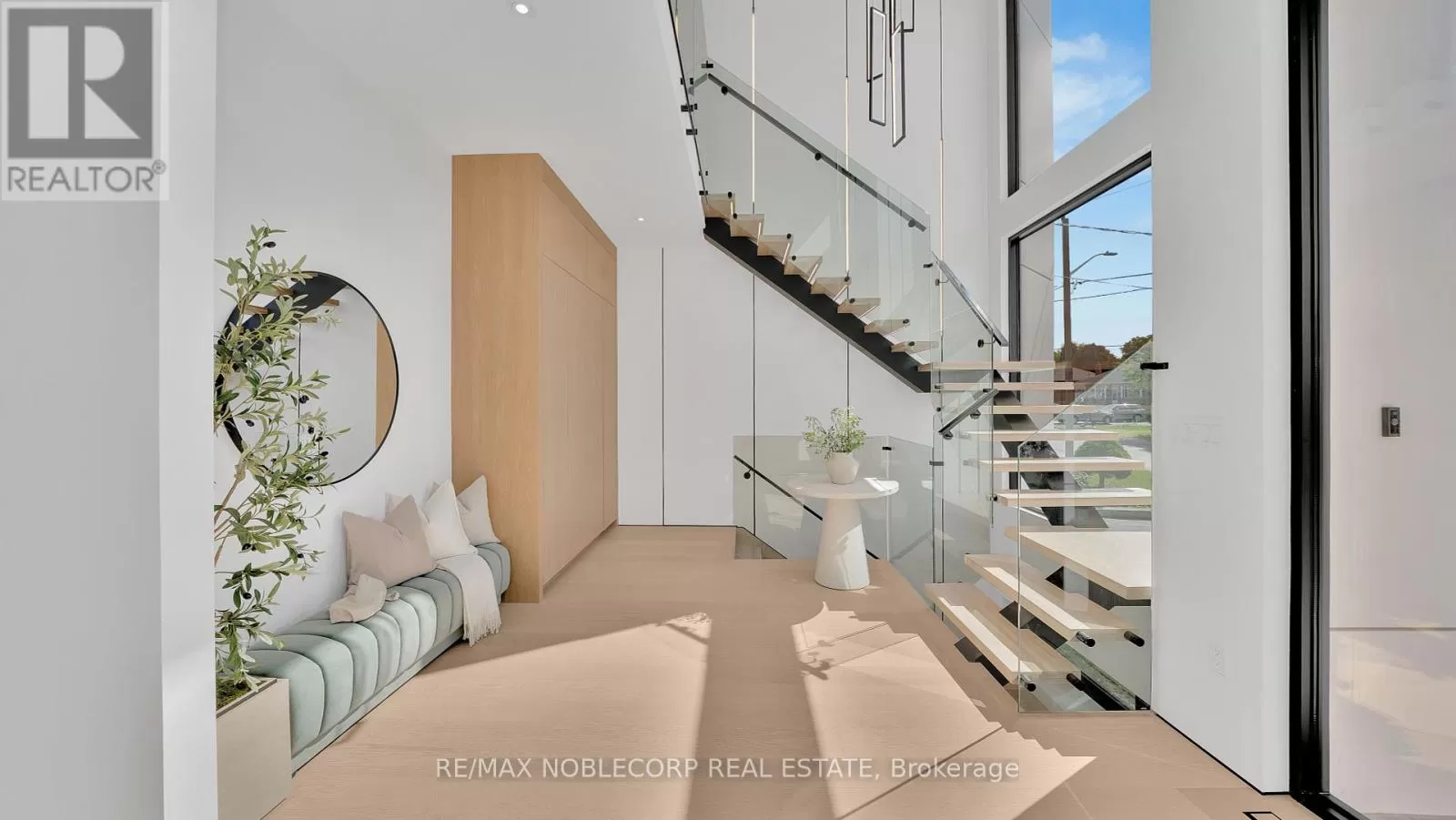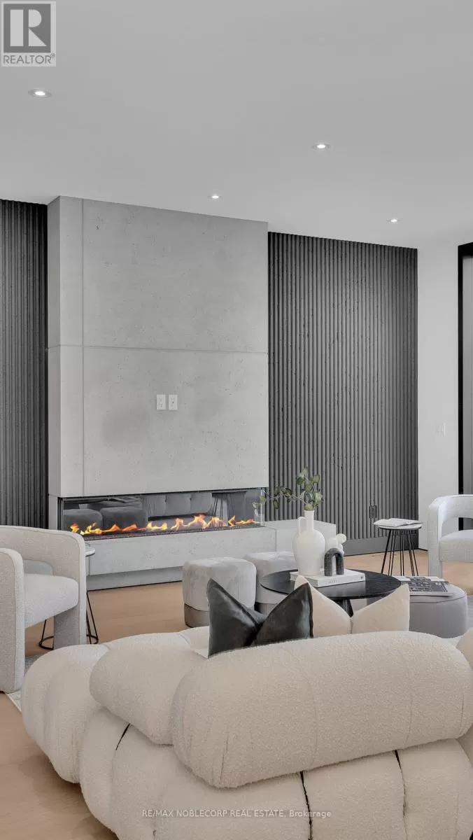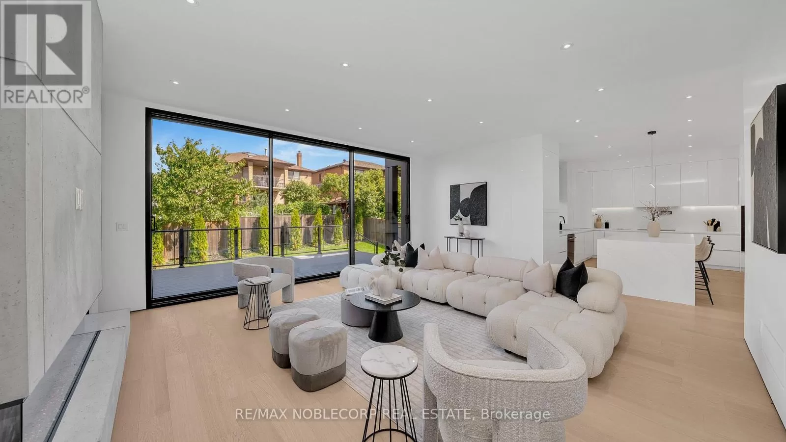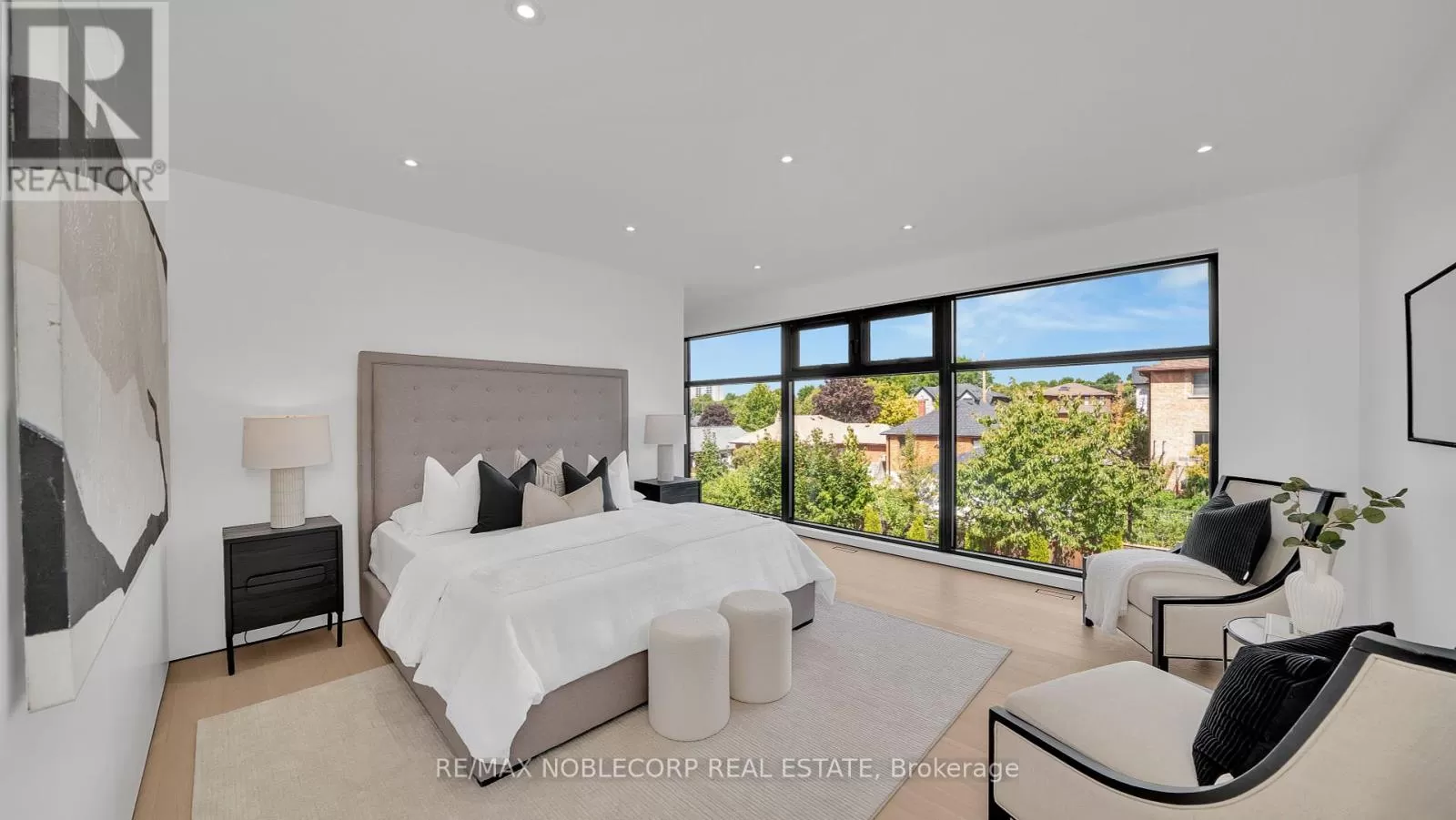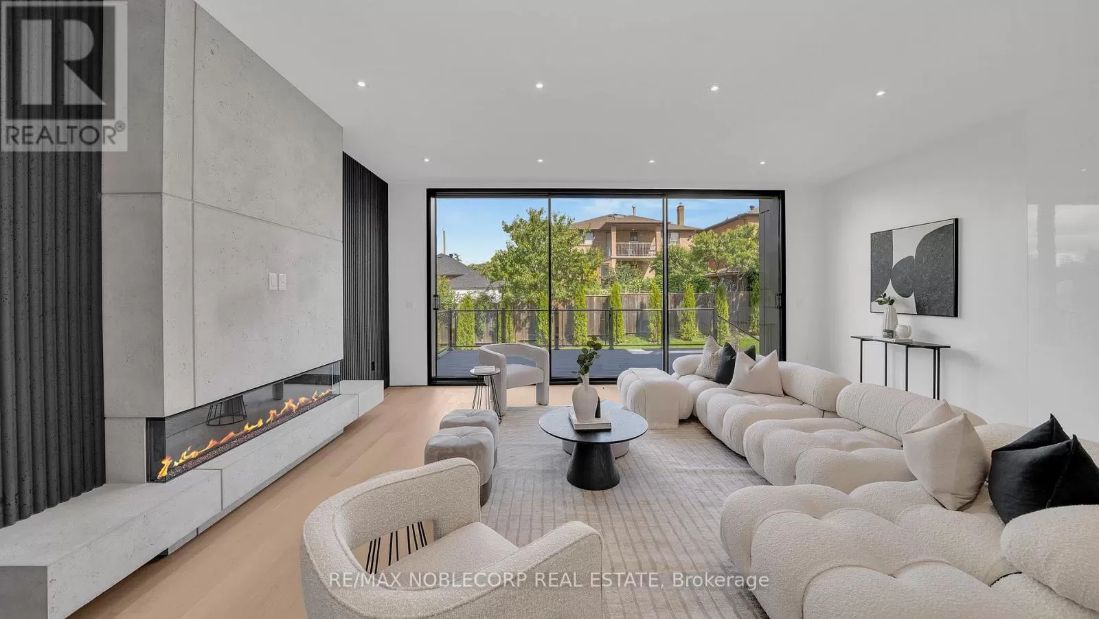 Keele and Wilson A modern contemporary masterpiece at 16 Deevale Rd, this custom-built residence offers over 4,500 sq. ft. of livable space with 4+2 bedrooms and 5 bathrooms. Designed with soaring ceilings and floor-to-ceiling windows, the home features an expansive rear wall of glass with oversized sliding doors opening to a spacious composite patio. The sleek interior is defined by white oak floors, seamless paneled walls, and a floating staircase with glass railing, while the open-concept main level showcases a 3-sided fireplace and a chefs kitchen with a 10 quartz waterfall island, quartz backsplash, premium appliances, pot filler, wine wall, and full-height cabinetry with valance lighting. Upstairs, the primary suite offers a custom walk-in closet and a 5-pc spa-inspired ensuite with heated floors, rainfall shower, and double vanity, while additional oversized bedrooms feature large windows, built-ins, and ensuite access. The finished lower level with separate entrance provides flex rec or in-law potential with a full kitchen, dining, living, and 2 bedrooms. Outdoors, enjoy a spacious backyard with lounging cabana and cedar trees, while the front highlights illuminated flagstone steps. Additional features include ACM panels and stucco exterior, oversized aluminum windows, interlock driveway with total parking for six, a fluted-panel 2-car garage with EV charging rough-in, solid-core doors, and a full security systeman exceptional modern residence blending design, luxury, and function. (id:27476)