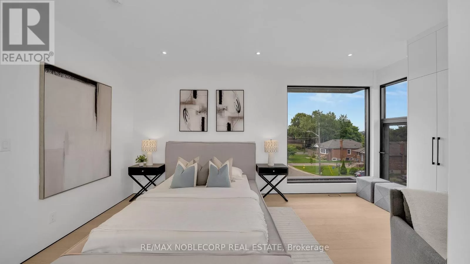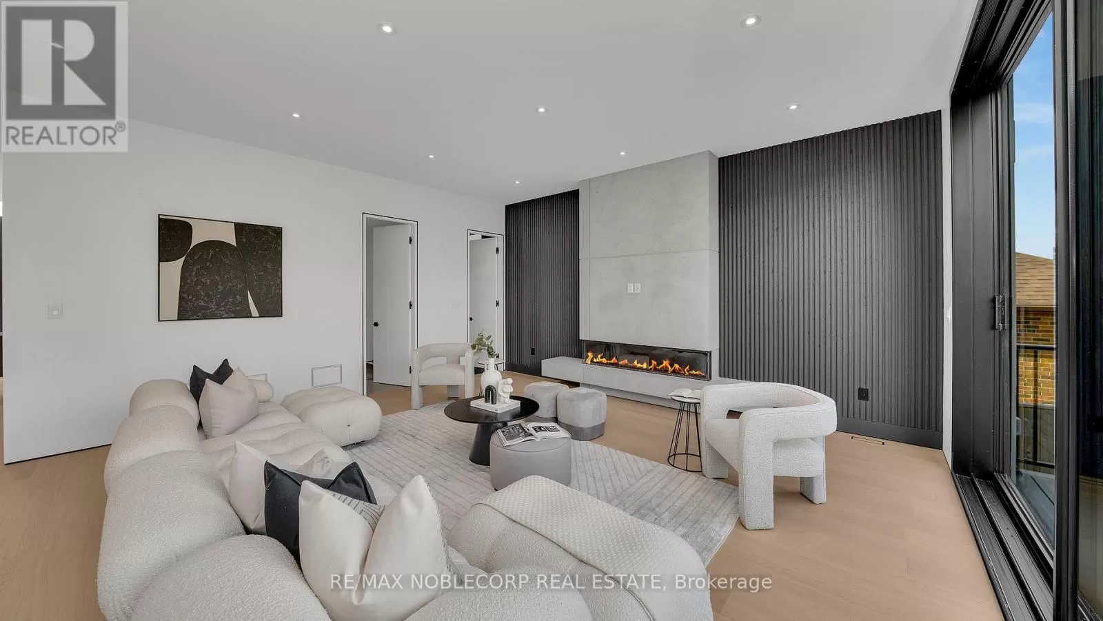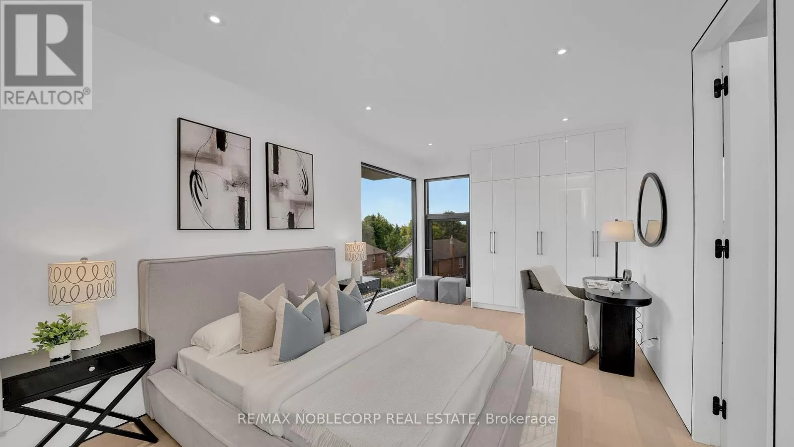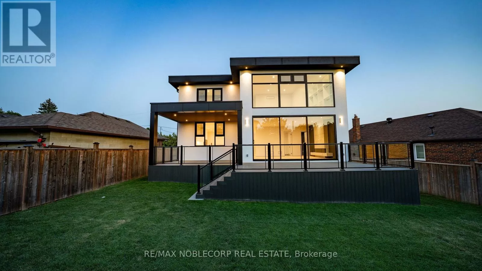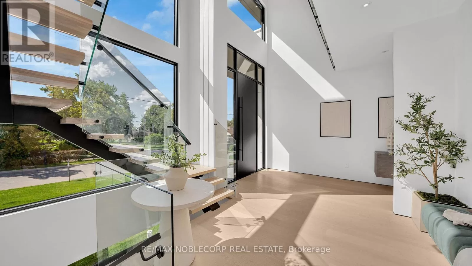 Keele and Wilson A modern contemporary masterpiece at 16 Deevale Rd, this custom-built residence offers over 4,500 sq. ft. of livable space with 4+2 bedrooms and 5 bathrooms. Designed with soaring ceilings and floor-to-ceiling windows, the home features an expansive rear wall of glass with oversized sliding doors opening to a spacious composite patio. The sleek interior is defined by white oak floors, seamless paneled walls, and a floating staircase with glass railing, while the open-concept main level showcases a 3-sided fireplace and a chefs kitchen with a 10 quartz waterfall island, quartz backsplash, premium appliances, pot filler, wine wall, and full-height cabinetry with valance lighting. Upstairs, the primary suite offers a custom walk-in closet and a 5-pc spa-inspired ensuite with heated floors, rainfall shower, and double vanity, while additional oversized bedrooms feature large windows, built-ins, and ensuite access. The finished lower level with separate entrance provides flex rec or in-law potential with a full kitchen, dining, living, and 2 bedrooms. Outdoors, enjoy a spacious backyard with lounging cabana and cedar trees, while the front highlights illuminated flagstone steps. Additional features include ACM panels and stucco exterior, oversized aluminum windows, interlock driveway with total parking for six, a fluted-panel 2-car garage with EV charging rough-in, solid-core doors, and a full security systeman exceptional modern residence blending design, luxury, and function. (id:27476)