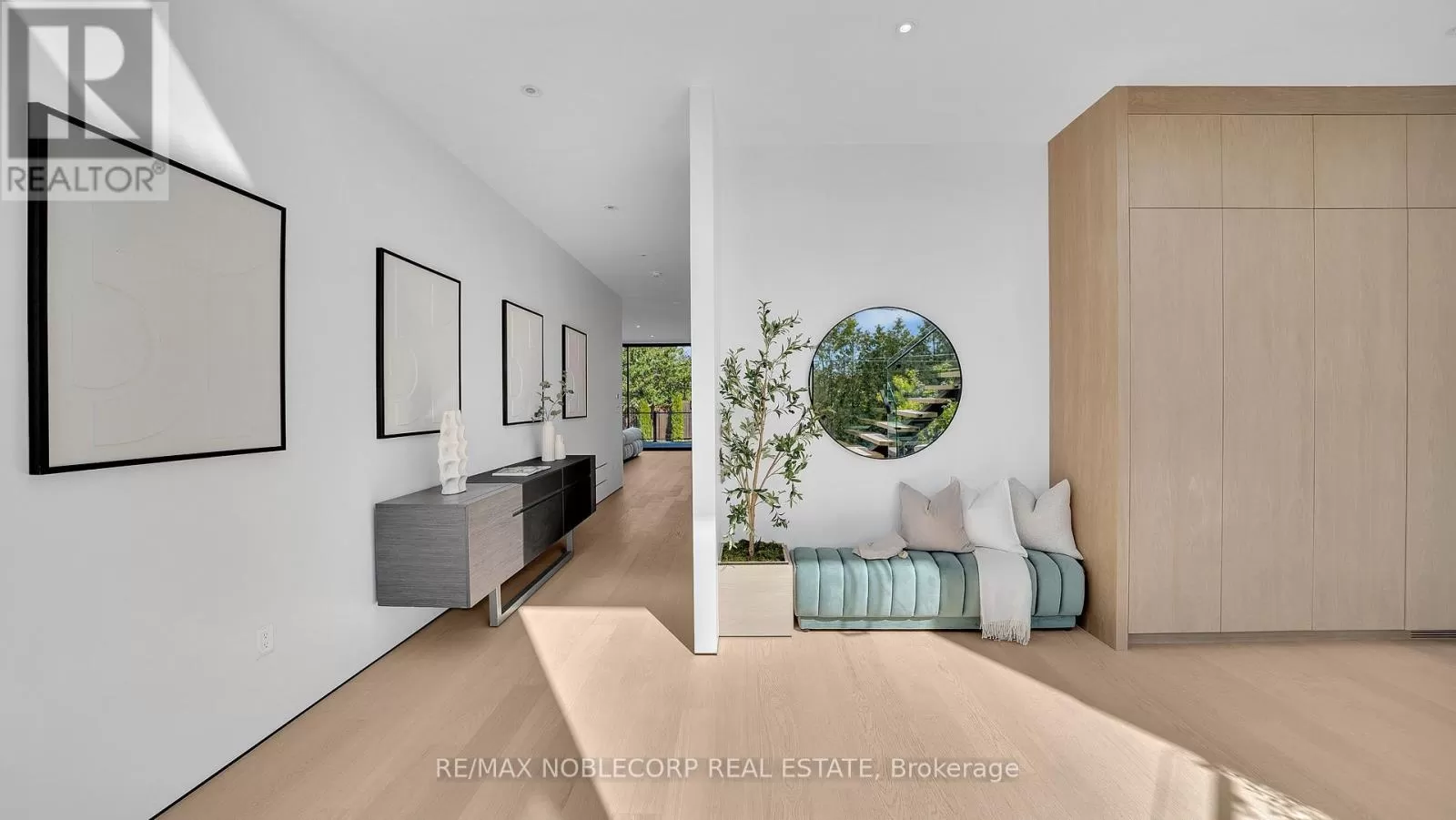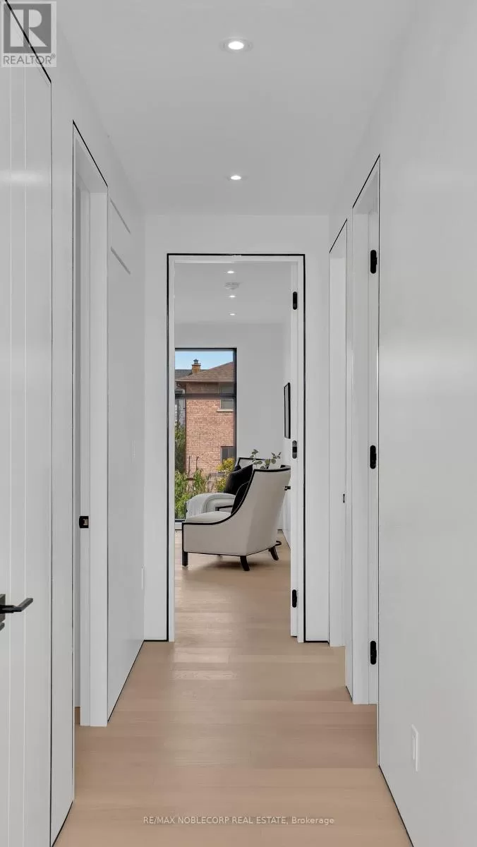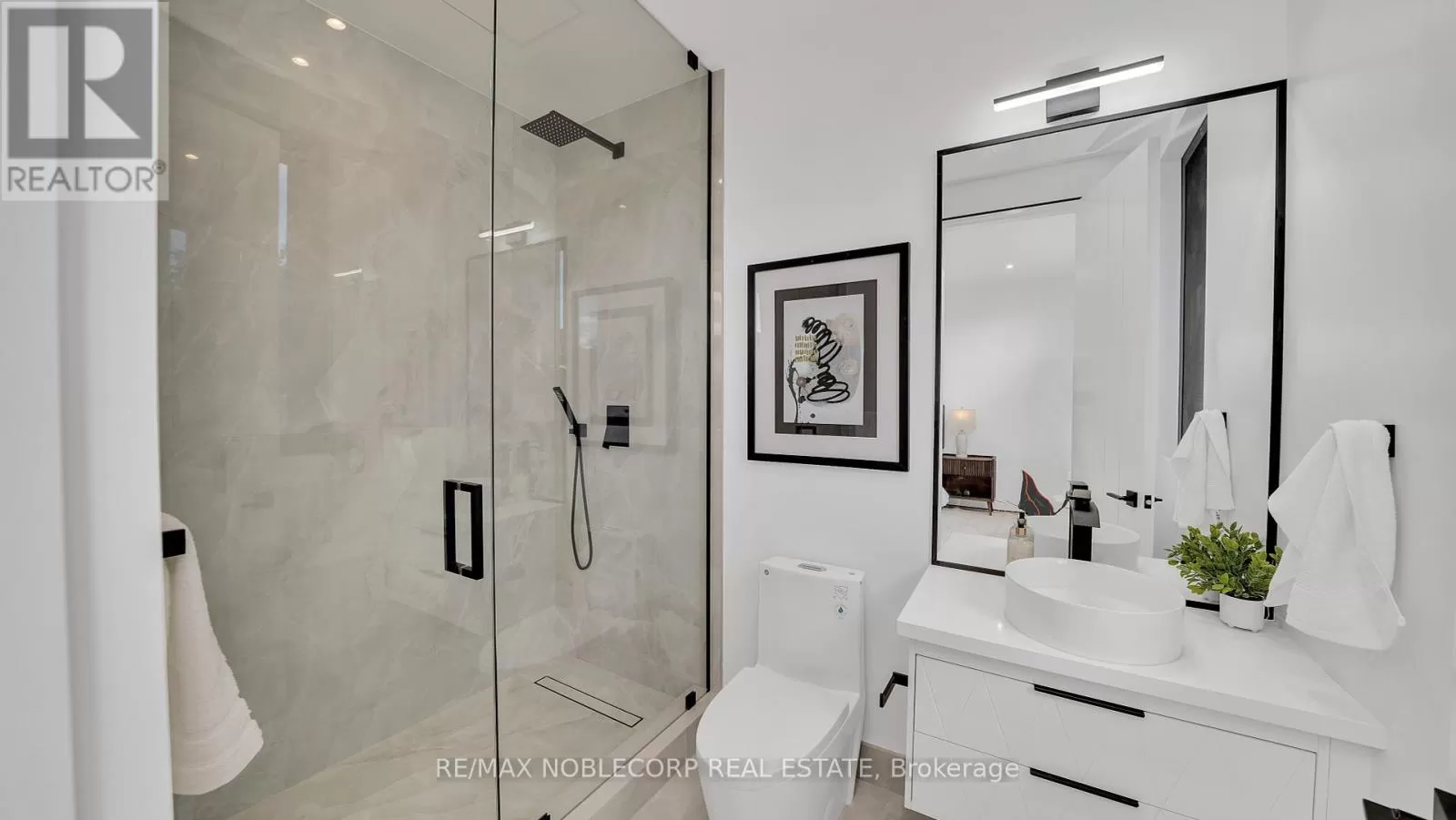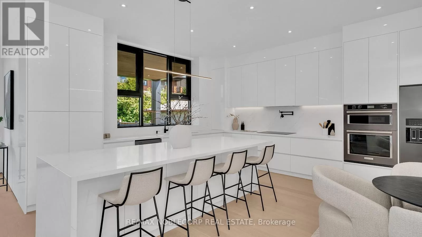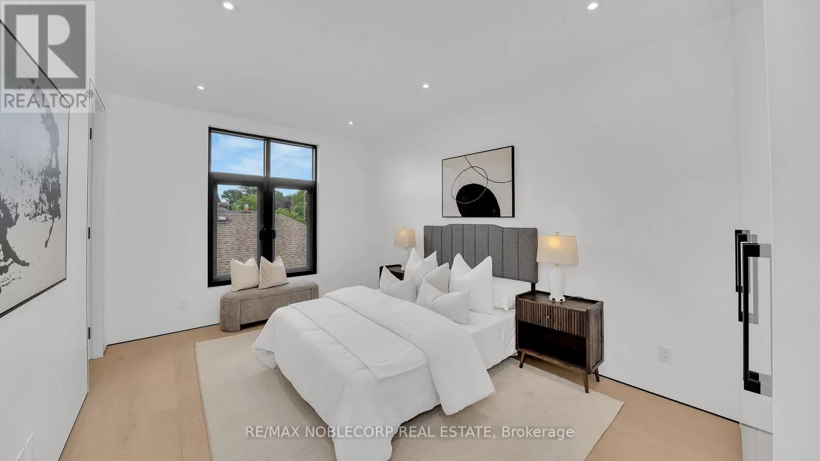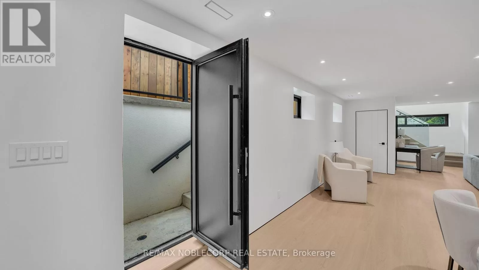 Keele and Wilson A modern contemporary masterpiece at 16 Deevale Rd, this custom-built residence offers over 4,500 sq. ft. of livable space with 4+2 bedrooms and 5 bathrooms. Designed with soaring ceilings and floor-to-ceiling windows, the home features an expansive rear wall of glass with oversized sliding doors opening to a spacious composite patio. The sleek interior is defined by white oak floors, seamless paneled walls, and a floating staircase with glass railing, while the open-concept main level showcases a 3-sided fireplace and a chefs kitchen with a 10 quartz waterfall island, quartz backsplash, premium appliances, pot filler, wine wall, and full-height cabinetry with valance lighting. Upstairs, the primary suite offers a custom walk-in closet and a 5-pc spa-inspired ensuite with heated floors, rainfall shower, and double vanity, while additional oversized bedrooms feature large windows, built-ins, and ensuite access. The finished lower level with separate entrance provides flex rec or in-law potential with a full kitchen, dining, living, and 2 bedrooms. Outdoors, enjoy a spacious backyard with lounging cabana and cedar trees, while the front highlights illuminated flagstone steps. Additional features include ACM panels and stucco exterior, oversized aluminum windows, interlock driveway with total parking for six, a fluted-panel 2-car garage with EV charging rough-in, solid-core doors, and a full security systeman exceptional modern residence blending design, luxury, and function. (id:27476)