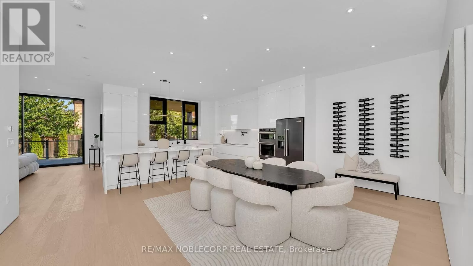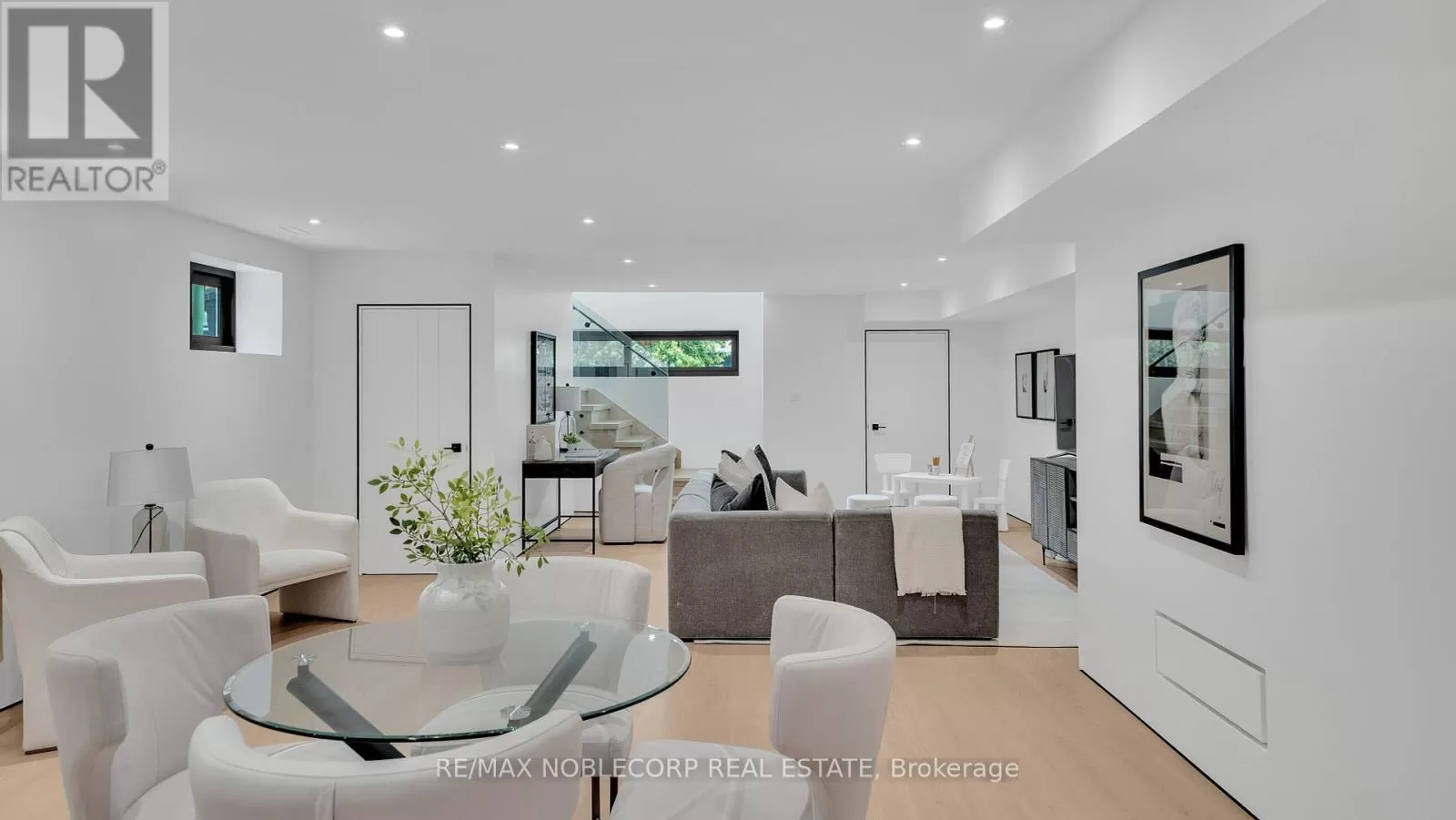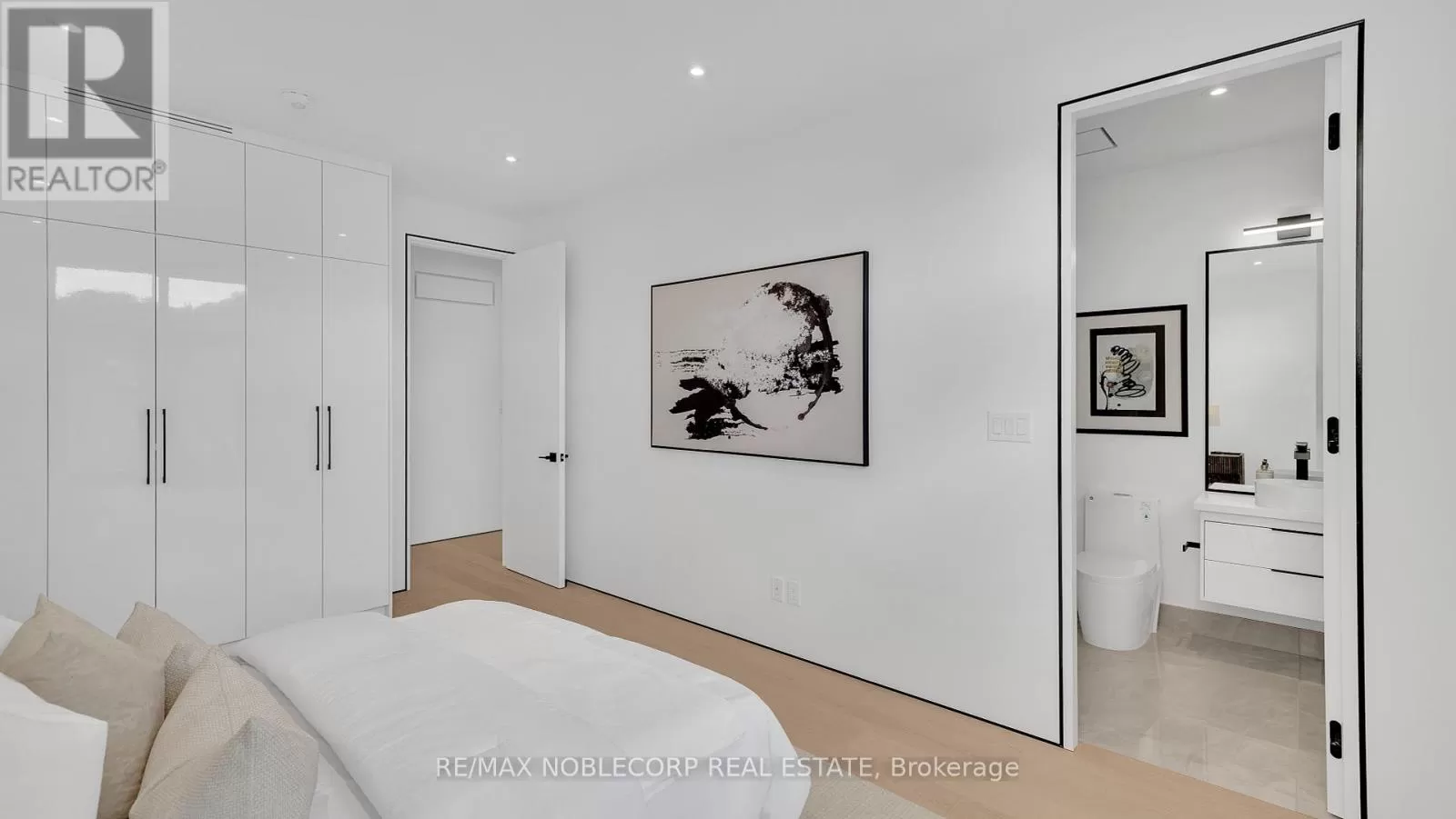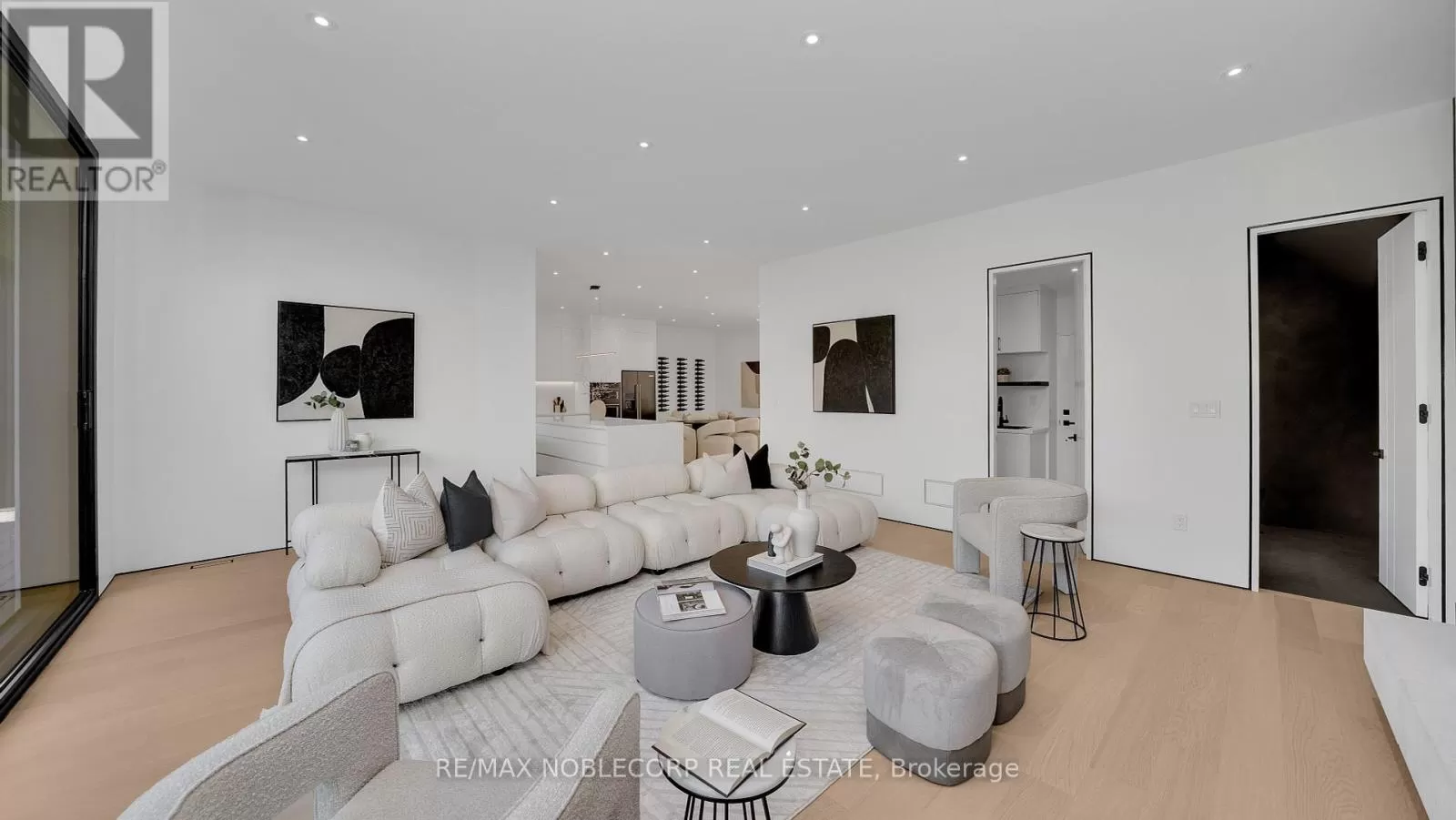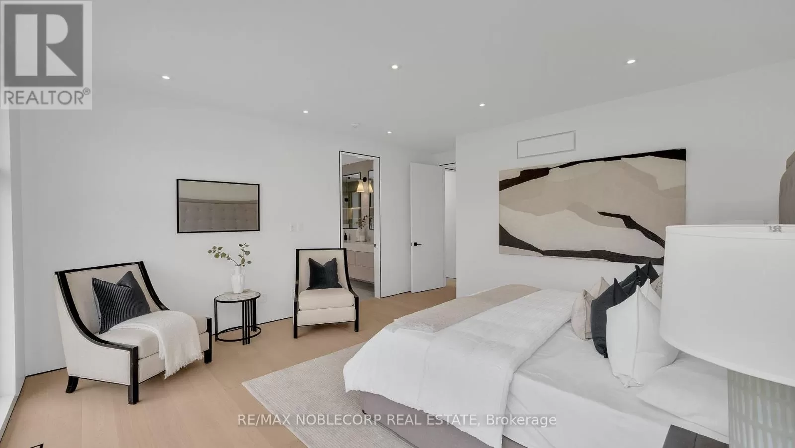 Keele and Wilson A modern contemporary masterpiece at 16 Deevale Rd, this custom-built residence offers over 4,500 sq. ft. of livable space with 4+2 bedrooms and 5 bathrooms. Designed with soaring ceilings and floor-to-ceiling windows, the home features an expansive rear wall of glass with oversized sliding doors opening to a spacious composite patio. The sleek interior is defined by white oak floors, seamless paneled walls, and a floating staircase with glass railing, while the open-concept main level showcases a 3-sided fireplace and a chefs kitchen with a 10 quartz waterfall island, quartz backsplash, premium appliances, pot filler, wine wall, and full-height cabinetry with valance lighting. Upstairs, the primary suite offers a custom walk-in closet and a 5-pc spa-inspired ensuite with heated floors, rainfall shower, and double vanity, while additional oversized bedrooms feature large windows, built-ins, and ensuite access. The finished lower level with separate entrance provides flex rec or in-law potential with a full kitchen, dining, living, and 2 bedrooms. Outdoors, enjoy a spacious backyard with lounging cabana and cedar trees, while the front highlights illuminated flagstone steps. Additional features include ACM panels and stucco exterior, oversized aluminum windows, interlock driveway with total parking for six, a fluted-panel 2-car garage with EV charging rough-in, solid-core doors, and a full security systeman exceptional modern residence blending design, luxury, and function. (id:27476)