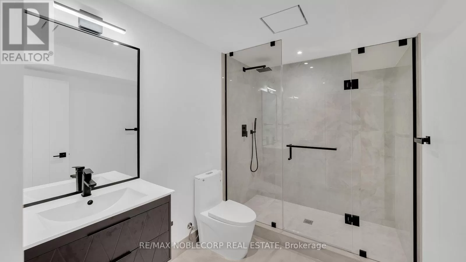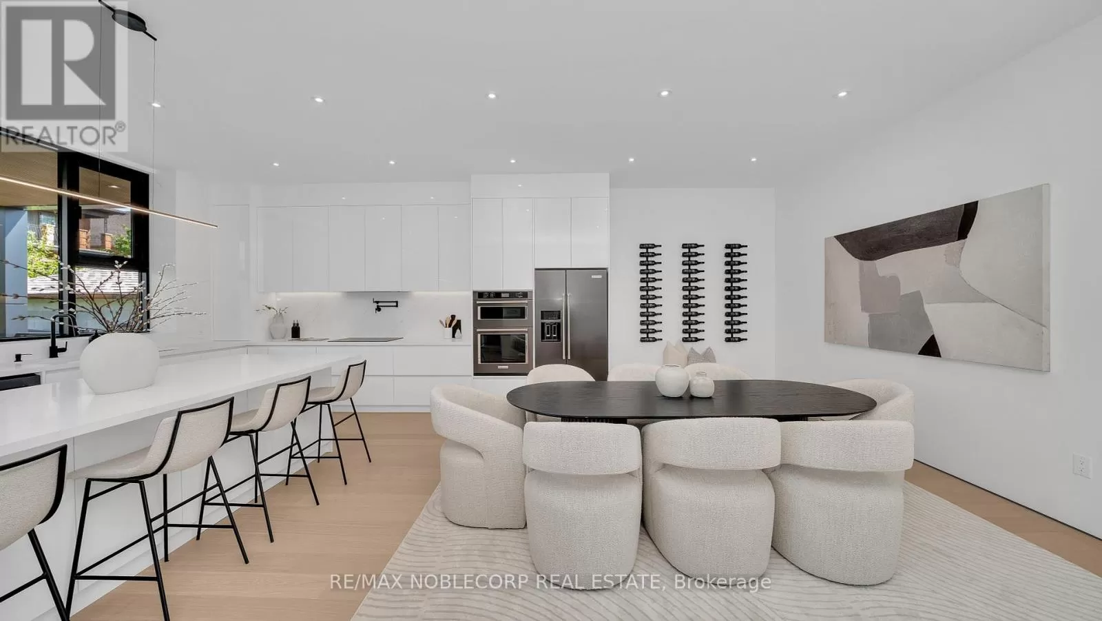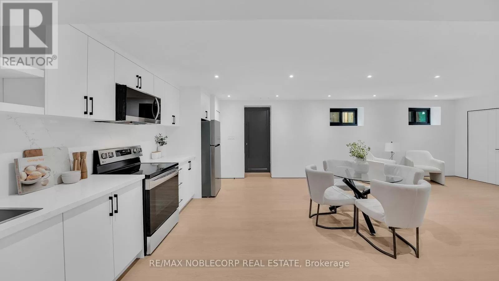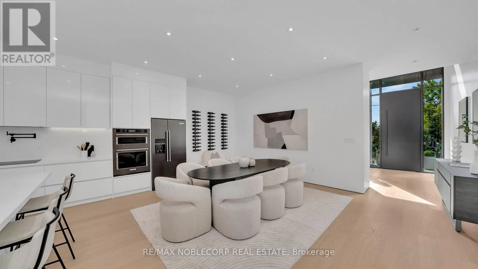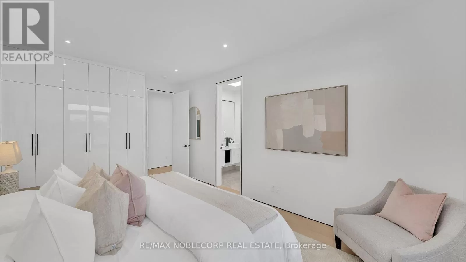 Keele and Wilson A modern contemporary masterpiece at 16 Deevale Rd, this custom-built residence offers over 4,500 sq. ft. of livable space with 4+2 bedrooms and 5 bathrooms. Designed with soaring ceilings and floor-to-ceiling windows, the home features an expansive rear wall of glass with oversized sliding doors opening to a spacious composite patio. The sleek interior is defined by white oak floors, seamless paneled walls, and a floating staircase with glass railing, while the open-concept main level showcases a 3-sided fireplace and a chefs kitchen with a 10 quartz waterfall island, quartz backsplash, premium appliances, pot filler, wine wall, and full-height cabinetry with valance lighting. Upstairs, the primary suite offers a custom walk-in closet and a 5-pc spa-inspired ensuite with heated floors, rainfall shower, and double vanity, while additional oversized bedrooms feature large windows, built-ins, and ensuite access. The finished lower level with separate entrance provides flex rec or in-law potential with a full kitchen, dining, living, and 2 bedrooms. Outdoors, enjoy a spacious backyard with lounging cabana and cedar trees, while the front highlights illuminated flagstone steps. Additional features include ACM panels and stucco exterior, oversized aluminum windows, interlock driveway with total parking for six, a fluted-panel 2-car garage with EV charging rough-in, solid-core doors, and a full security systeman exceptional modern residence blending design, luxury, and function. (id:27476)
