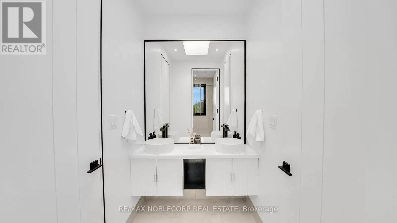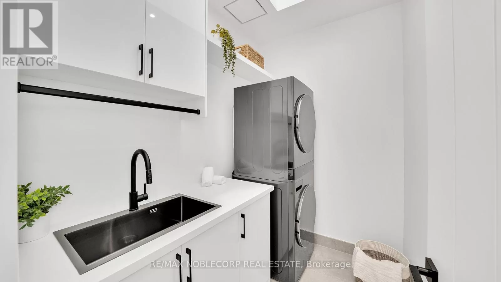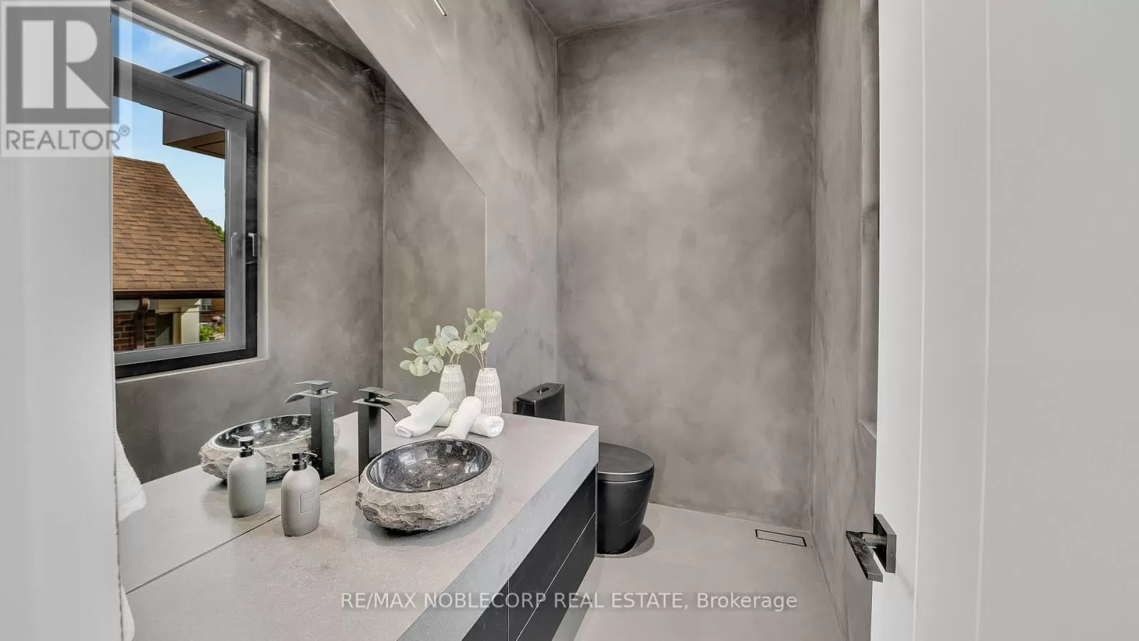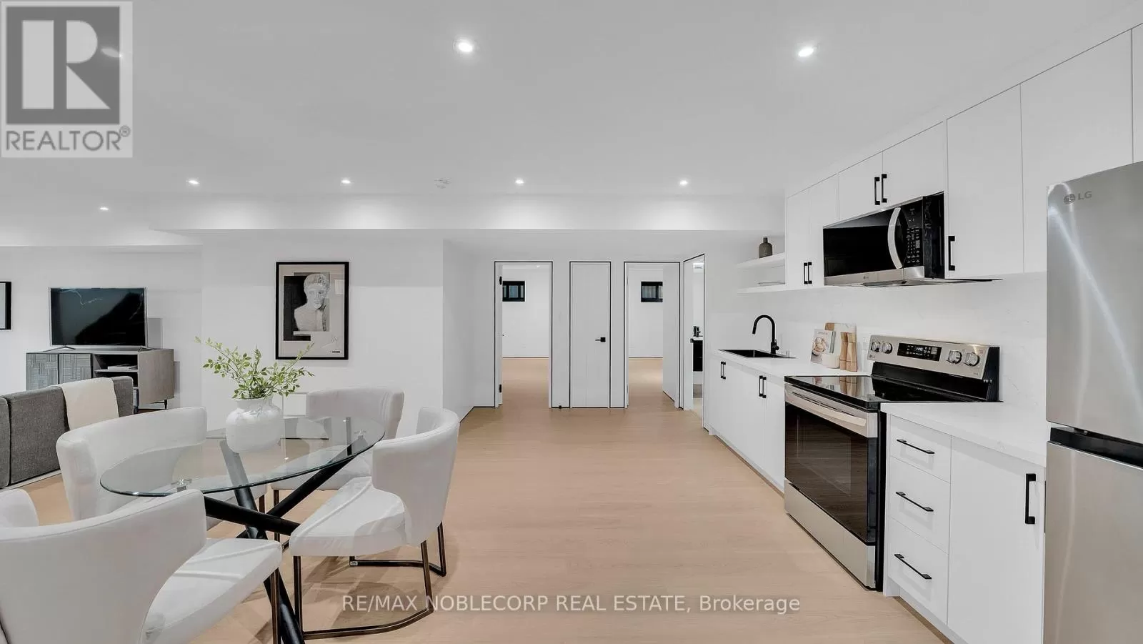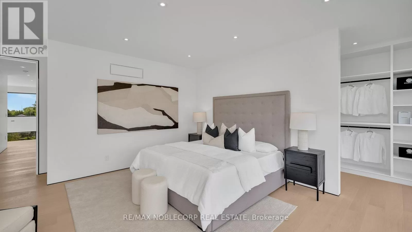 Keele and Wilson A modern contemporary masterpiece at 16 Deevale Rd, this custom-built residence offers over 4,500 sq. ft. of livable space with 4+2 bedrooms and 5 bathrooms. Designed with soaring ceilings and floor-to-ceiling windows, the home features an expansive rear wall of glass with oversized sliding doors opening to a spacious composite patio. The sleek interior is defined by white oak floors, seamless paneled walls, and a floating staircase with glass railing, while the open-concept main level showcases a 3-sided fireplace and a chefs kitchen with a 10 quartz waterfall island, quartz backsplash, premium appliances, pot filler, wine wall, and full-height cabinetry with valance lighting. Upstairs, the primary suite offers a custom walk-in closet and a 5-pc spa-inspired ensuite with heated floors, rainfall shower, and double vanity, while additional oversized bedrooms feature large windows, built-ins, and ensuite access. The finished lower level with separate entrance provides flex rec or in-law potential with a full kitchen, dining, living, and 2 bedrooms. Outdoors, enjoy a spacious backyard with lounging cabana and cedar trees, while the front highlights illuminated flagstone steps. Additional features include ACM panels and stucco exterior, oversized aluminum windows, interlock driveway with total parking for six, a fluted-panel 2-car garage with EV charging rough-in, solid-core doors, and a full security systeman exceptional modern residence blending design, luxury, and function. (id:27476)