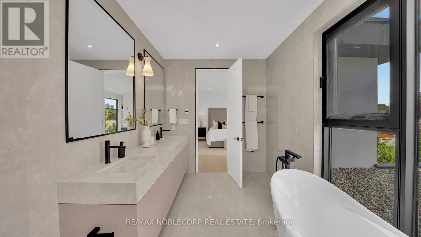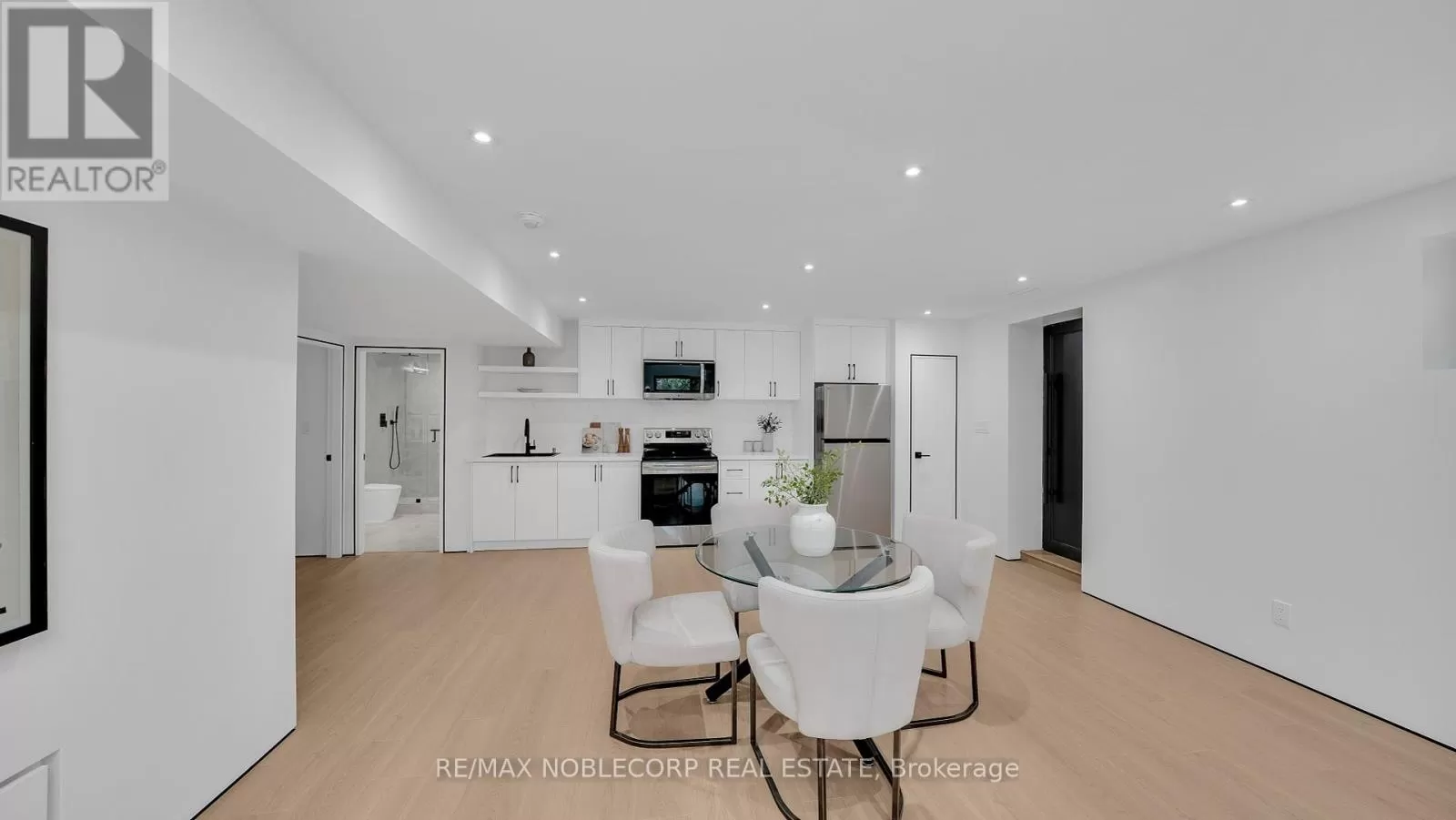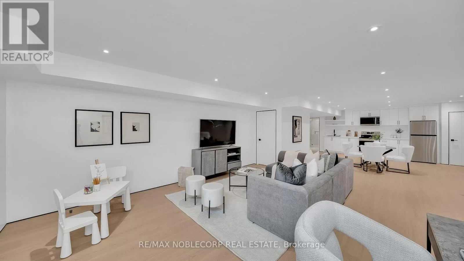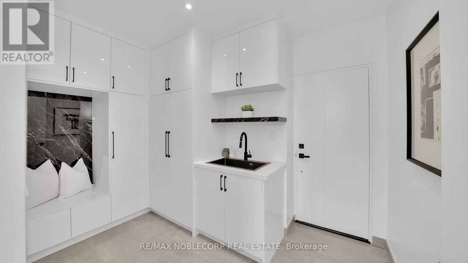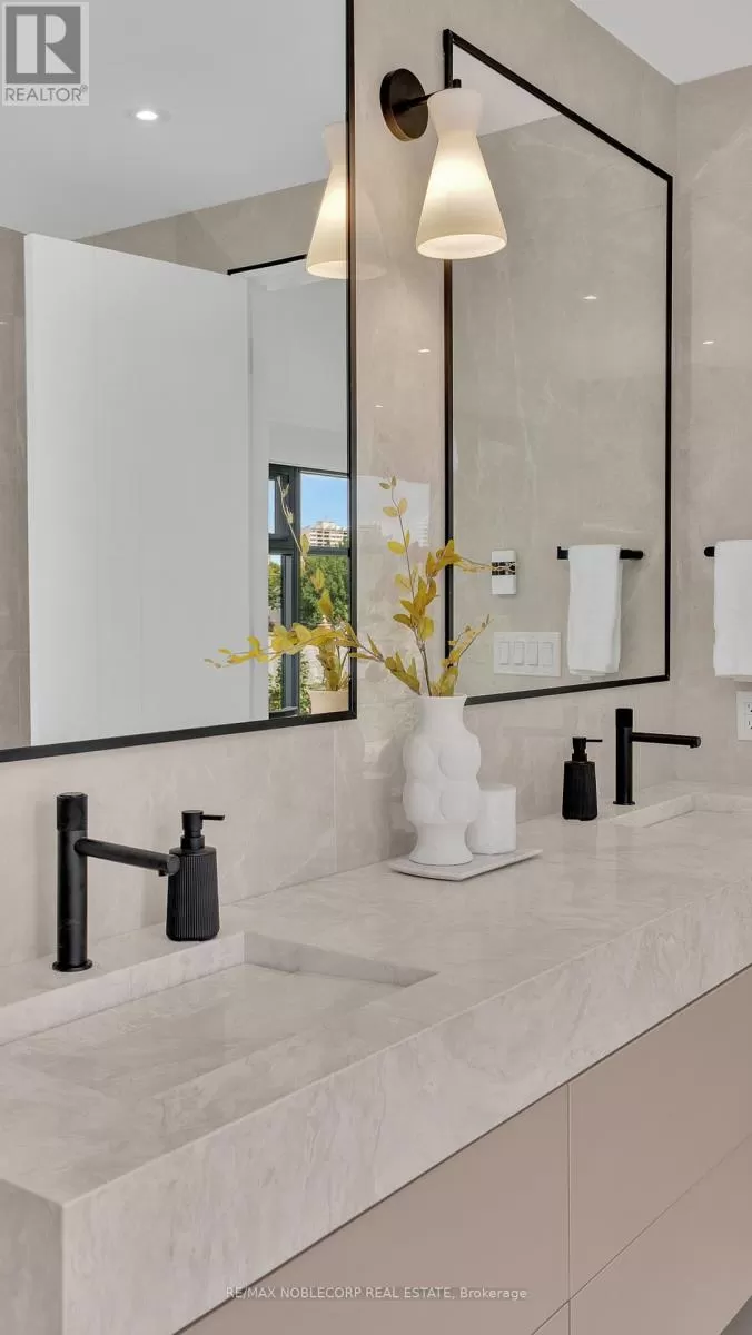 Keele and Wilson A modern contemporary masterpiece at 16 Deevale Rd, this custom-built residence offers over 4,500 sq. ft. of livable space with 4+2 bedrooms and 5 bathrooms. Designed with soaring ceilings and floor-to-ceiling windows, the home features an expansive rear wall of glass with oversized sliding doors opening to a spacious composite patio. The sleek interior is defined by white oak floors, seamless paneled walls, and a floating staircase with glass railing, while the open-concept main level showcases a 3-sided fireplace and a chefs kitchen with a 10 quartz waterfall island, quartz backsplash, premium appliances, pot filler, wine wall, and full-height cabinetry with valance lighting. Upstairs, the primary suite offers a custom walk-in closet and a 5-pc spa-inspired ensuite with heated floors, rainfall shower, and double vanity, while additional oversized bedrooms feature large windows, built-ins, and ensuite access. The finished lower level with separate entrance provides flex rec or in-law potential with a full kitchen, dining, living, and 2 bedrooms. Outdoors, enjoy a spacious backyard with lounging cabana and cedar trees, while the front highlights illuminated flagstone steps. Additional features include ACM panels and stucco exterior, oversized aluminum windows, interlock driveway with total parking for six, a fluted-panel 2-car garage with EV charging rough-in, solid-core doors, and a full security systeman exceptional modern residence blending design, luxury, and function. (id:27476)