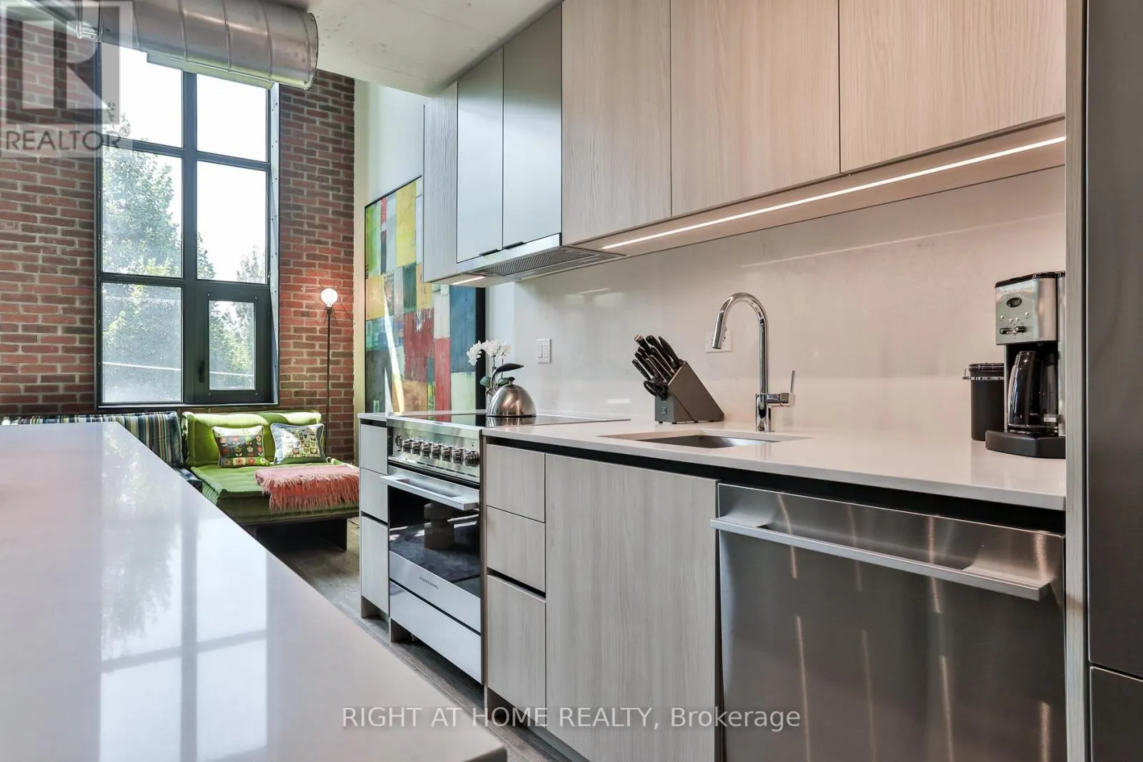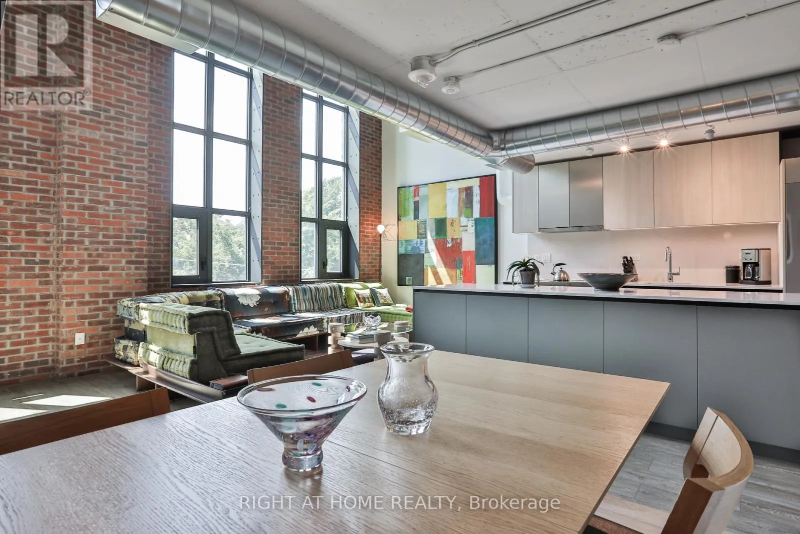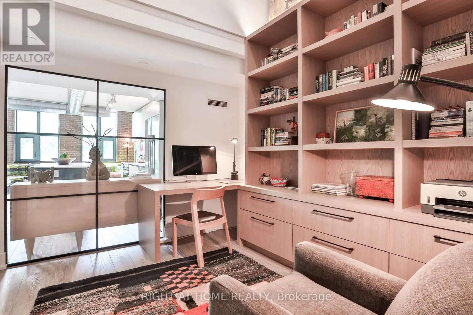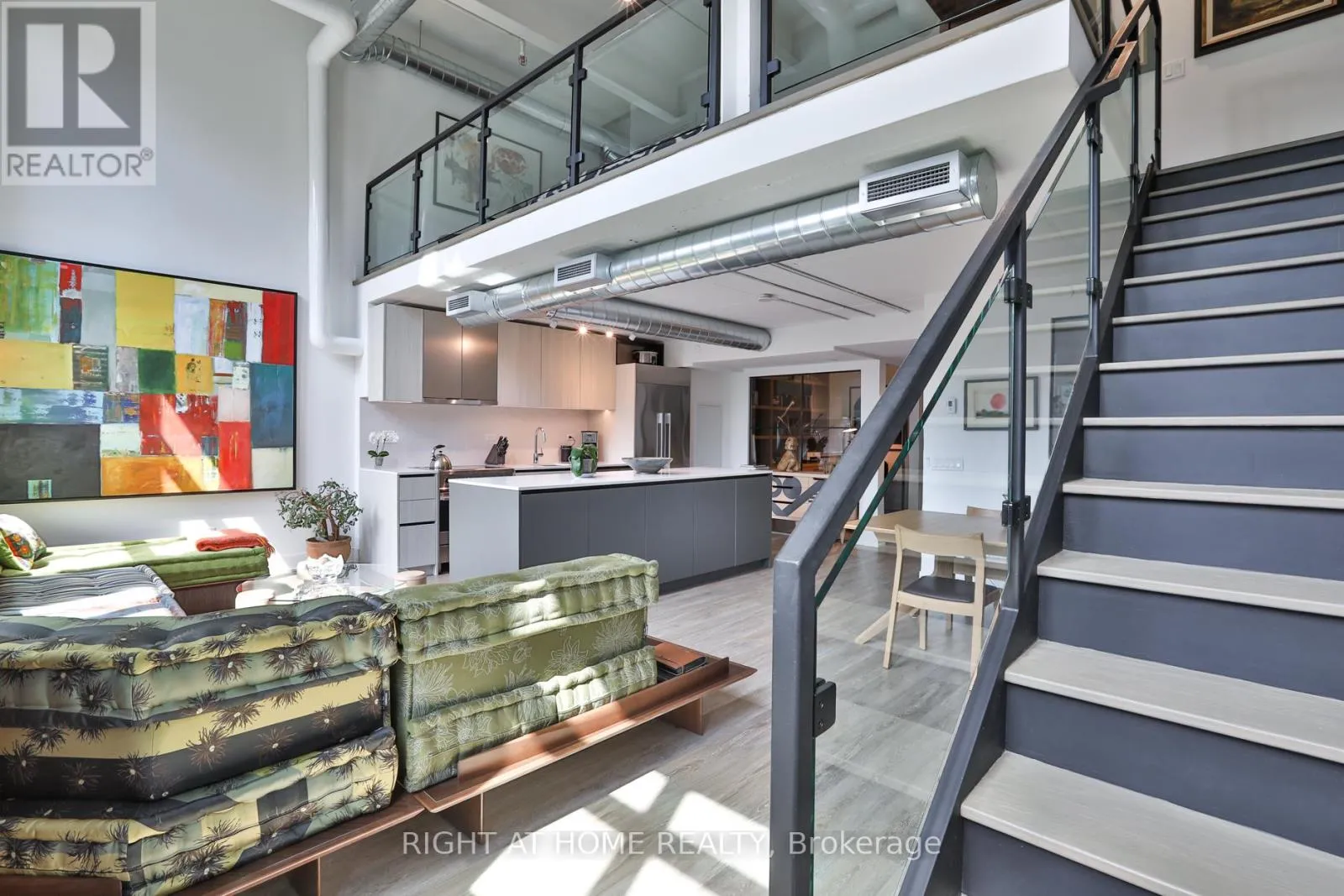 Eastern and Logan Something truly special at Wonder Condos - a sun-filled heritage loft with ideal west exposure, dramatic 17-foot ceilings, and original character throughout. Nearly 1,500 square feet of exceptional living space framed by soaring windows with integrated blinds, warm red brick accents, and a flexible floorplan accommodating up to three bedrooms. The upper loft is devoted to a serene primary suite with a generous walk-in closet and spa-like ensuite with dual vanities. A sprawling chefs kitchen anchors the main level, featuring an oversized island, abundant storage, premium appliances and induction range. Currently, the main floor includes a large office with custom built-ins and walk-in closet (easily reverted to a bedroom) plus a comfortable den, once a third bedroom. A full bathroom serves this level. Life at Wonder Condos offers a dynamic blend of history and modern convenience, with vibrant amenities including a rooftop terrace with BBQs and fire pits, co-working space, dog-wash station, well-equipped gym, and kids party room. Steps to the shops and dining of Queen East, and moments to Ashbridges Bay, Lake Ontario, and easy downtown/DVP access. An evolving neighbourhood within easy walking and cycling distance to the new Port Lands, Biidaasige Park, and the upcoming Ontario Line just blocks away. Exceptional space in a remarkable community. (id:27476)