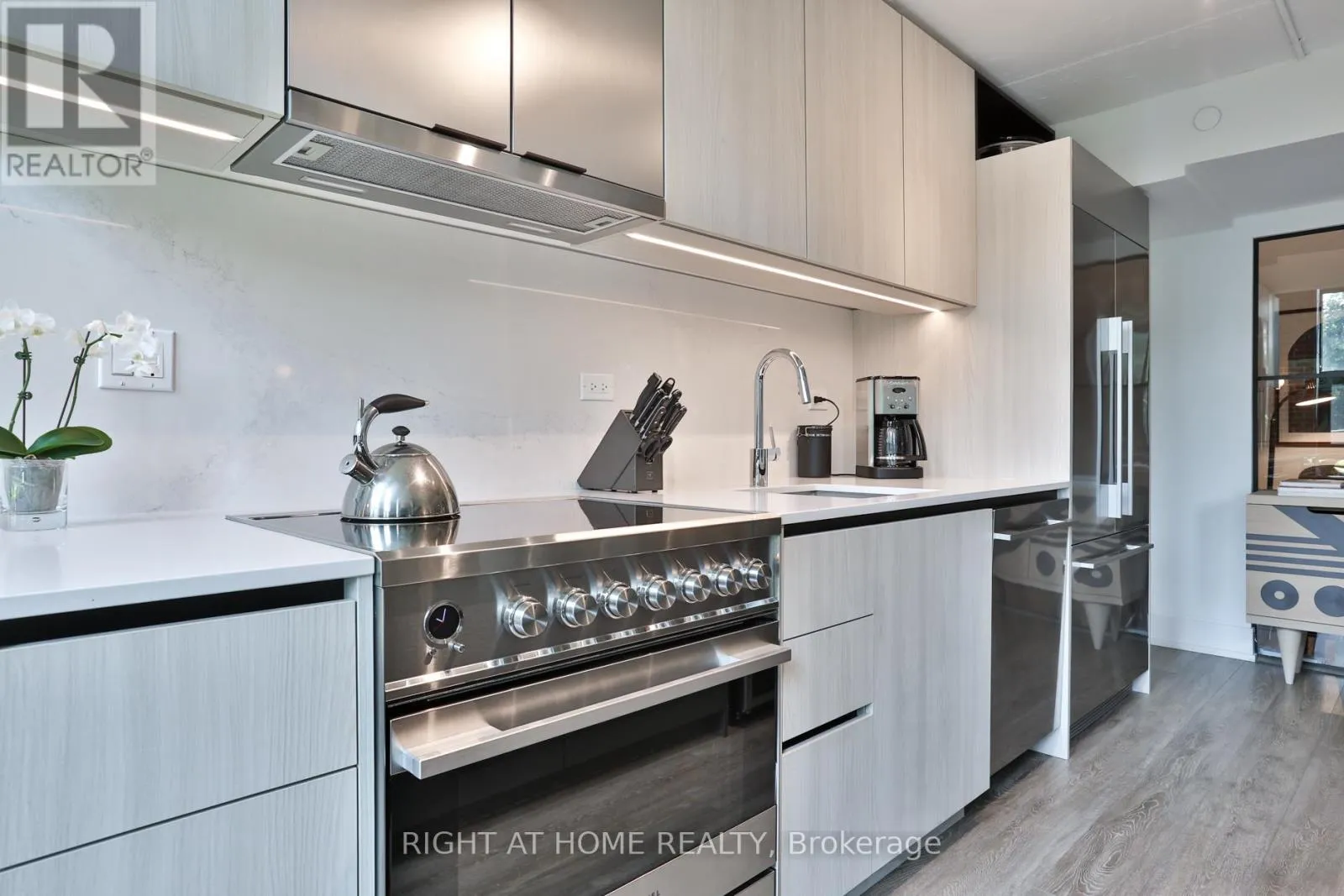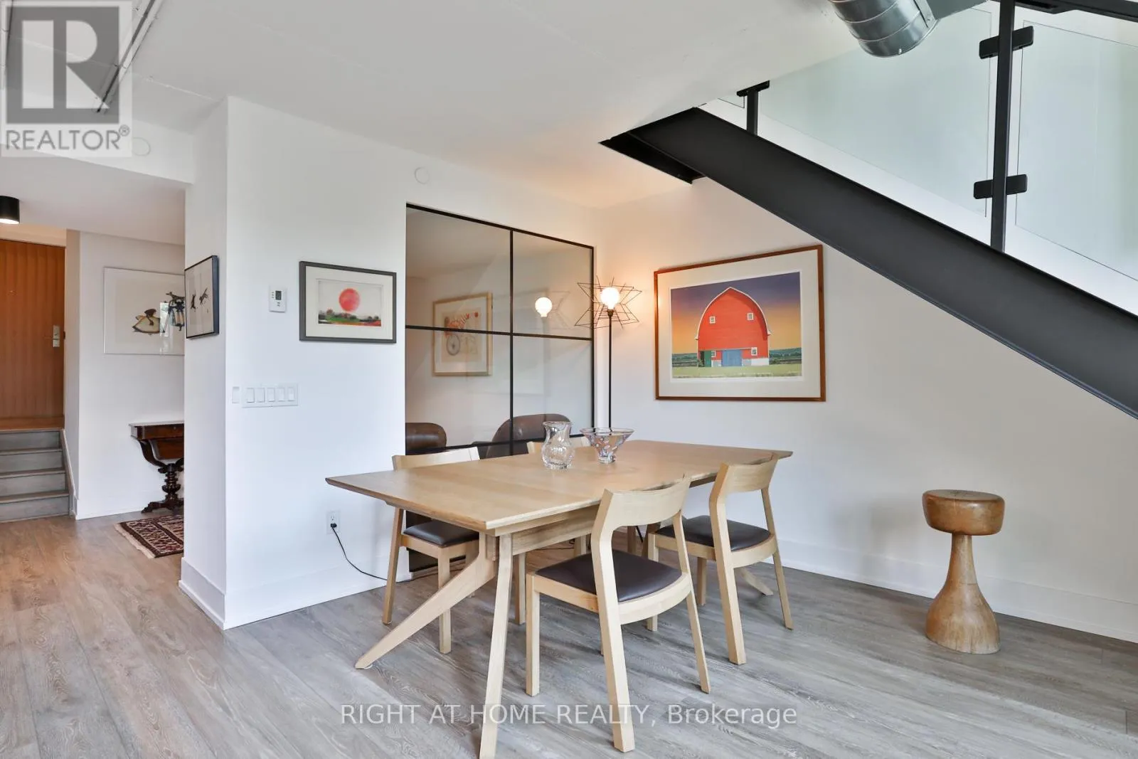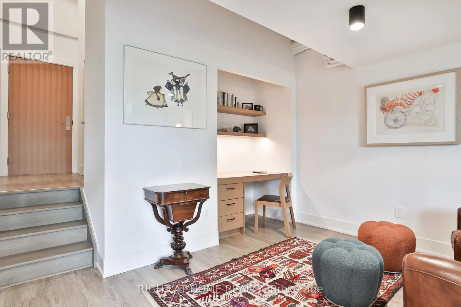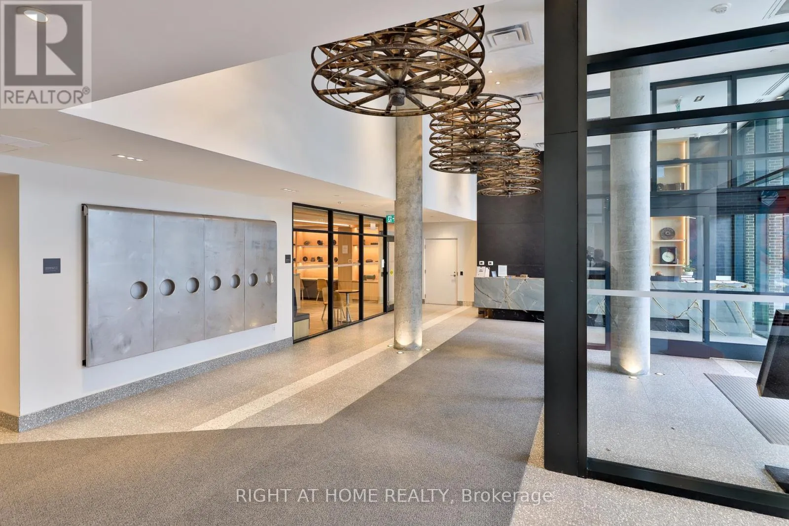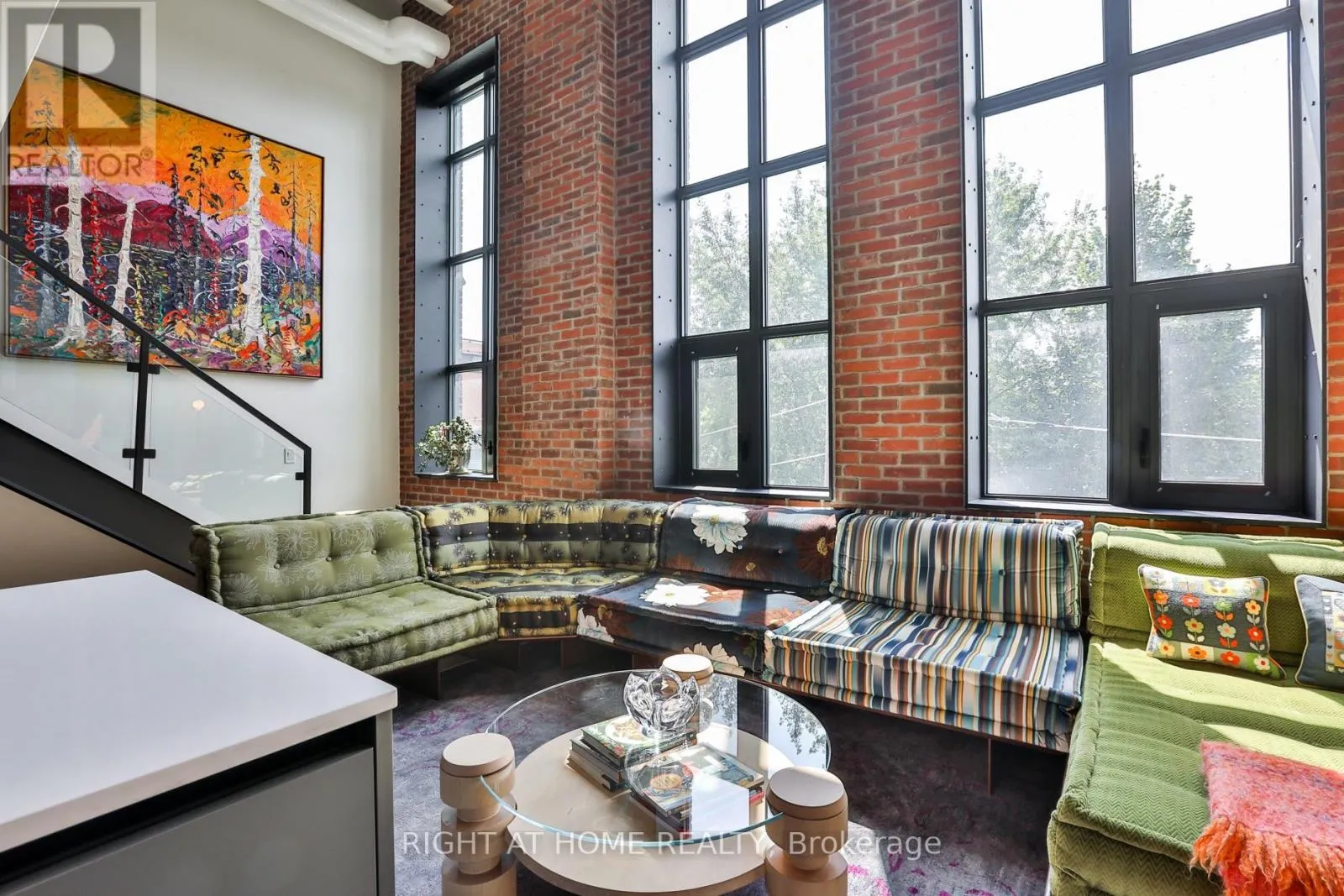 Eastern and Logan Something truly special at Wonder Condos - a sun-filled heritage loft with ideal west exposure, dramatic 17-foot ceilings, and original character throughout. Nearly 1,500 square feet of exceptional living space framed by soaring windows with integrated blinds, warm red brick accents, and a flexible floorplan accommodating up to three bedrooms. The upper loft is devoted to a serene primary suite with a generous walk-in closet and spa-like ensuite with dual vanities. A sprawling chefs kitchen anchors the main level, featuring an oversized island, abundant storage, premium appliances and induction range. Currently, the main floor includes a large office with custom built-ins and walk-in closet (easily reverted to a bedroom) plus a comfortable den, once a third bedroom. A full bathroom serves this level. Life at Wonder Condos offers a dynamic blend of history and modern convenience, with vibrant amenities including a rooftop terrace with BBQs and fire pits, co-working space, dog-wash station, well-equipped gym, and kids party room. Steps to the shops and dining of Queen East, and moments to Ashbridges Bay, Lake Ontario, and easy downtown/DVP access. An evolving neighbourhood within easy walking and cycling distance to the new Port Lands, Biidaasige Park, and the upcoming Ontario Line just blocks away. Exceptional space in a remarkable community. (id:27476)