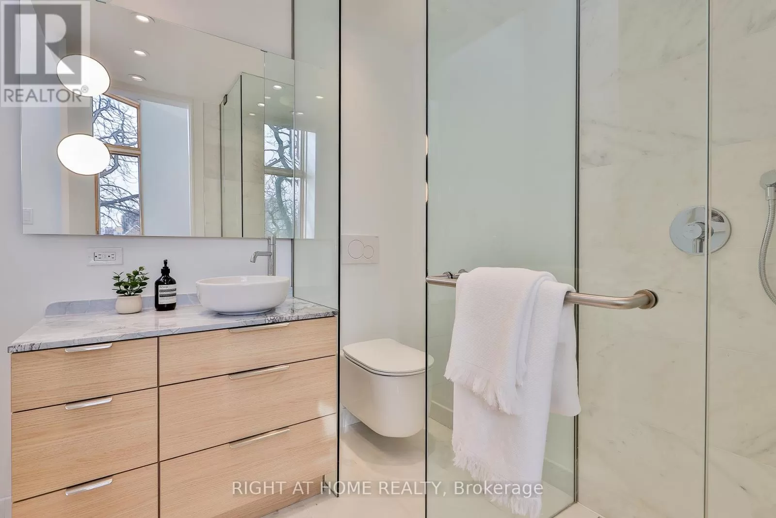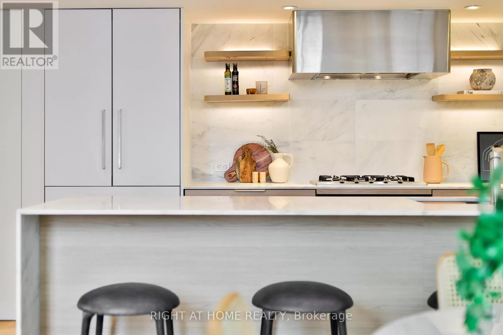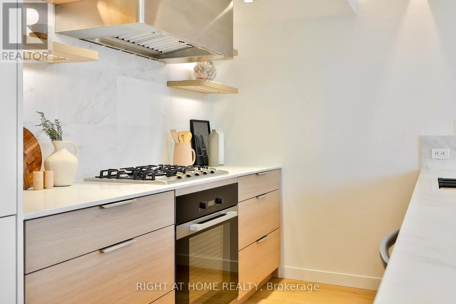 Cross Streets: Brunswick and Sussex. ** Directions: north from Harbord or west along Susses. Be first to call this Penthouse "home" at Brunswick Lofts! A bright and modern corner Penthouse with private terrace in the trees in a rare boutique building in the heart of the Annex. This sun-filled and stylish suite offers a generous floorplan of almost 1,100 square feet, in a just-completed heritage conversion of only seven suites. Spanning two levels, this west Penthouse features a private entry with foyer and offers exceptional volume, tremendous attention to modern details and a one-of-a-kind roofline that creates a unique double-height living room flooded with natural light. A custom kitchen with white oak cabinetry, natural stone surfaces, integrated Miele appliances, gas cooktop, oversized island with wine fridge perfect for avid chefs and great entertaining. Upstairs, the quiet primary suite features tailored built-ins and a bright ensuite with soaker tub and shower. Main floor powder room, great storage and the warmth and elegance of loft living. Permit street parking for 2 cars, and steps to Bloor, Harbord Village, U of T and transit. Heritage architecture and contemporary craftsmanship in an outstanding location. HST included, and full Tarion warranty. (id:27476)