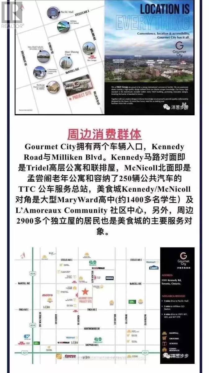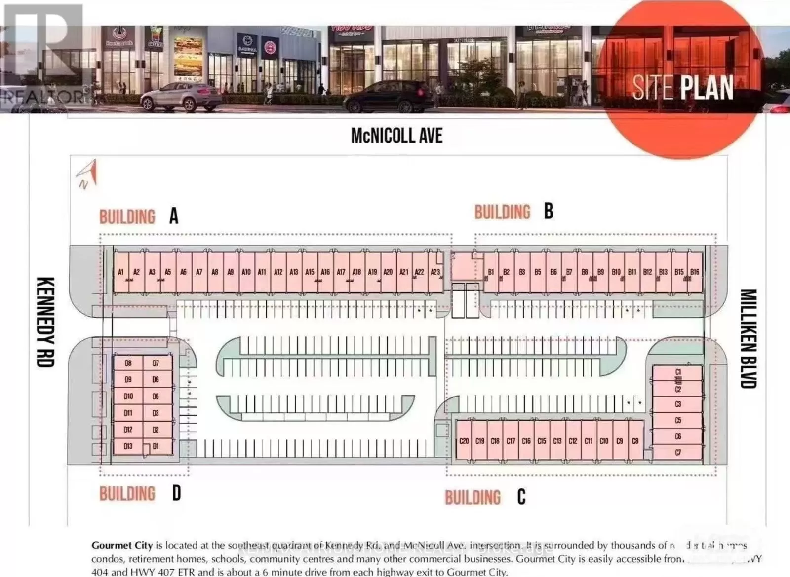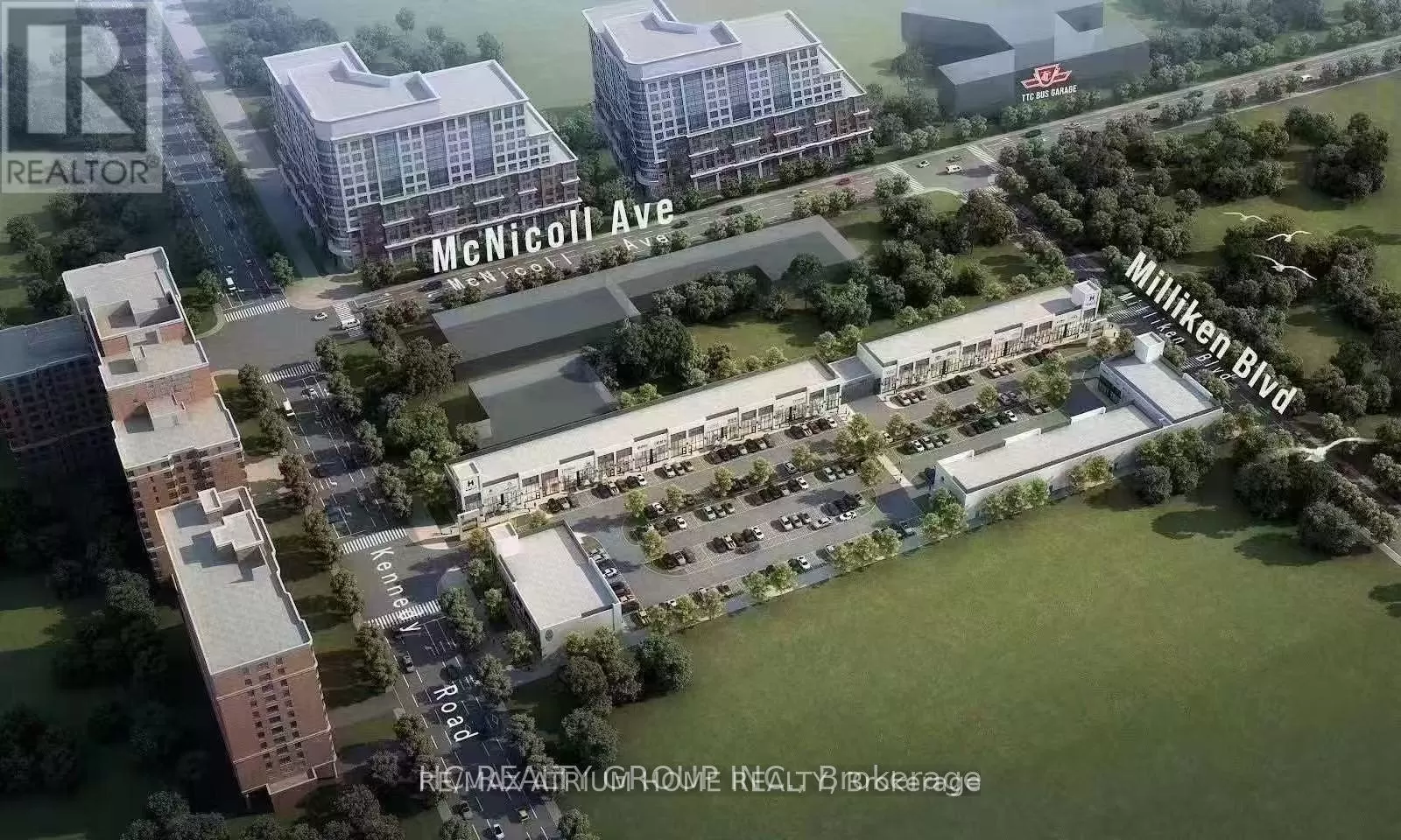 Cross Streets: Kennedy/Mcnicoll. ** Directions: Kennedy Rd. ** Frontage SIGNAGE on KENNEDY ROAD *** Gourmet City Commercial Condos is a newly developed culinary hub in Scarborough, ideally located at the southeast corner of Kennedy Road and McNicoll Avenue. This project offers excellent exposure and accessibility from both Kennedy Road and Milliken Boulevard. Developed by H & H Group, the plaza features modern architecture and high-quality finishes. The site benefits from high visibility and consistent foot traffic, making it ideal for a wide range of business opportunities.This is a brand-new unit with 20-foot high ceilings and in raw condition, ready for customization. The listing includes two combined units (D3 + D11), totaling 1,136 square feet (see floorplan). Permitted uses include restaurant, dine-in bakery, café, dessert shop, bubble tea, bar, and moreperfect for serving diverse cultural tastes.Just minutes from Highways 404 and 407. (Tax estimate $1485/mon, Management fee $395/mon, Insurance estimate $100/mon). Unit D11 faces Kennedy Road for prime visibility, while Unit D3 faces the interior parking lot. Features include two entry doors and two electrical panels for flexible use. (id:27476)