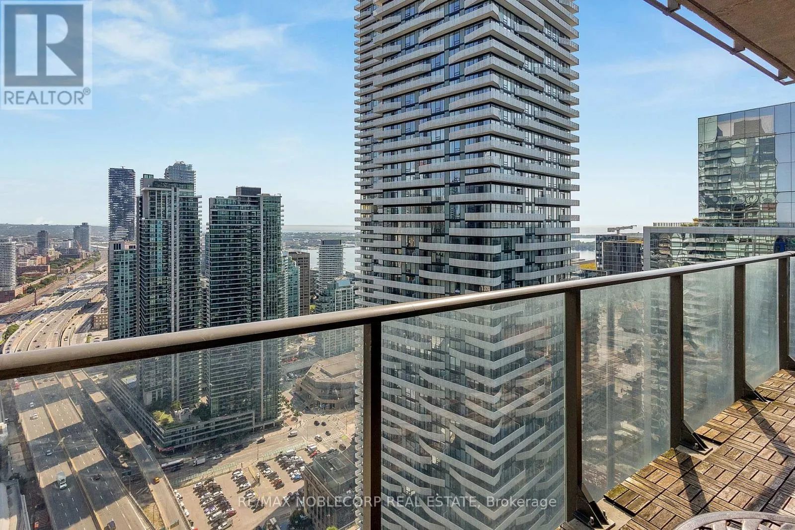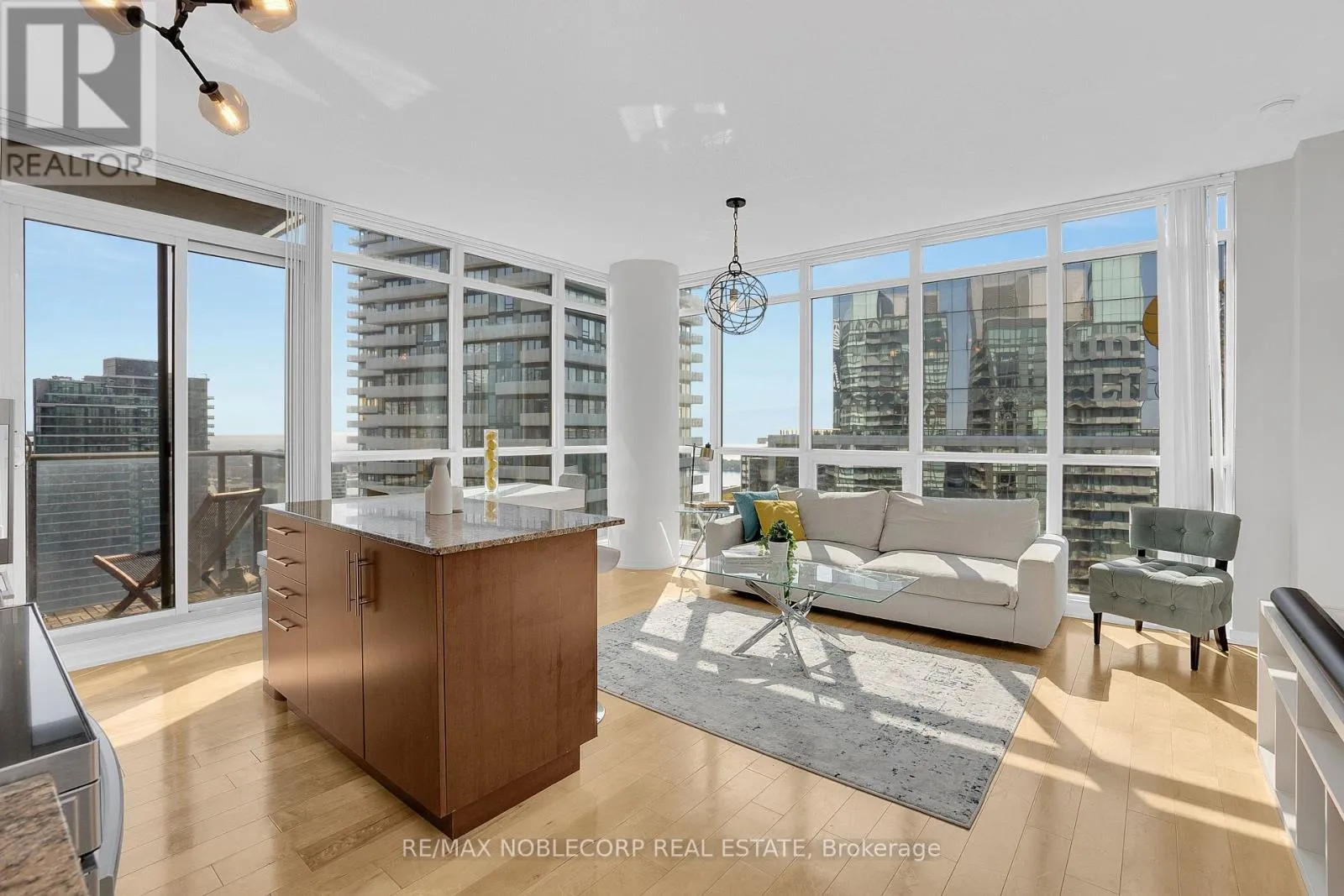 YORK & BREMNER Prestigious and highly sought-after Maple Leaf Square Residence. Stunning high-ceiling 44th-floor condo with floor-to-ceiling wrap-around windows, flooding the space with natural light. Featuring upgraded appliances, a kitchen island, extended cabinets, upgraded light fixtures, and hardwood flooring. Enjoy the master ensuite and a smart split two-bedroom layout. Relax on the large balcony with amazing SW views. Includes owned parking, locker, and heat. A perfect blend of luxury and convenience! The Seller agrees, at their own expense, to replace the flooring in the property prior to closing. The flooring material and installation will be completed to a professional standard and shall be finished before the date of possession. (id:27476)