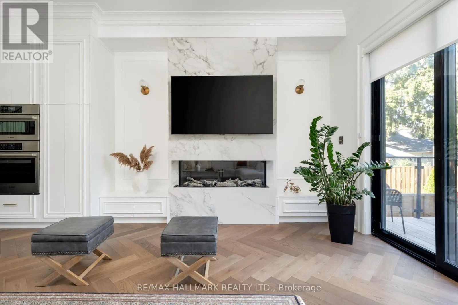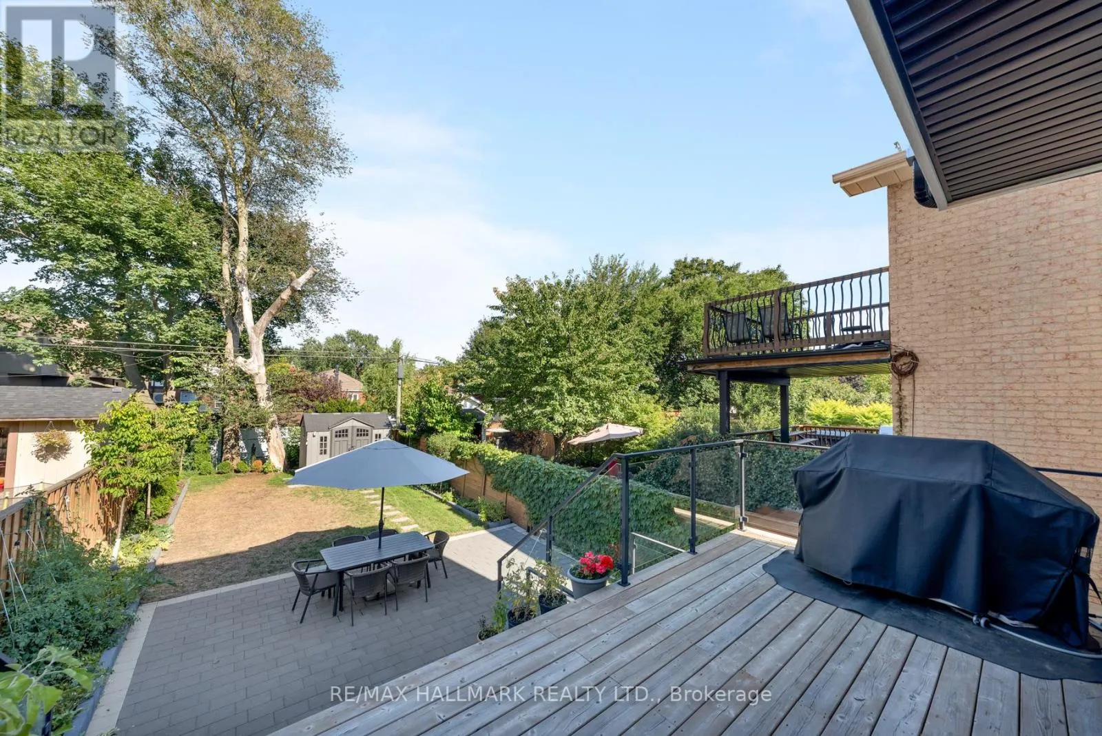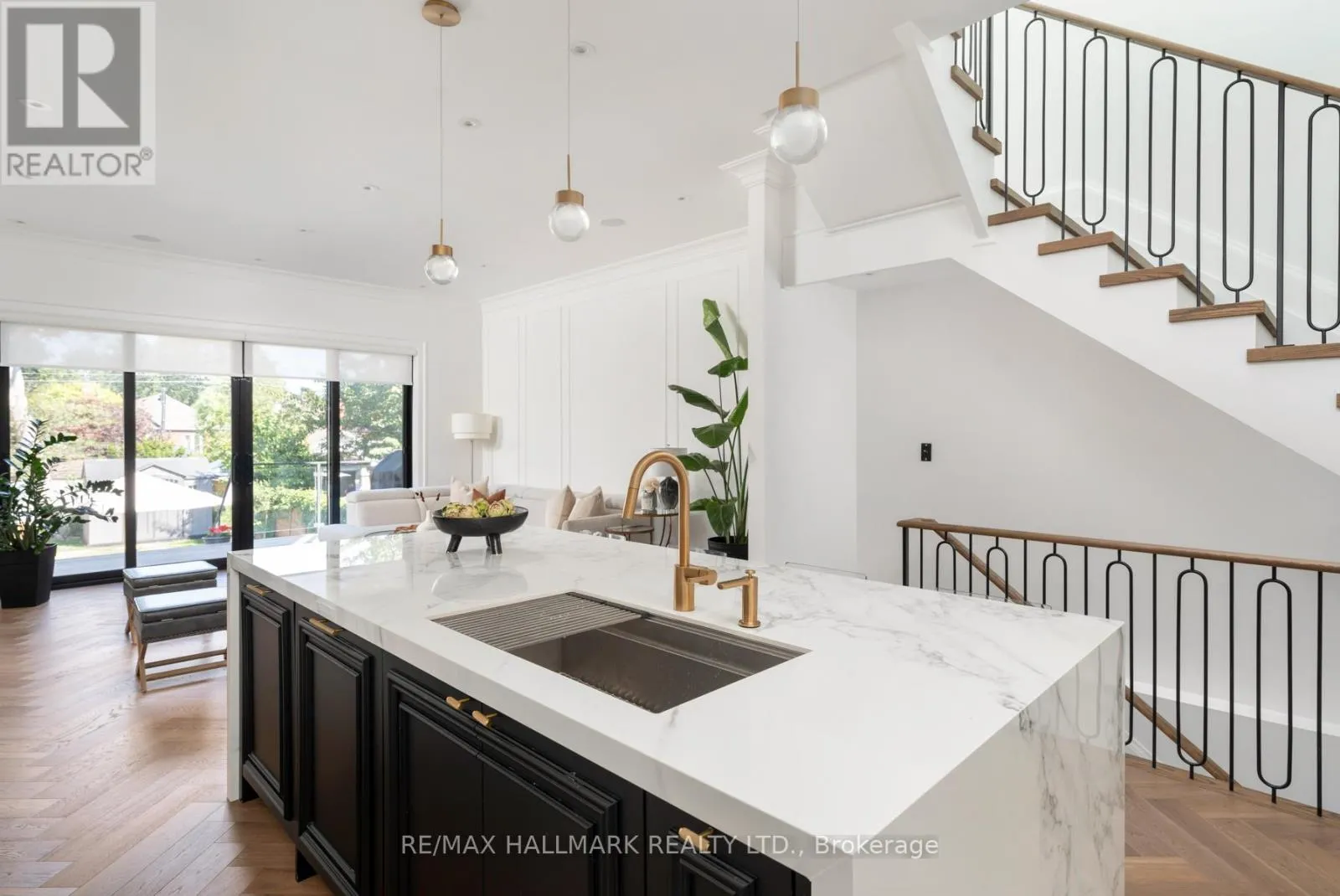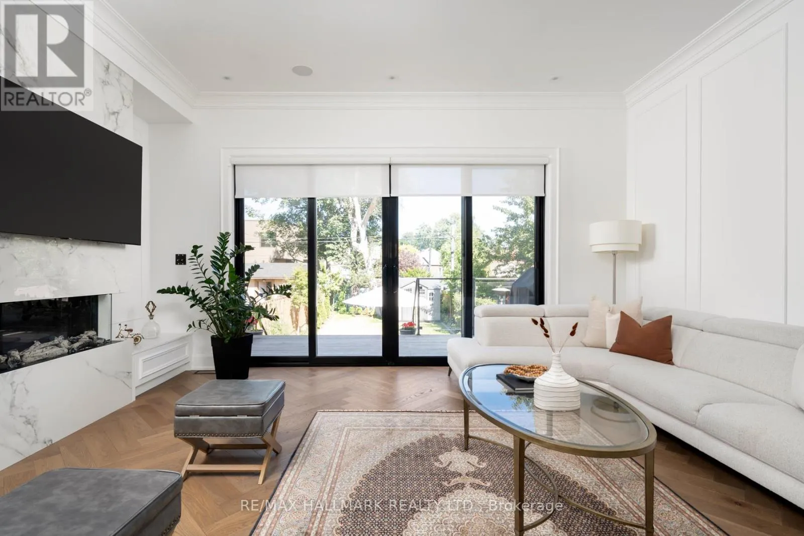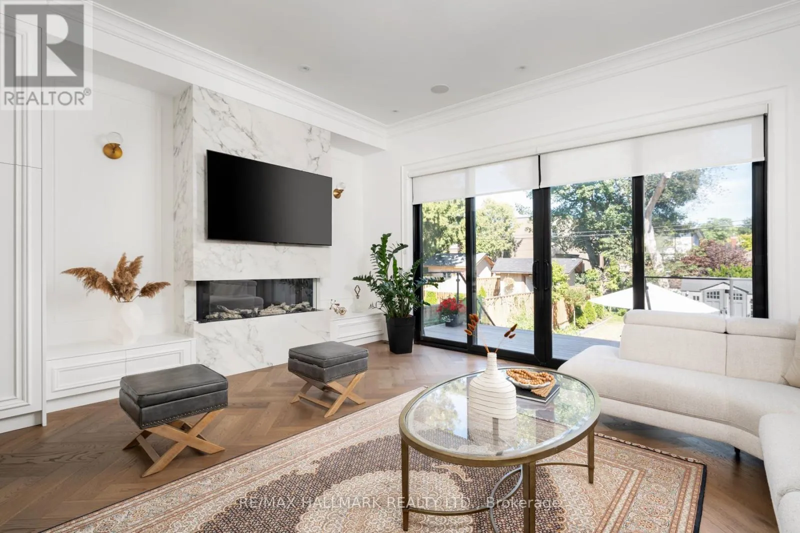 Cross Streets: Cosburn Ave & Coxwell Ave. ** Directions: From Cosburn Ave turn south on Linsmore Cres. The property is on the left. Welcome to this fabulous 4+1 bed, 4.5 bath, two-storey home, thoughtfully designed with a unique layout & loaded with high-end finishes throughout, offering style, functionality & smart living. Located in a family-friendly neighborhood just steps from Dieppe Park & within one of the city's most desirable school districts. Step inside to discover gorgeous hardwood floors, wall paneling, complemented with skylights & soaring ceilings. The main flr features a fabulous layout with a spacious foyer, a few steps up, you will find the formal living & dining room offering an inviting space with full wall paneling, b/i bar display, and integrated ceiling speakers. From there, three steps lead down to the show-stopping kitchen & family rm with a massive 4-panel glass door that opens directly to the private backyard. A magazine-worthy kitchen featuring a striking porcelain island, matching porcelain countertops & backsplash, & a top-of-the-line appliances. The family room is equally impressive with a sleek fireplace framed by a full porcelain wall, custom wood wall panels & b/i speakers. A conveniently located powder room completes the main living area. Upstairs, a large skylight fills the hallway with natural light, leading to four bedrooms, two with their own private ensuites, plus an additional 3PC bath. A conveniently located laundry area is tucked into a custom-built closet on this level. The primary bedroom offers three b/i closets, a 5PC ensuite, sound system, and sliding door to a private balcony overlooking the backyard. The lower level offers extra living space featuring high ceilings, garage access, an extra bedroom, a 3PC bath, a combined kitchen/living area, laundry & W/O to the backyard. Step outside to a beautifully landscaped & fully fenced backyard complete with a large deck with glass railing, interlock patio, garden shed, BBQ gas hookup, & an irrigation system. This Masterpiece Checks All The Boxes! (id:27476)