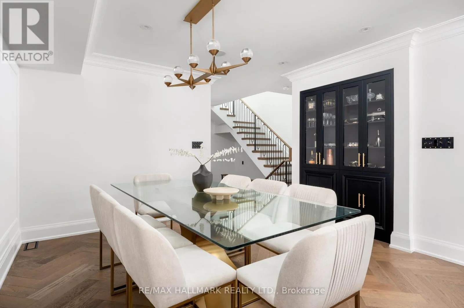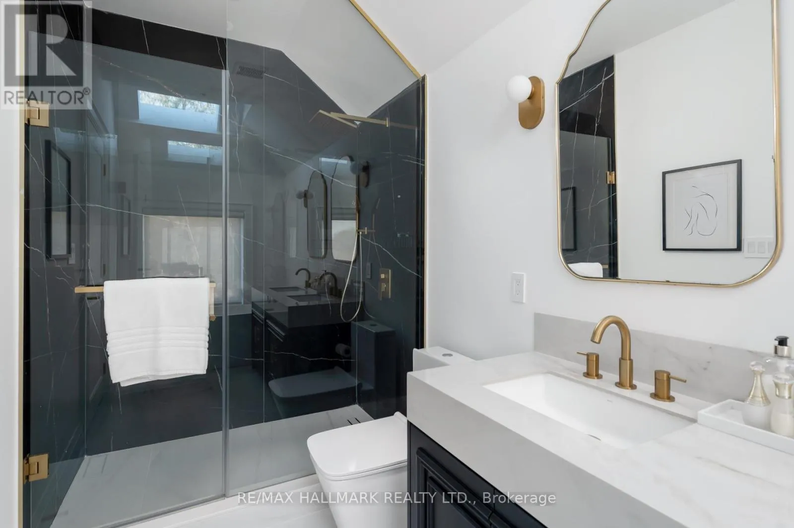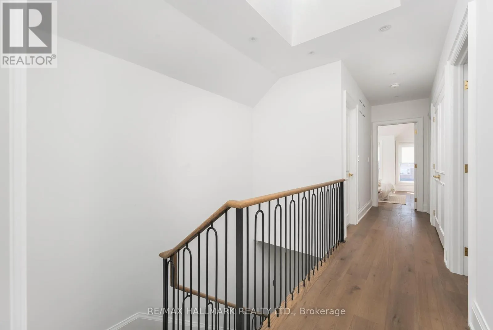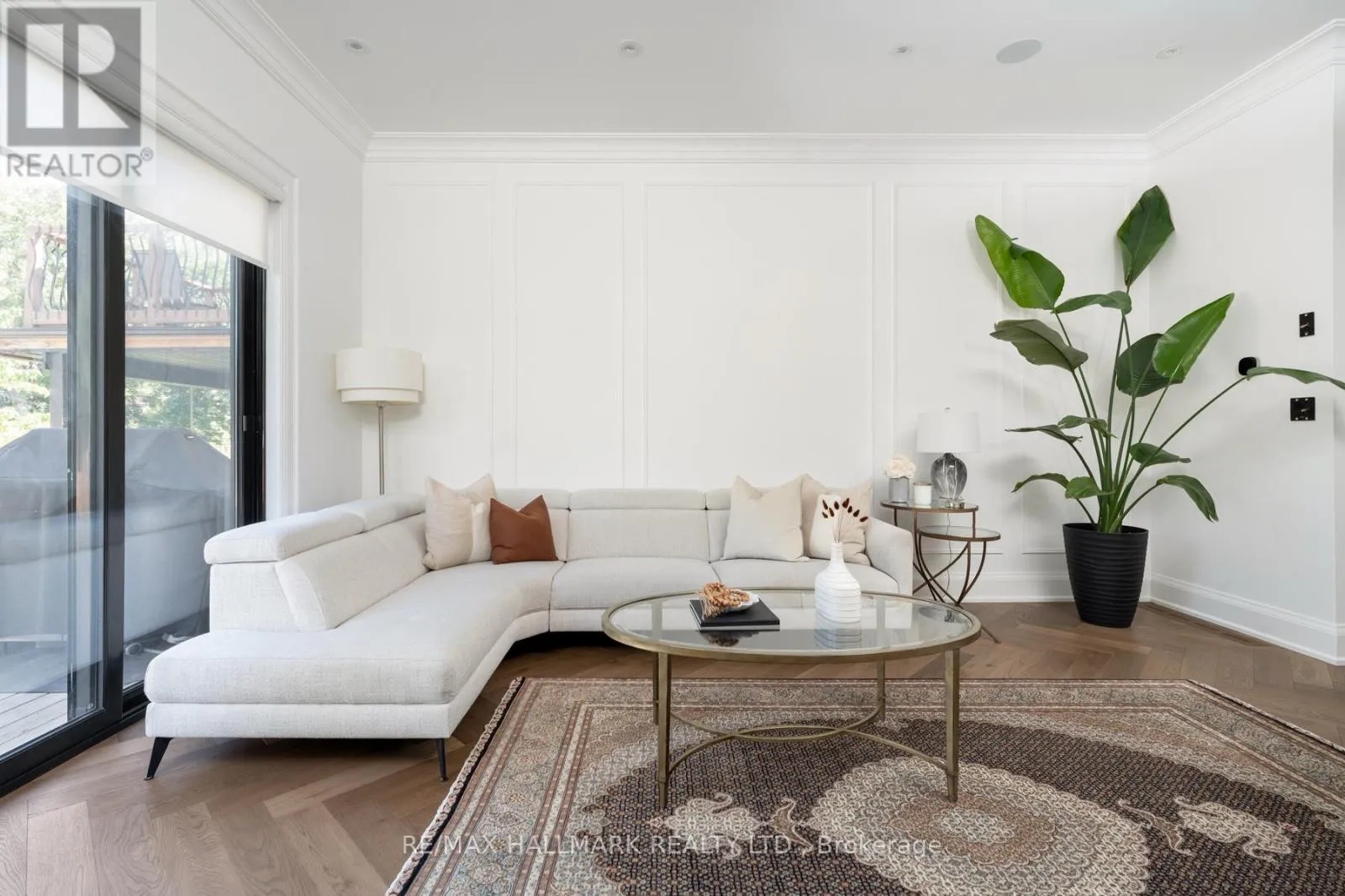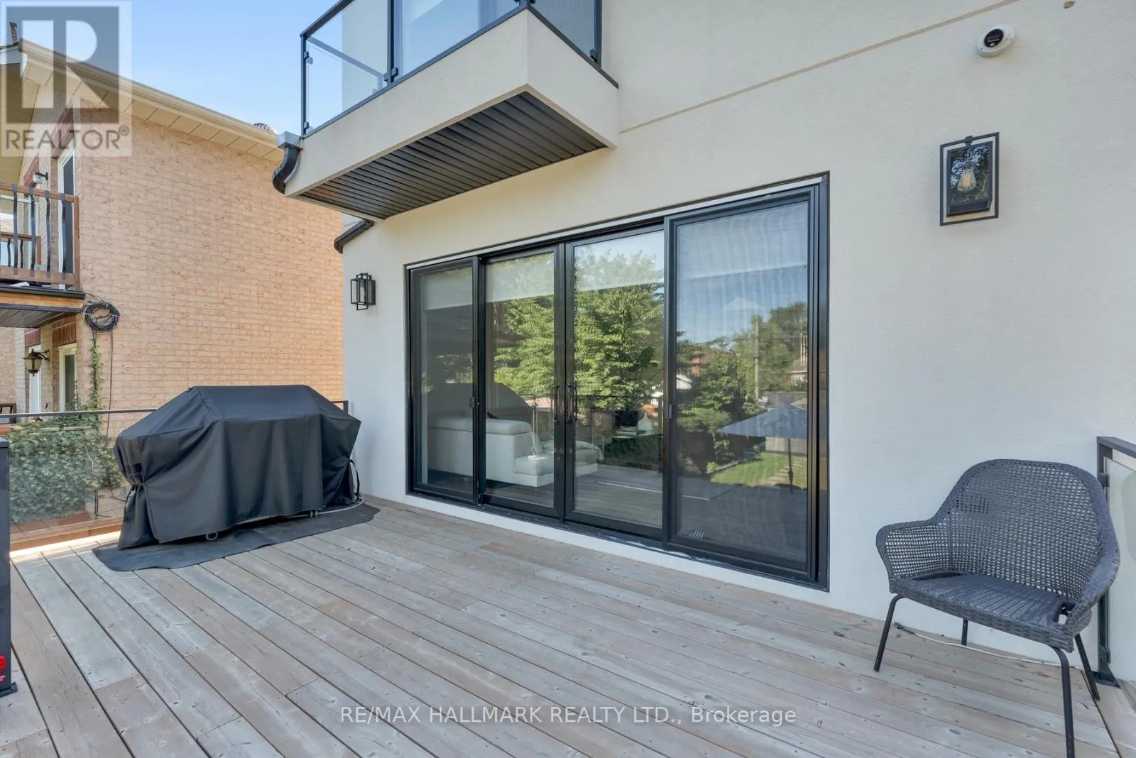 Cross Streets: Cosburn Ave & Coxwell Ave. ** Directions: From Cosburn Ave turn south on Linsmore Cres. The property is on the left. Welcome to this fabulous 4+1 bed, 4.5 bath, two-storey home, thoughtfully designed with a unique layout & loaded with high-end finishes throughout, offering style, functionality & smart living. Located in a family-friendly neighborhood just steps from Dieppe Park & within one of the city's most desirable school districts. Step inside to discover gorgeous hardwood floors, wall paneling, complemented with skylights & soaring ceilings. The main flr features a fabulous layout with a spacious foyer, a few steps up, you will find the formal living & dining room offering an inviting space with full wall paneling, b/i bar display, and integrated ceiling speakers. From there, three steps lead down to the show-stopping kitchen & family rm with a massive 4-panel glass door that opens directly to the private backyard. A magazine-worthy kitchen featuring a striking porcelain island, matching porcelain countertops & backsplash, & a top-of-the-line appliances. The family room is equally impressive with a sleek fireplace framed by a full porcelain wall, custom wood wall panels & b/i speakers. A conveniently located powder room completes the main living area. Upstairs, a large skylight fills the hallway with natural light, leading to four bedrooms, two with their own private ensuites, plus an additional 3PC bath. A conveniently located laundry area is tucked into a custom-built closet on this level. The primary bedroom offers three b/i closets, a 5PC ensuite, sound system, and sliding door to a private balcony overlooking the backyard. The lower level offers extra living space featuring high ceilings, garage access, an extra bedroom, a 3PC bath, a combined kitchen/living area, laundry & W/O to the backyard. Step outside to a beautifully landscaped & fully fenced backyard complete with a large deck with glass railing, interlock patio, garden shed, BBQ gas hookup, & an irrigation system. This Masterpiece Checks All The Boxes! (id:27476)