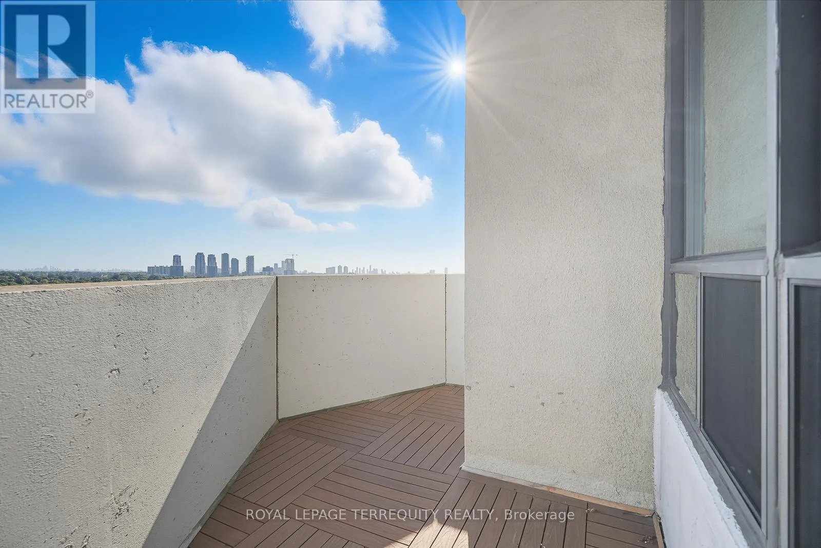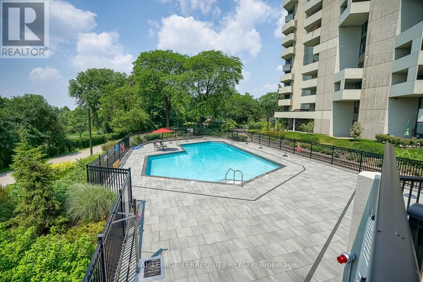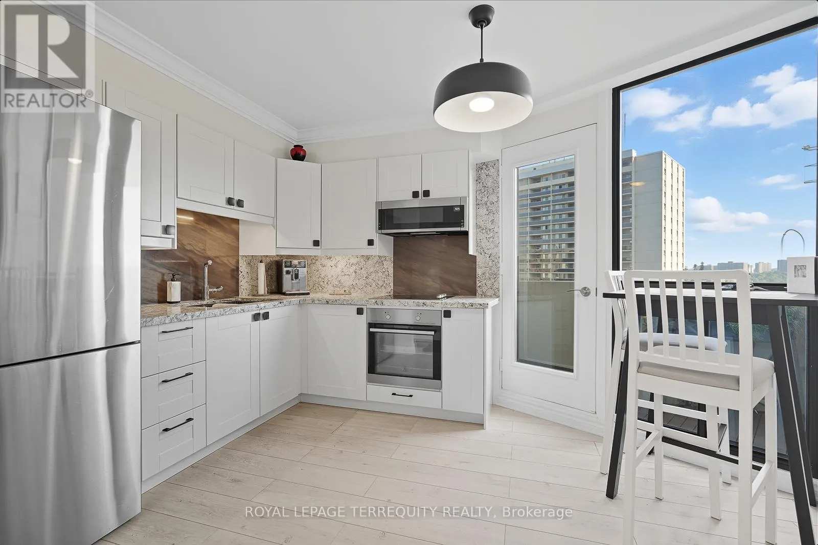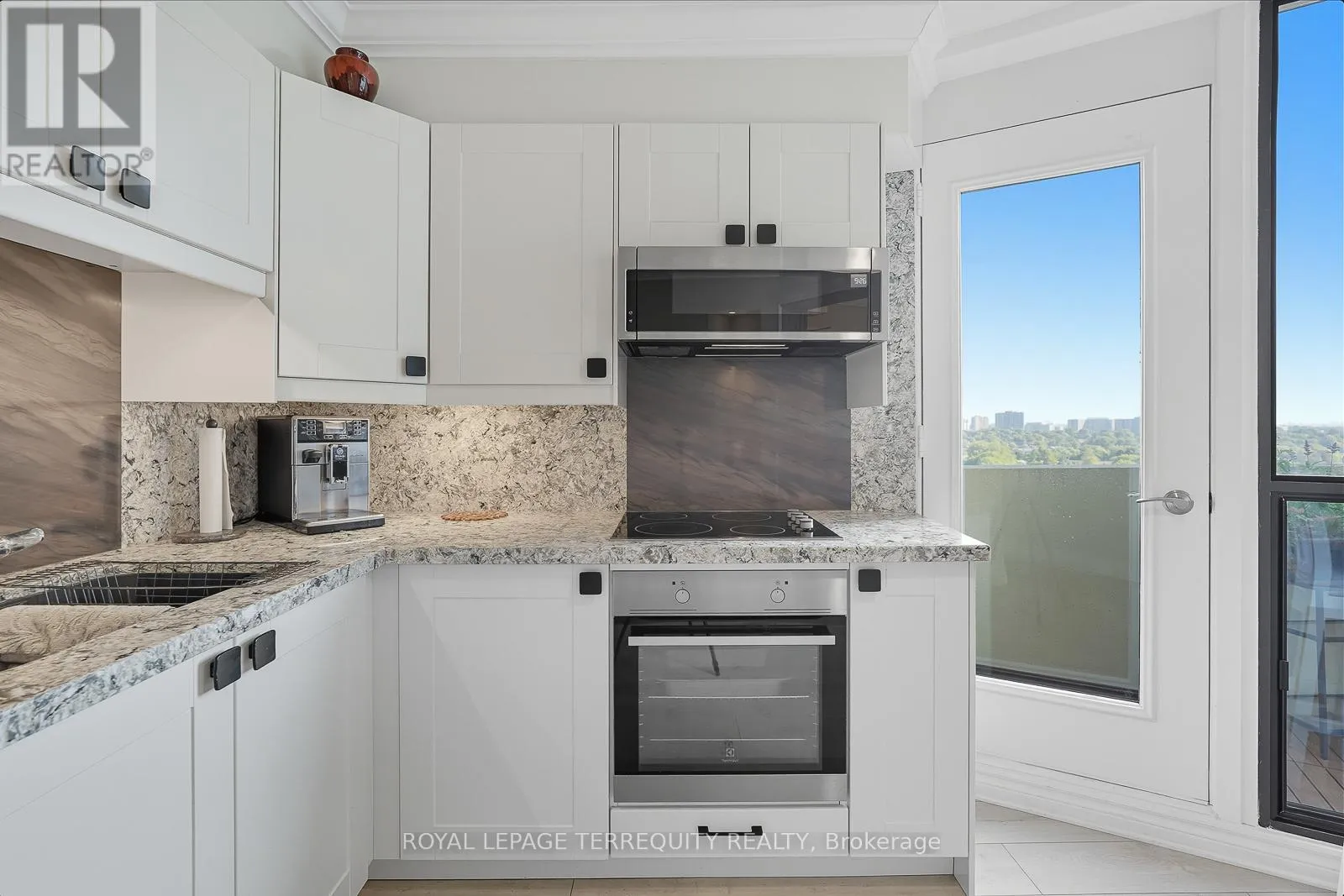 Burnhamthorpe/Mill WELCOME TO THE MASTERS. This 2-bedroom & 2 washroom one-level condo suite features a large master bedroom with an impressive walk-in closet, 3pc ensuite, and walk-out to private balcony. The stylish updated kitchen includes a walkout to a second balcony where you can enjoy barbecuing. The open concept living & dining area offers yet another walk-out to a balcony showcasing spectacular views of the downtown Toronto skyline.DO NOT MISS! (id:27476)