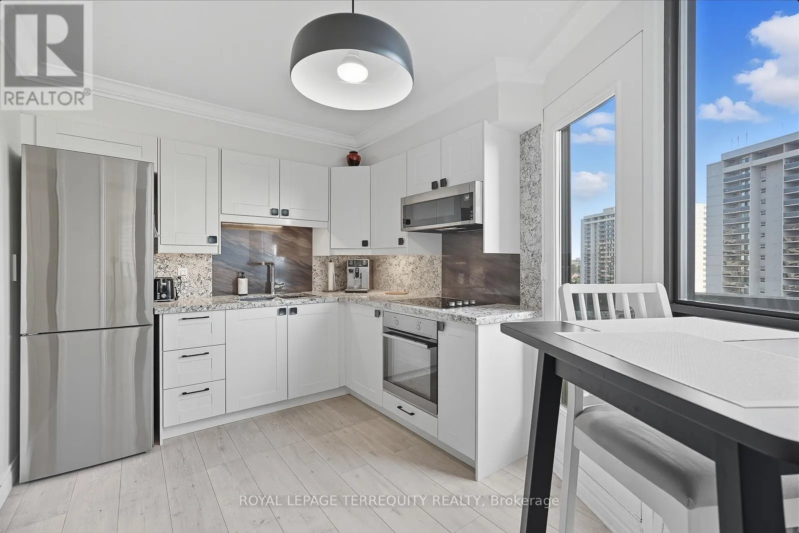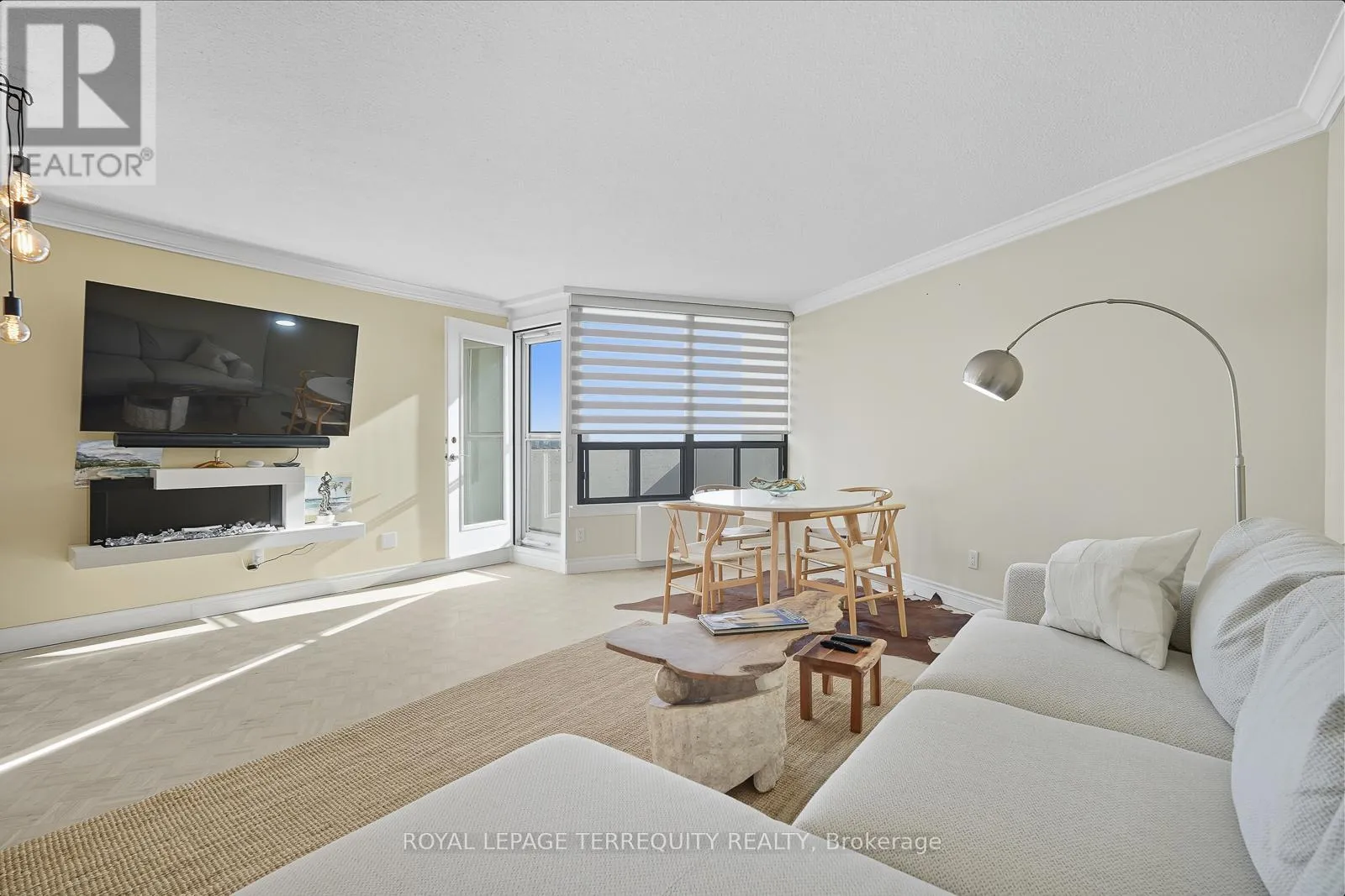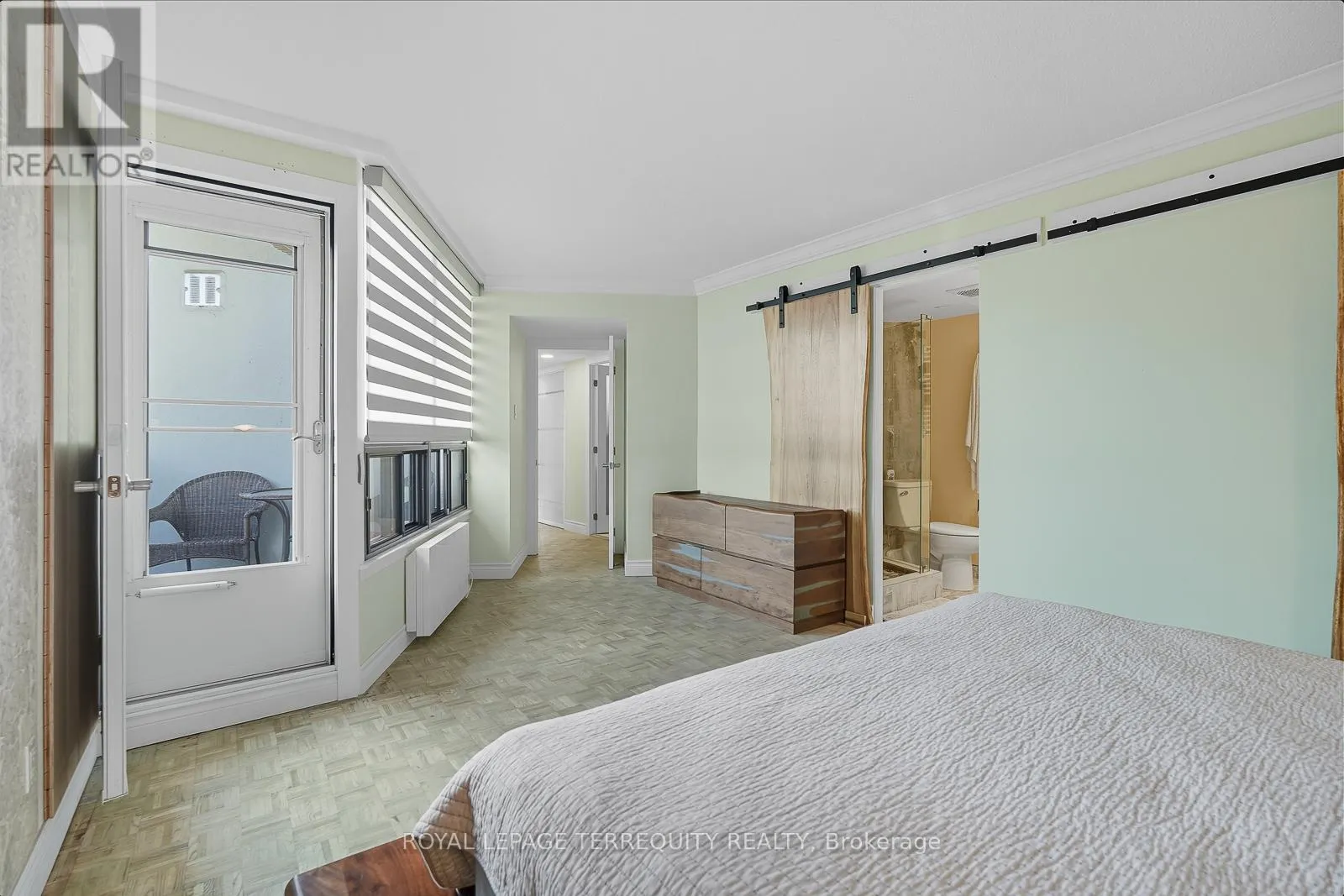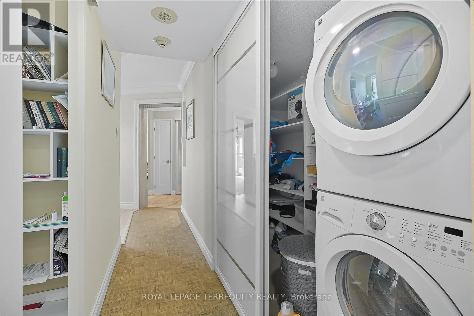 Burnhamthorpe/Mill WELCOME TO THE MASTERS. This 2-bedroom & 2 washroom one-level condo suite features a large master bedroom with an impressive walk-in closet, 3pc ensuite, and walk-out to private balcony. The stylish updated kitchen includes a walkout to a second balcony where you can enjoy barbecuing. The open concept living & dining area offers yet another walk-out to a balcony showcasing spectacular views of the downtown Toronto skyline.DO NOT MISS! (id:27476)