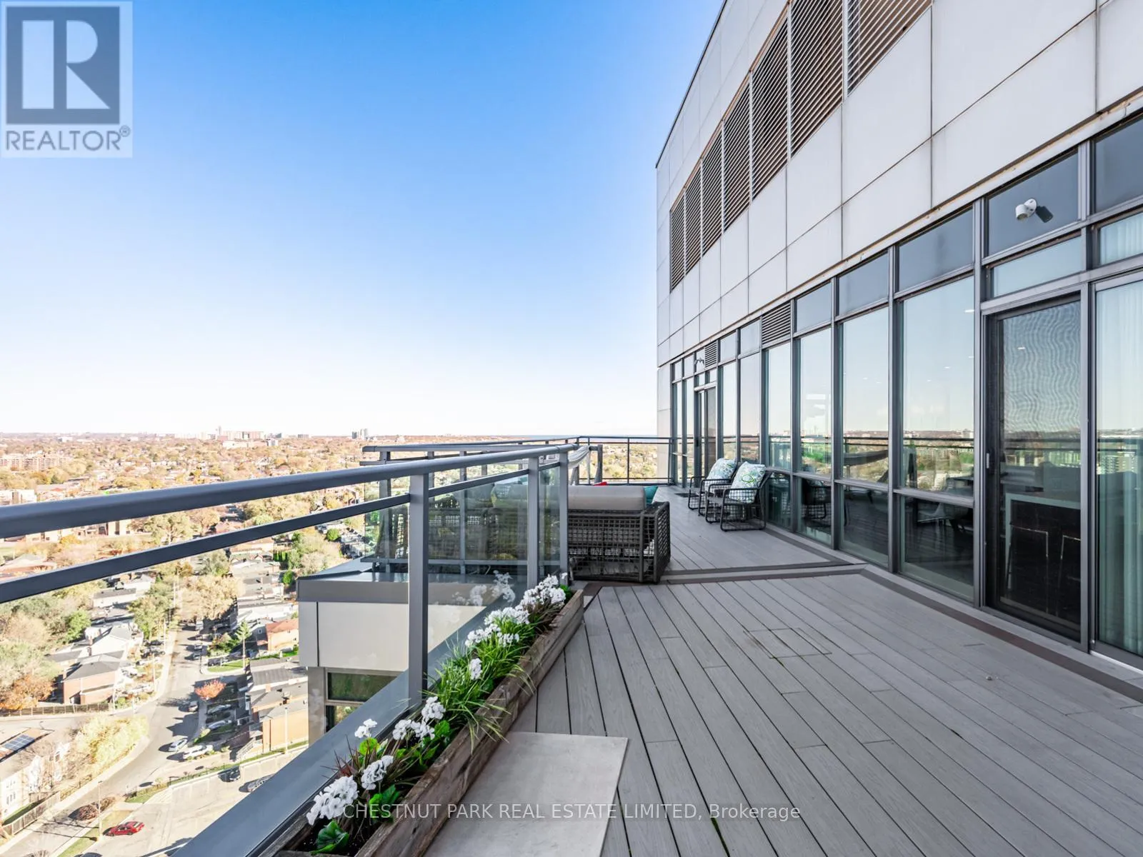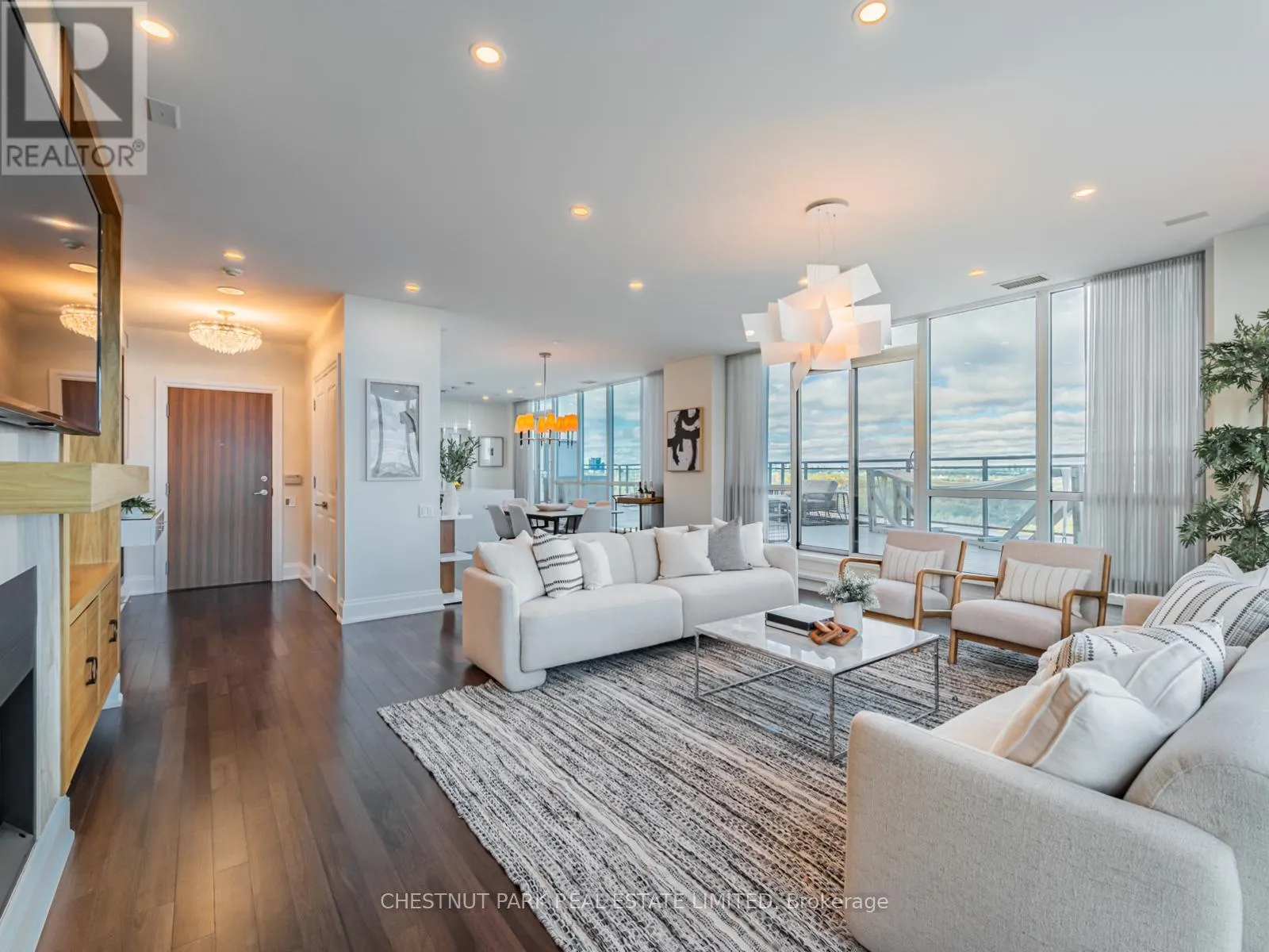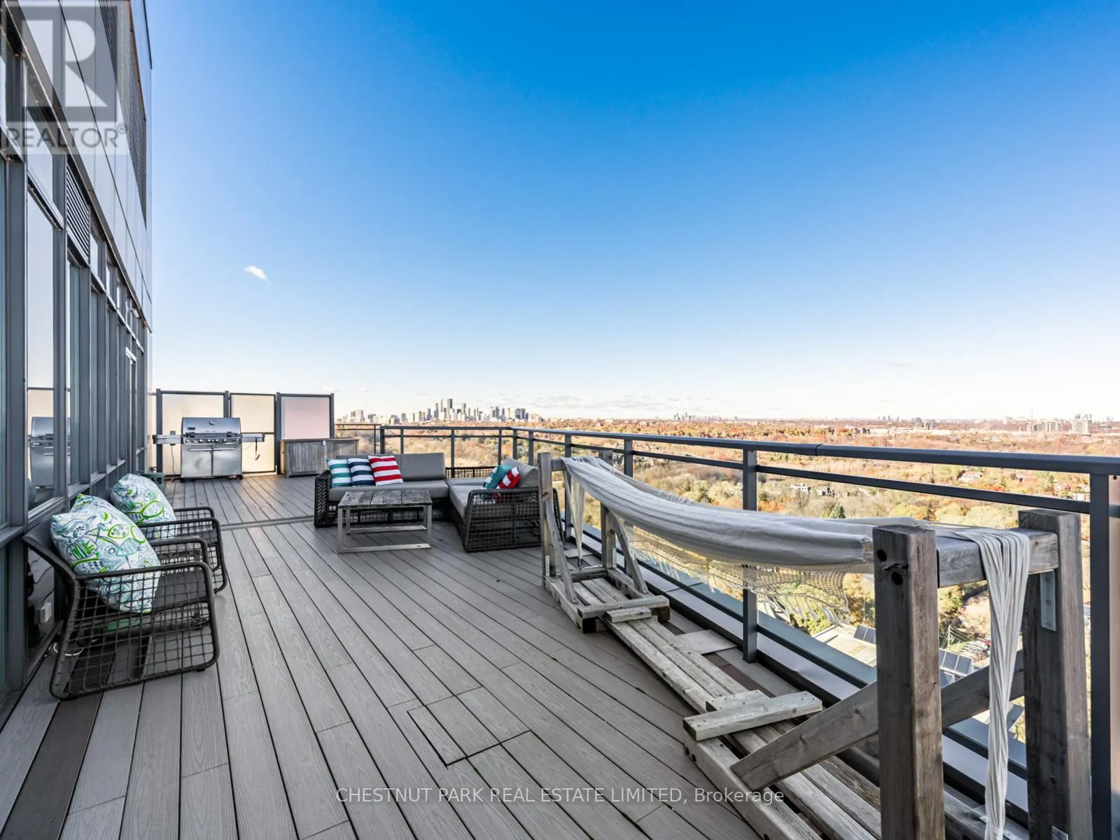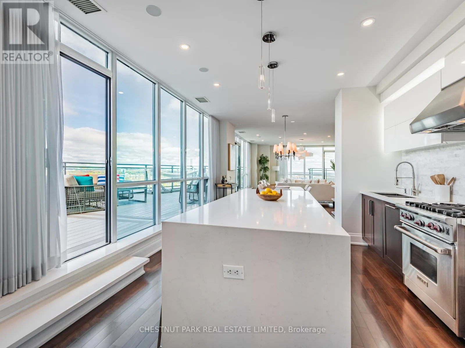 Broadview Ave & Mortimer Ave As one of only two penthouses in the building, this breathtaking corner suite offers panoramic north east views that stretch endlessly, providing a dramatic backdrop for daily life & evening relaxation. With 1,554 sq ft of beautifully designed & upgraded interiors and approx. 700 sq ft of outdoor space, this condo is bathed in natural light, thanks to the floor-to-ceiling windows that accentuate the open, airy atmosphere.The spacious, open-concept living & dining areas, accented by warm hardwood flooring & a cozy gas fireplace with custom built-ins, effortlessly connect to both a large terrace & a balcony. Imagine stepping out from either the living or dining room to savor the impressive skyline views, creating the perfect setting for entertaining or simply unwinding under the stars. A Bose sound system elevates the ambiance in the living, dining, office & terrace, providing a perfect soundtrack to complement every moment.Designed for culinary enthusiasts, the renovated kitchen boasts wolf & sub-zero appliances & ample space to create unforgettable meals. Featuring 2 generously sized bedrooms, a versatile den/office (which has a murphy bed & could serve as a 3rd bedroom), & 2 full bathrooms. A rare oversized terrace allows for outdoor lounging & BBQing while you take in the unobstructed views from your luxurious penthouse. With the added convenience of 2 underground side-by-side parking spaces & a locker for extra storage, this penthouse offers not only breathtaking beauty but also thoughtful practicality. Situated just minutes to the Brickworks, Playter Estates, the Danforth, with a walk score of 90, bike score of 98 & transit score of 94, you are just a few minutes to the subway & walking & biking trails. An incredible location that combines the best of nature and city conveniences. This suite combines design, stunning views, convenience & effortless luxury in the heart of our vibrant city. (id:27476)
