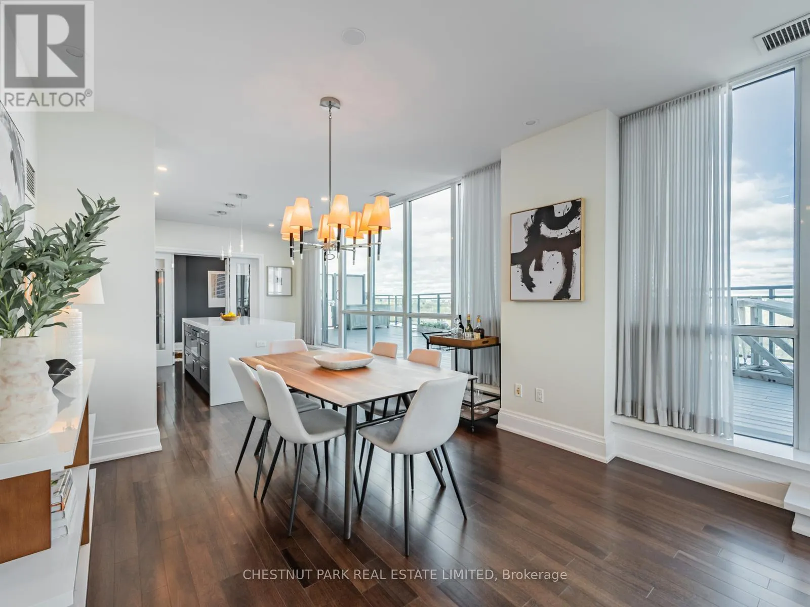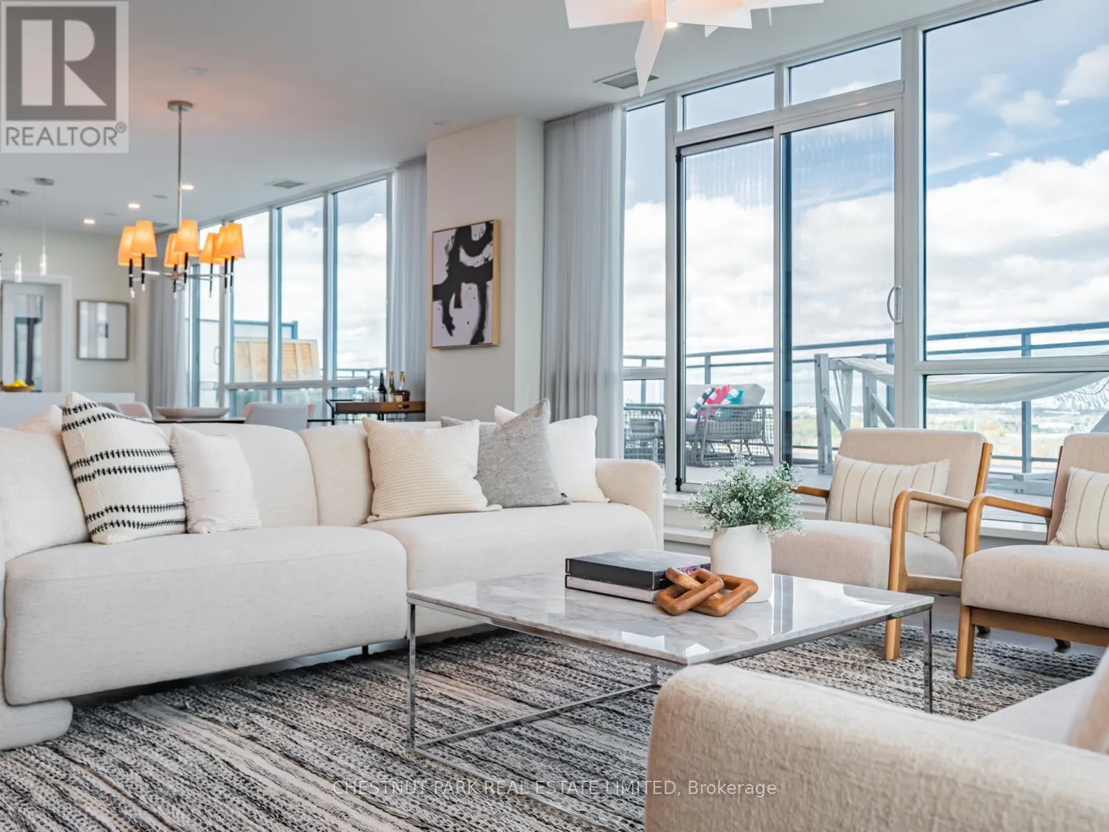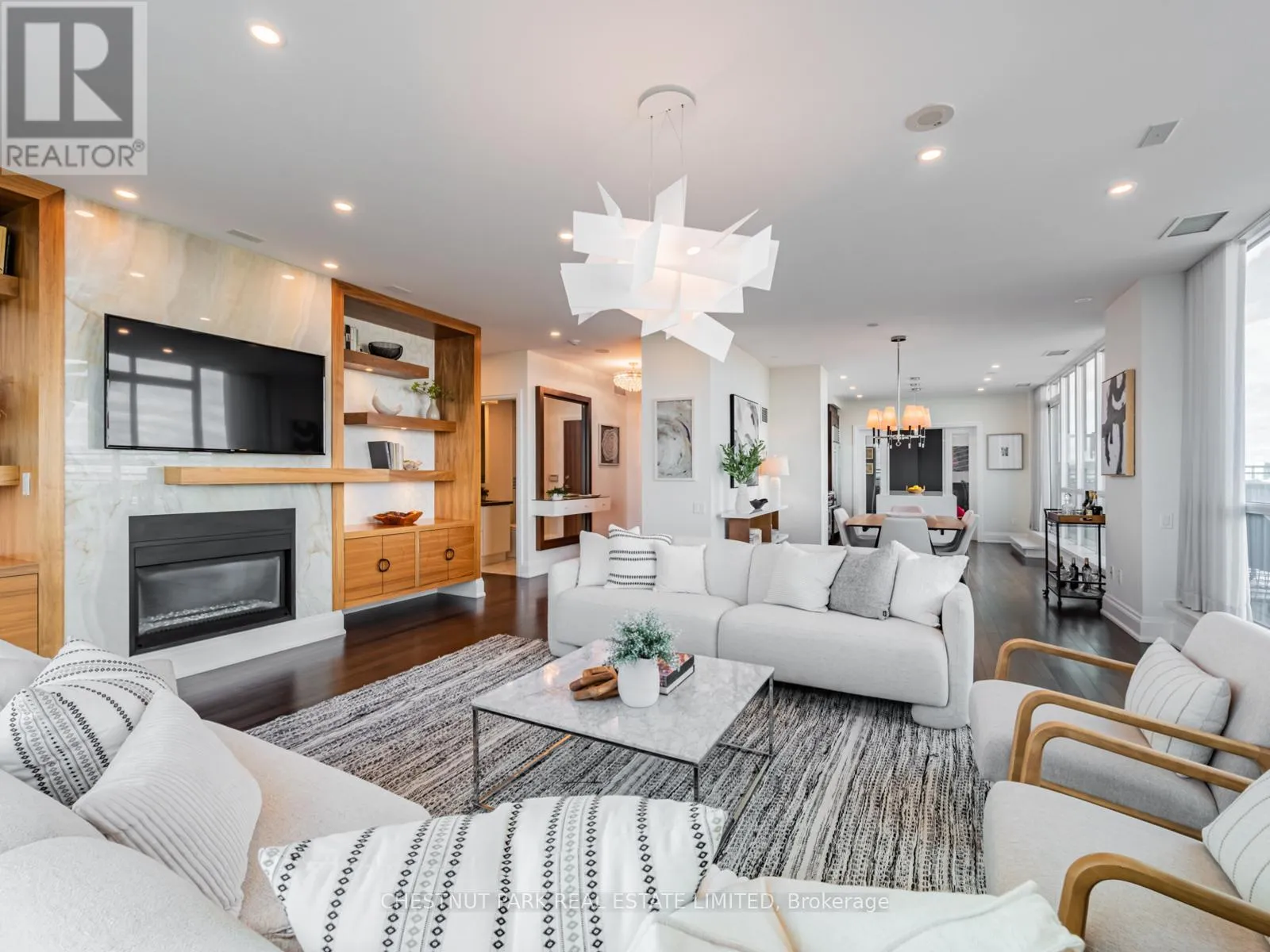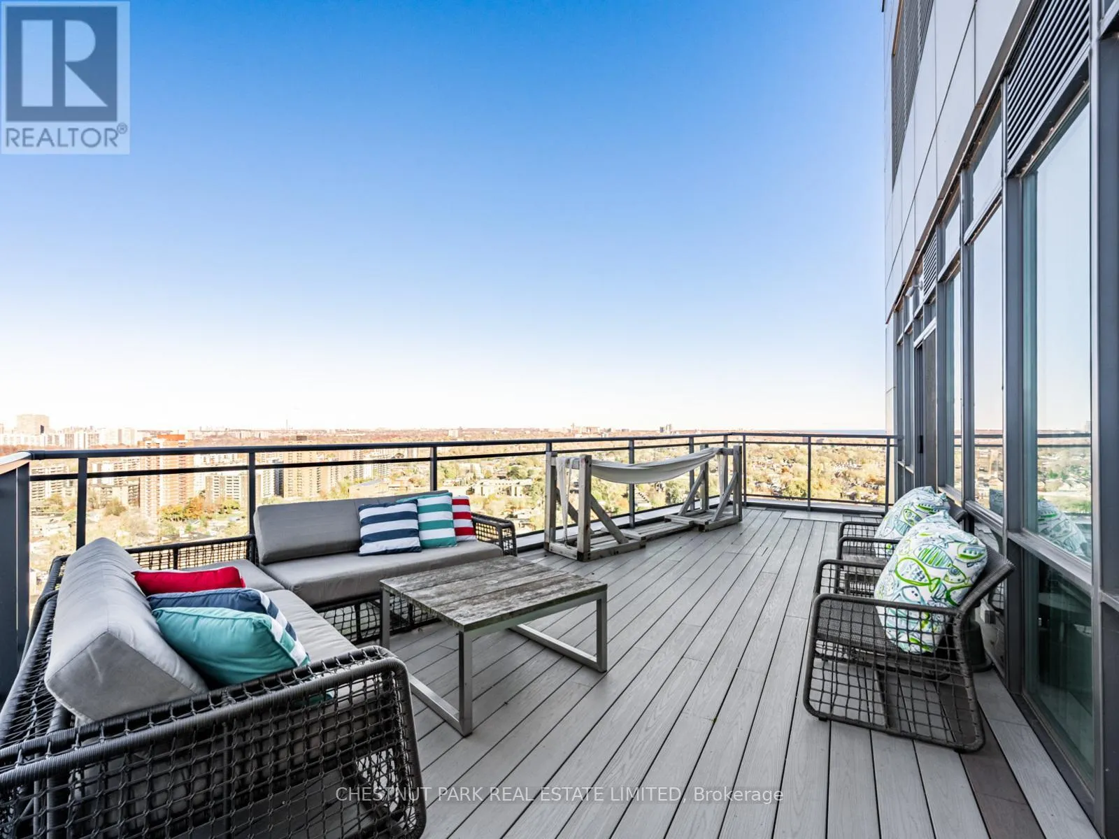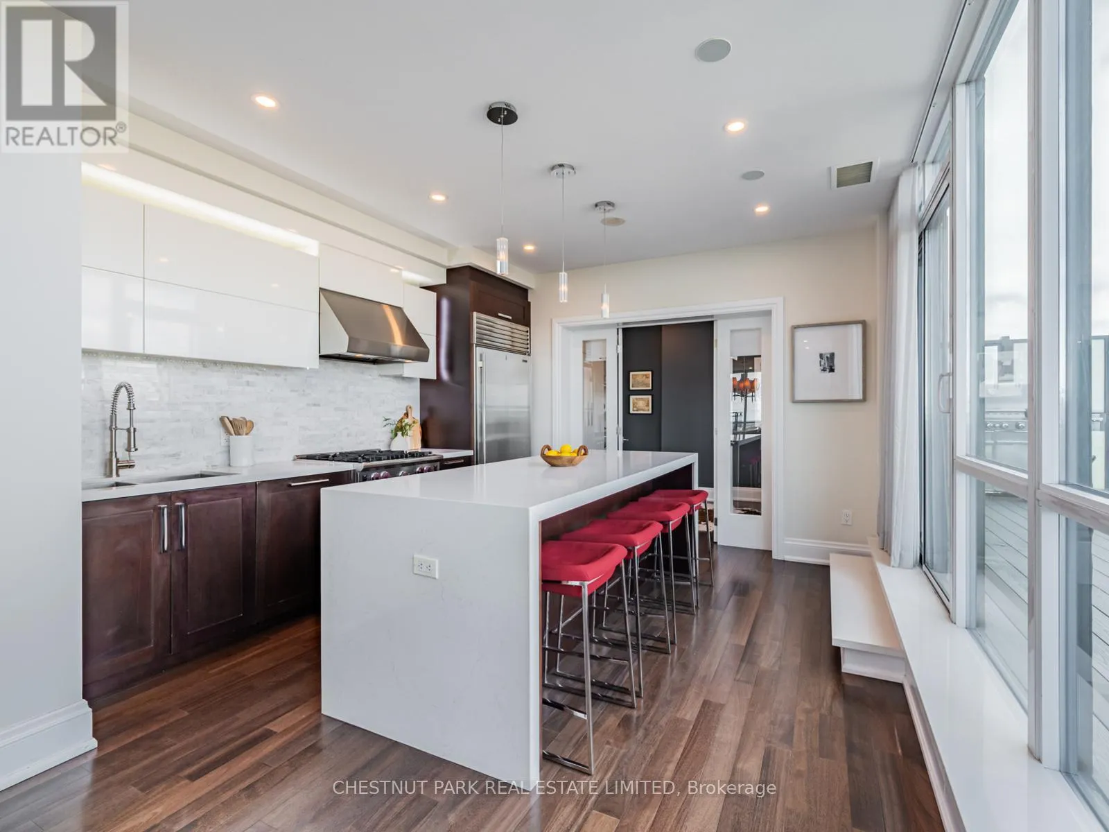Broadview Ave & Mortimer Ave As one of only two penthouses in the building, this breathtaking corner suite offers panoramic north east views that stretch endlessly, providing a dramatic backdrop for daily life & evening relaxation. With 1,554 sq ft of beautifully designed & upgraded interiors and approx. 700 sq ft of outdoor space, this condo is bathed in natural light, thanks to the floor-to-ceiling windows that accentuate the open, airy atmosphere.The spacious, open-concept living & dining areas, accented by warm hardwood flooring & a cozy gas fireplace with custom built-ins, effortlessly connect to both a large terrace & a balcony. Imagine stepping out from either the living or dining room to savor the impressive skyline views, creating the perfect setting for entertaining or simply unwinding under the stars. A Bose sound system elevates the ambiance in the living, dining, office & terrace, providing a perfect soundtrack to complement every moment.Designed for culinary enthusiasts, the renovated kitchen boasts wolf & sub-zero appliances & ample space to create unforgettable meals. Featuring 2 generously sized bedrooms, a versatile den/office (which has a murphy bed & could serve as a 3rd bedroom), & 2 full bathrooms. A rare oversized terrace allows for outdoor lounging & BBQing while you take in the unobstructed views from your luxurious penthouse. With the added convenience of 2 underground side-by-side parking spaces & a locker for extra storage, this penthouse offers not only breathtaking beauty but also thoughtful practicality. Situated just minutes to the Brickworks, Playter Estates, the Danforth, with a walk score of 90, bike score of 98 & transit score of 94, you are just a few minutes to the subway & walking & biking trails. An incredible location that combines the best of nature and city conveniences. This suite combines design, stunning views, convenience & effortless luxury in the heart of our vibrant city. (id:27476)
