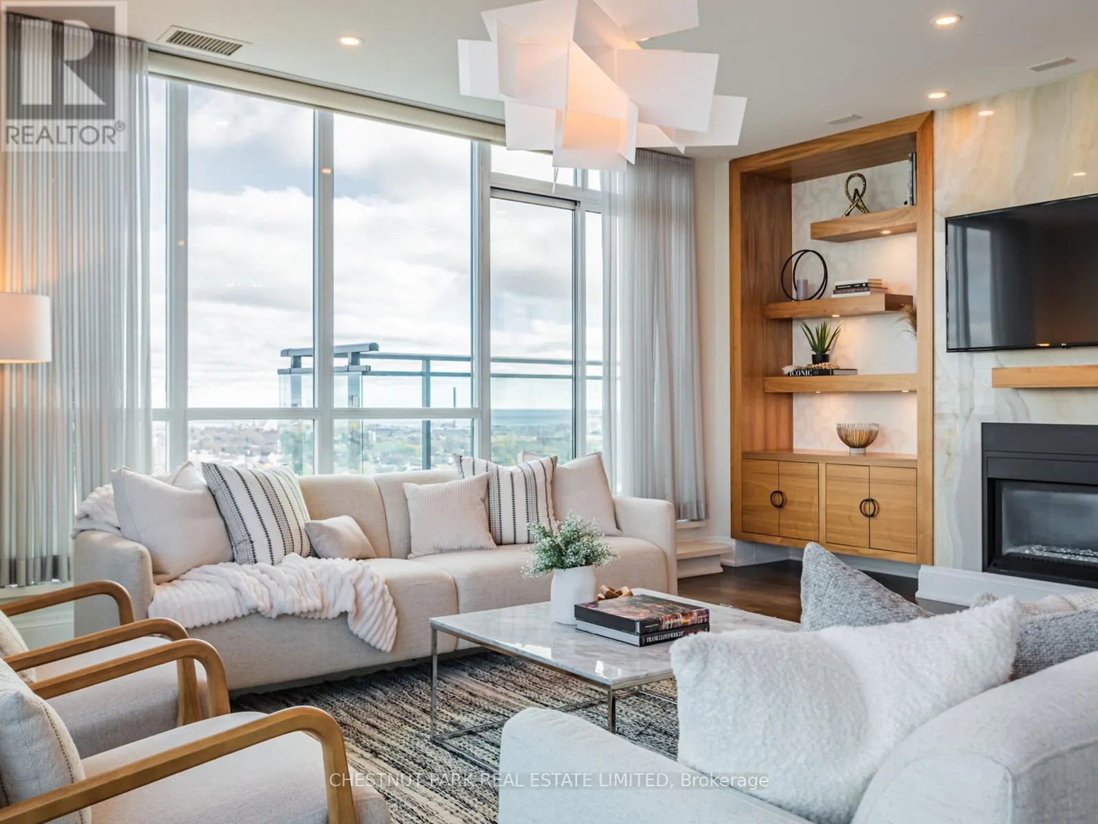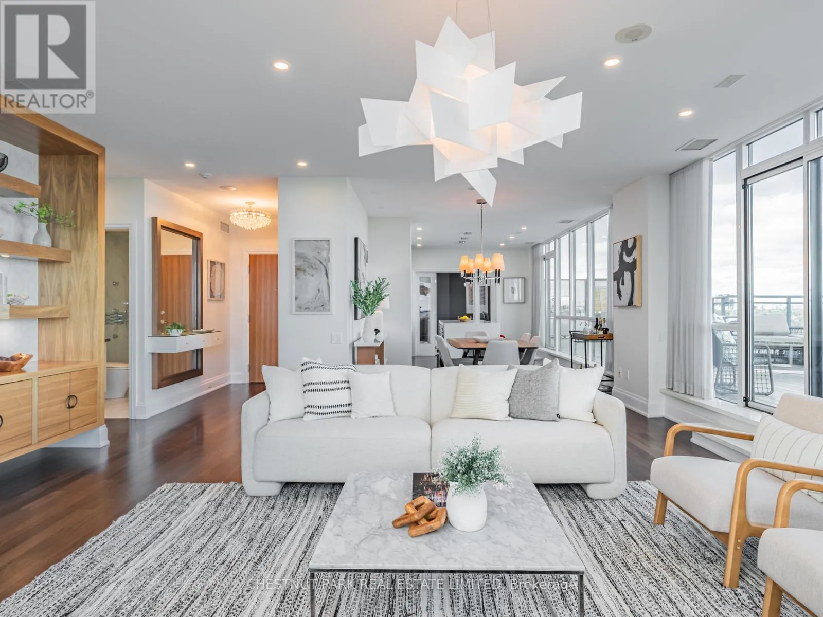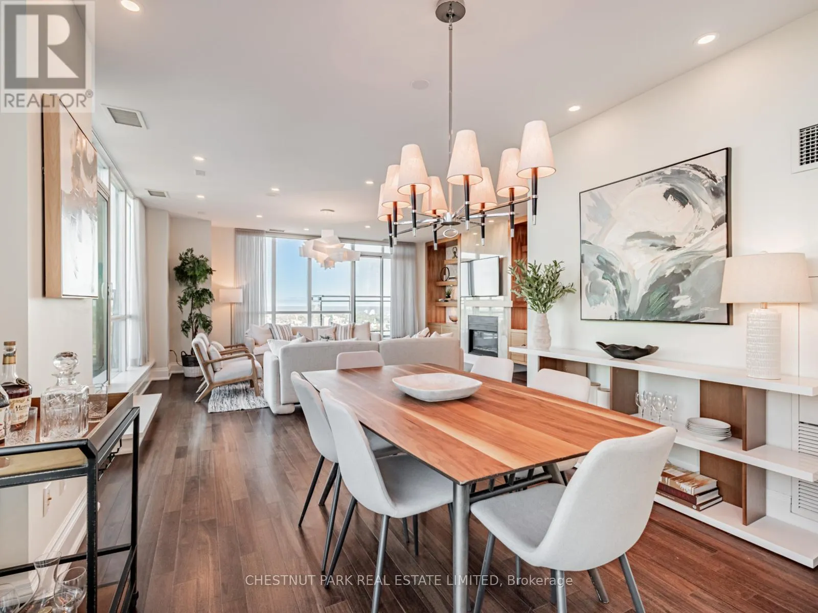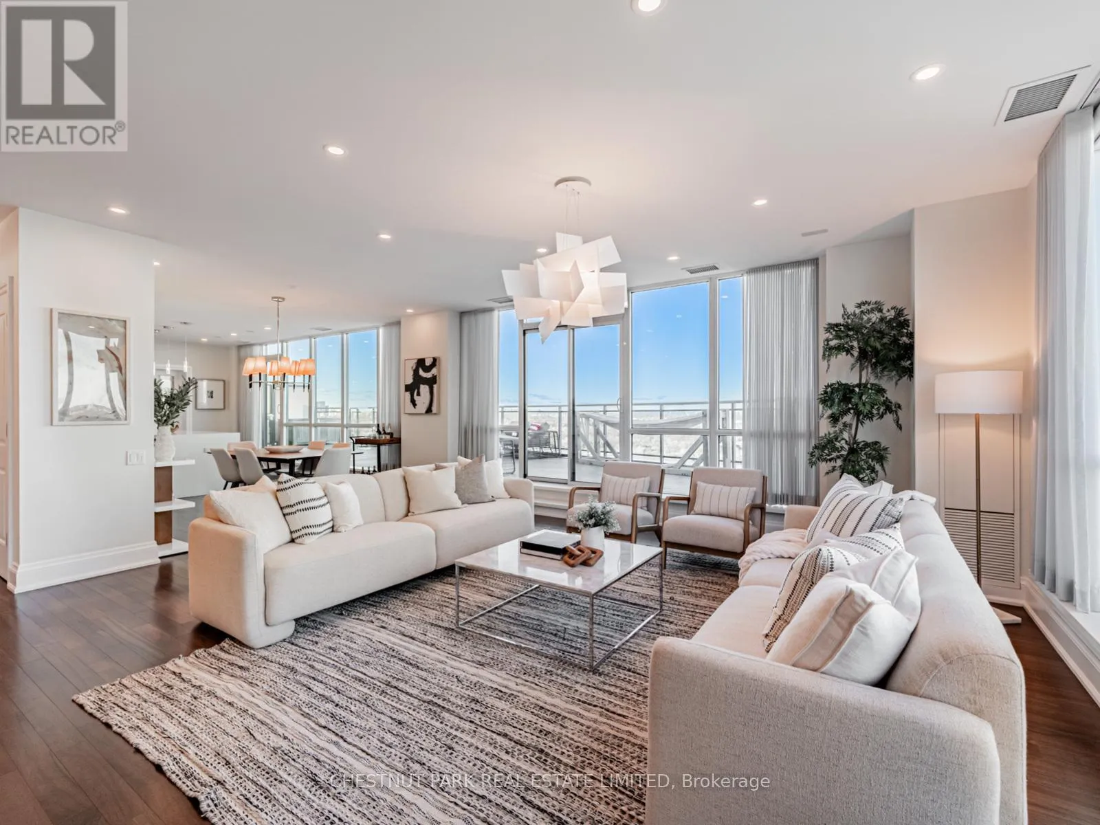Broadview Ave & Mortimer Ave As one of only two penthouses in the building, this breathtaking corner suite offers panoramic north east views that stretch endlessly, providing a dramatic backdrop for daily life & evening relaxation. With 1,554 sq ft of beautifully designed & upgraded interiors and approx. 700 sq ft of outdoor space, this condo is bathed in natural light, thanks to the floor-to-ceiling windows that accentuate the open, airy atmosphere.The spacious, open-concept living & dining areas, accented by warm hardwood flooring & a cozy gas fireplace with custom built-ins, effortlessly connect to both a large terrace & a balcony. Imagine stepping out from either the living or dining room to savor the impressive skyline views, creating the perfect setting for entertaining or simply unwinding under the stars. A Bose sound system elevates the ambiance in the living, dining, office & terrace, providing a perfect soundtrack to complement every moment.Designed for culinary enthusiasts, the renovated kitchen boasts wolf & sub-zero appliances & ample space to create unforgettable meals. Featuring 2 generously sized bedrooms, a versatile den/office (which has a murphy bed & could serve as a 3rd bedroom), & 2 full bathrooms. A rare oversized terrace allows for outdoor lounging & BBQing while you take in the unobstructed views from your luxurious penthouse. With the added convenience of 2 underground side-by-side parking spaces & a locker for extra storage, this penthouse offers not only breathtaking beauty but also thoughtful practicality. Situated just minutes to the Brickworks, Playter Estates, the Danforth, with a walk score of 90, bike score of 98 & transit score of 94, you are just a few minutes to the subway & walking & biking trails. An incredible location that combines the best of nature and city conveniences. This suite combines design, stunning views, convenience & effortless luxury in the heart of our vibrant city. (id:27476)