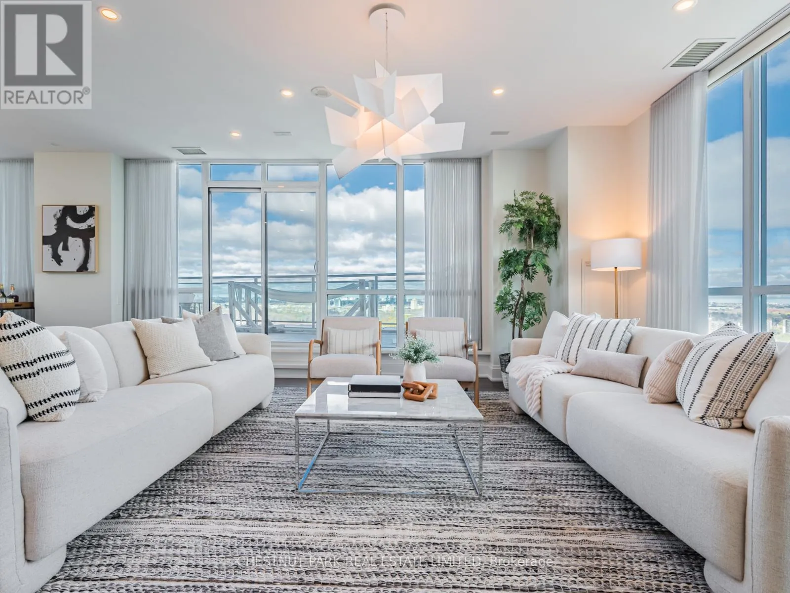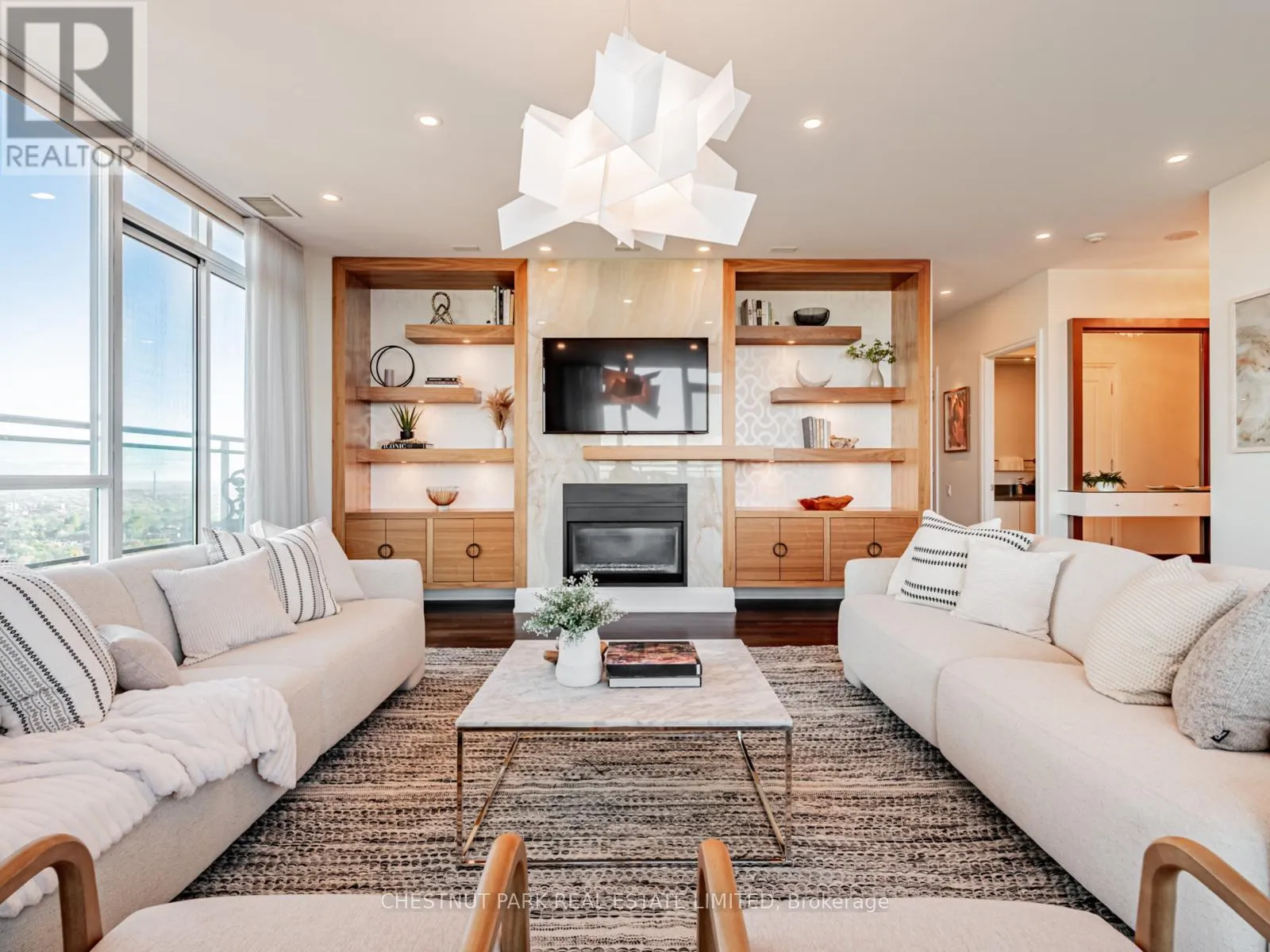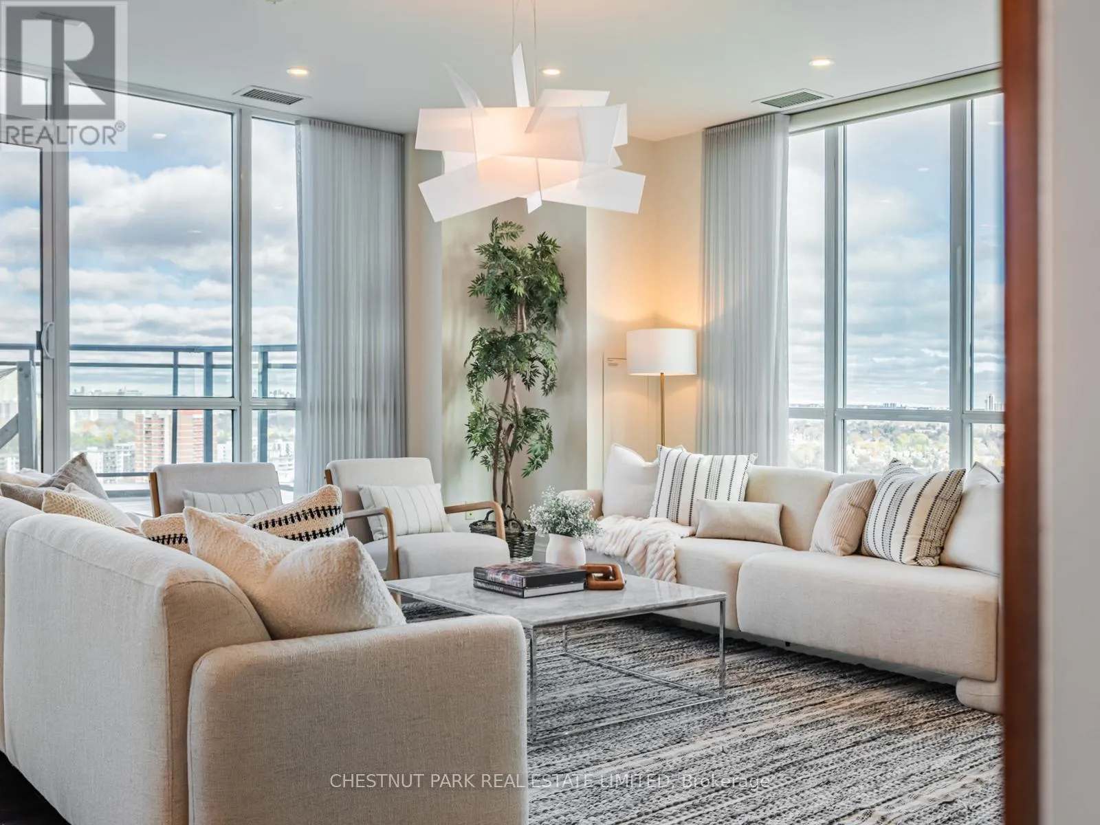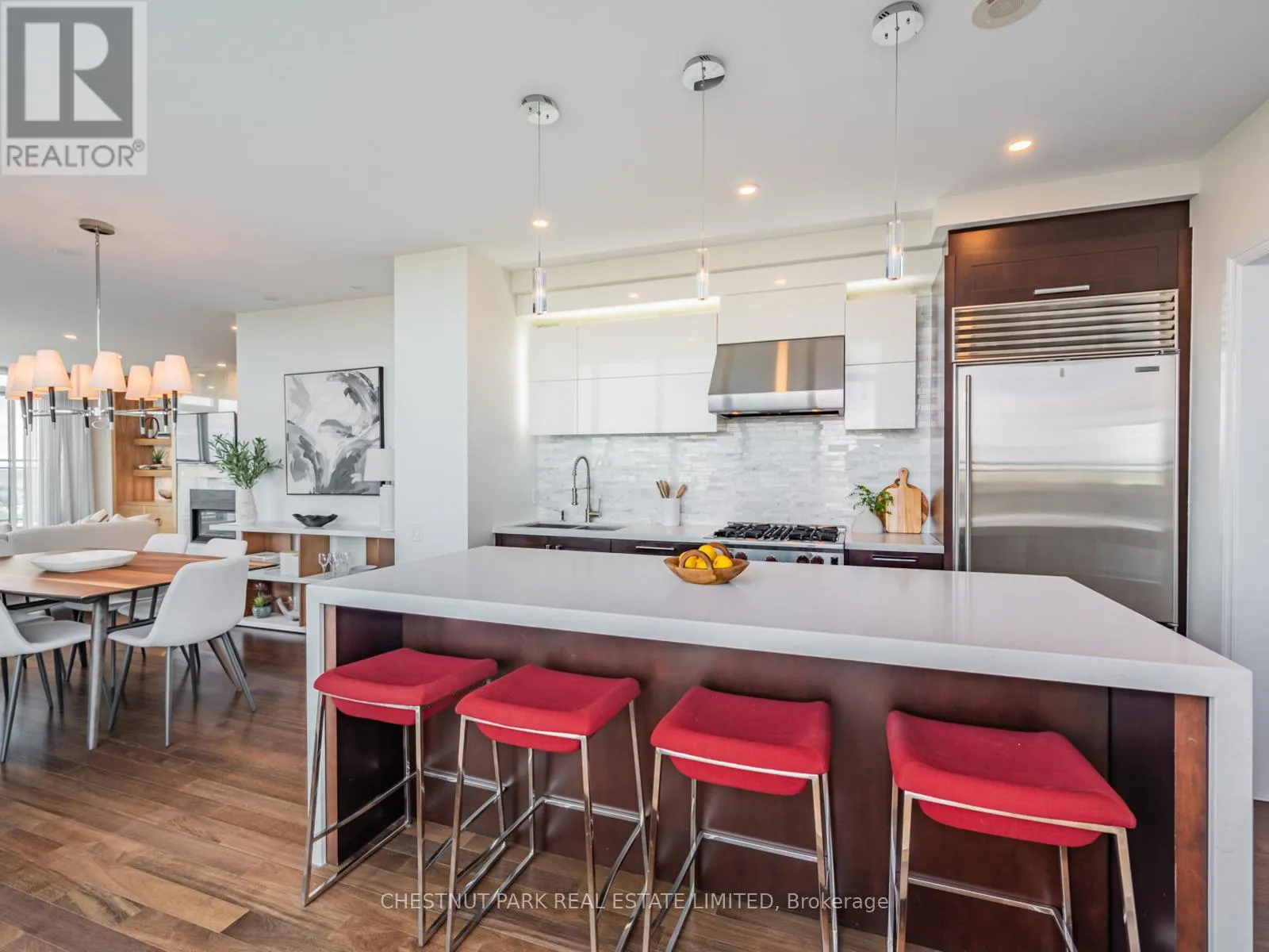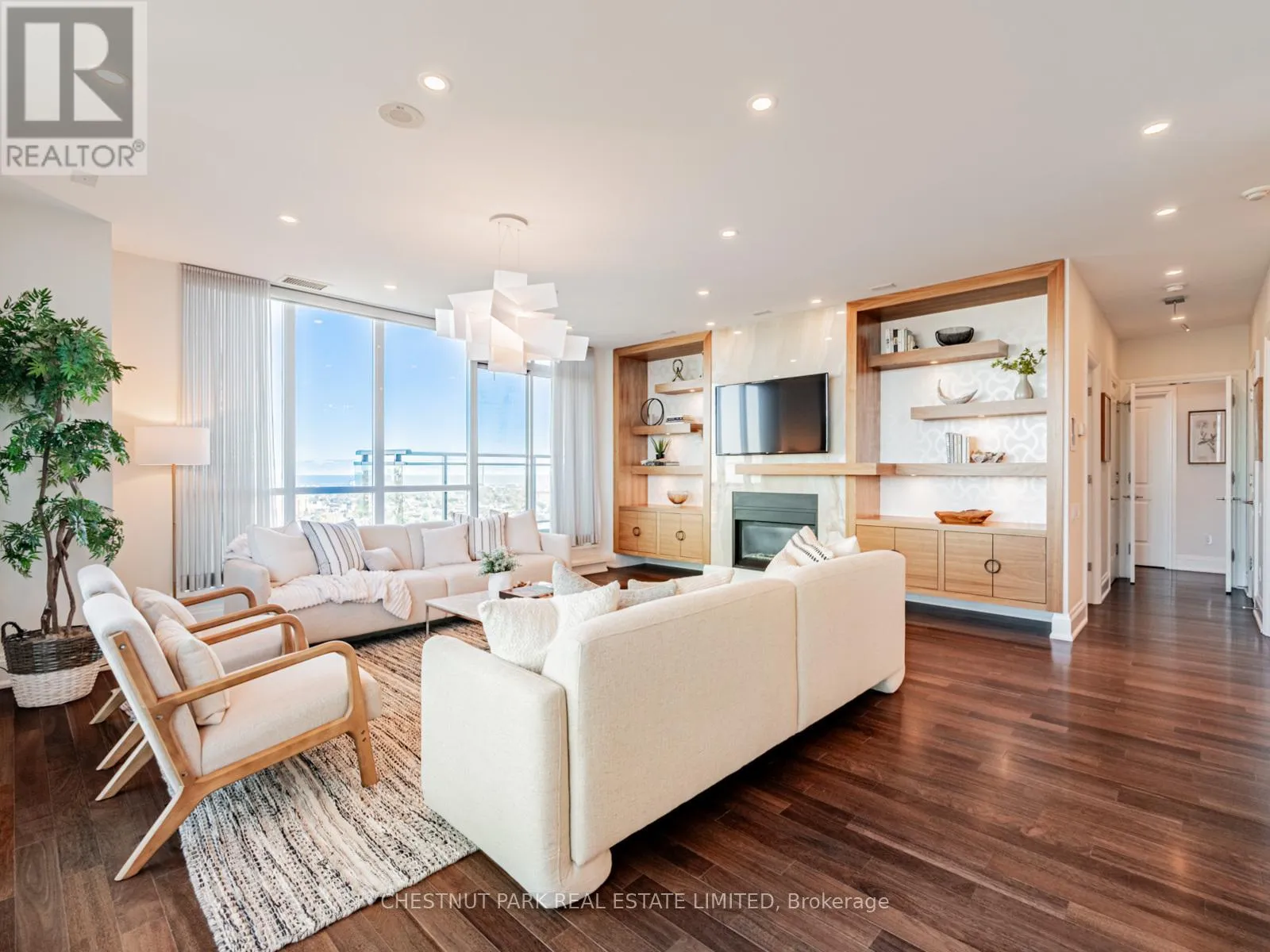 Broadview Ave & Mortimer Ave As one of only two penthouses in the building, this breathtaking corner suite offers panoramic north east views that stretch endlessly, providing a dramatic backdrop for daily life & evening relaxation. With 1,554 sq ft of beautifully designed & upgraded interiors and approx. 700 sq ft of outdoor space, this condo is bathed in natural light, thanks to the floor-to-ceiling windows that accentuate the open, airy atmosphere.The spacious, open-concept living & dining areas, accented by warm hardwood flooring & a cozy gas fireplace with custom built-ins, effortlessly connect to both a large terrace & a balcony. Imagine stepping out from either the living or dining room to savor the impressive skyline views, creating the perfect setting for entertaining or simply unwinding under the stars. A Bose sound system elevates the ambiance in the living, dining, office & terrace, providing a perfect soundtrack to complement every moment.Designed for culinary enthusiasts, the renovated kitchen boasts wolf & sub-zero appliances & ample space to create unforgettable meals. Featuring 2 generously sized bedrooms, a versatile den/office (which has a murphy bed & could serve as a 3rd bedroom), & 2 full bathrooms. A rare oversized terrace allows for outdoor lounging & BBQing while you take in the unobstructed views from your luxurious penthouse. With the added convenience of 2 underground side-by-side parking spaces & a locker for extra storage, this penthouse offers not only breathtaking beauty but also thoughtful practicality. Situated just minutes to the Brickworks, Playter Estates, the Danforth, with a walk score of 90, bike score of 98 & transit score of 94, you are just a few minutes to the subway & walking & biking trails. An incredible location that combines the best of nature and city conveniences. This suite combines design, stunning views, convenience & effortless luxury in the heart of our vibrant city. (id:27476)