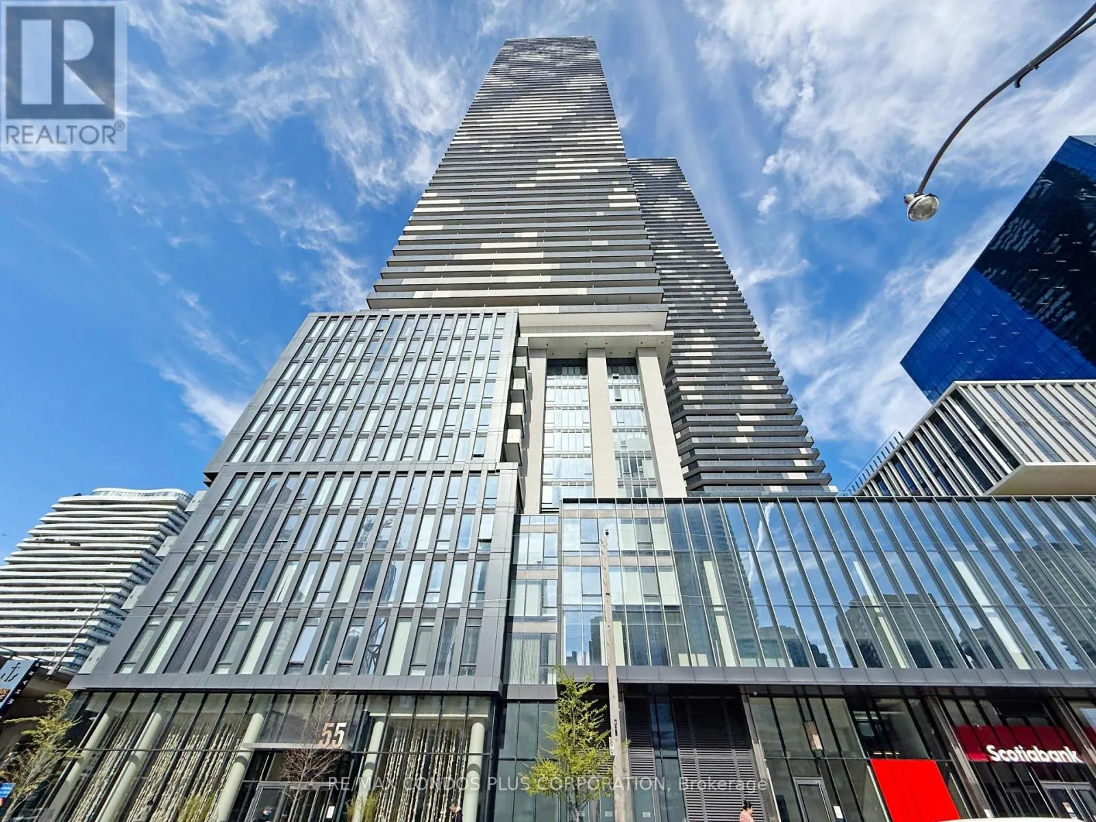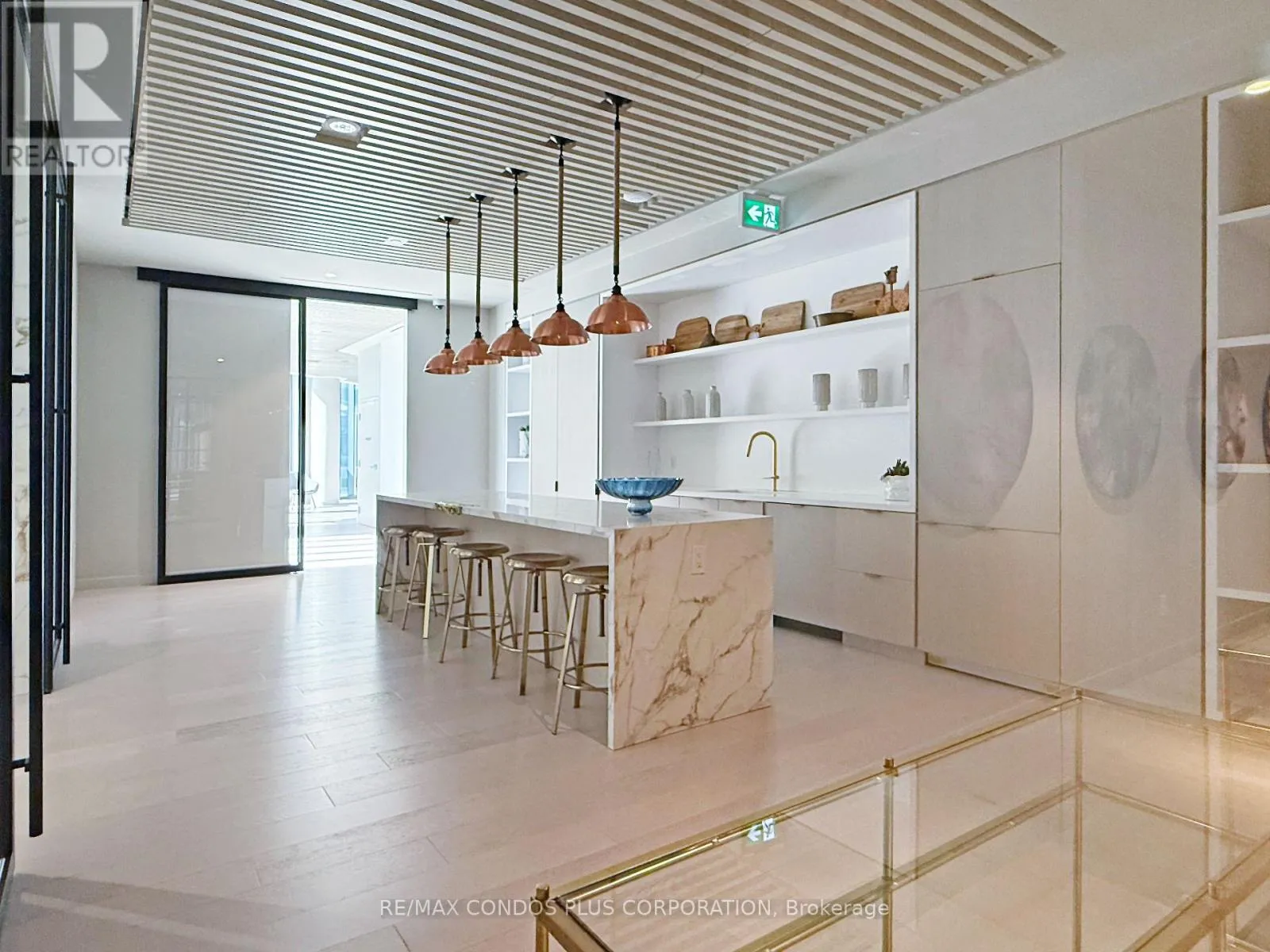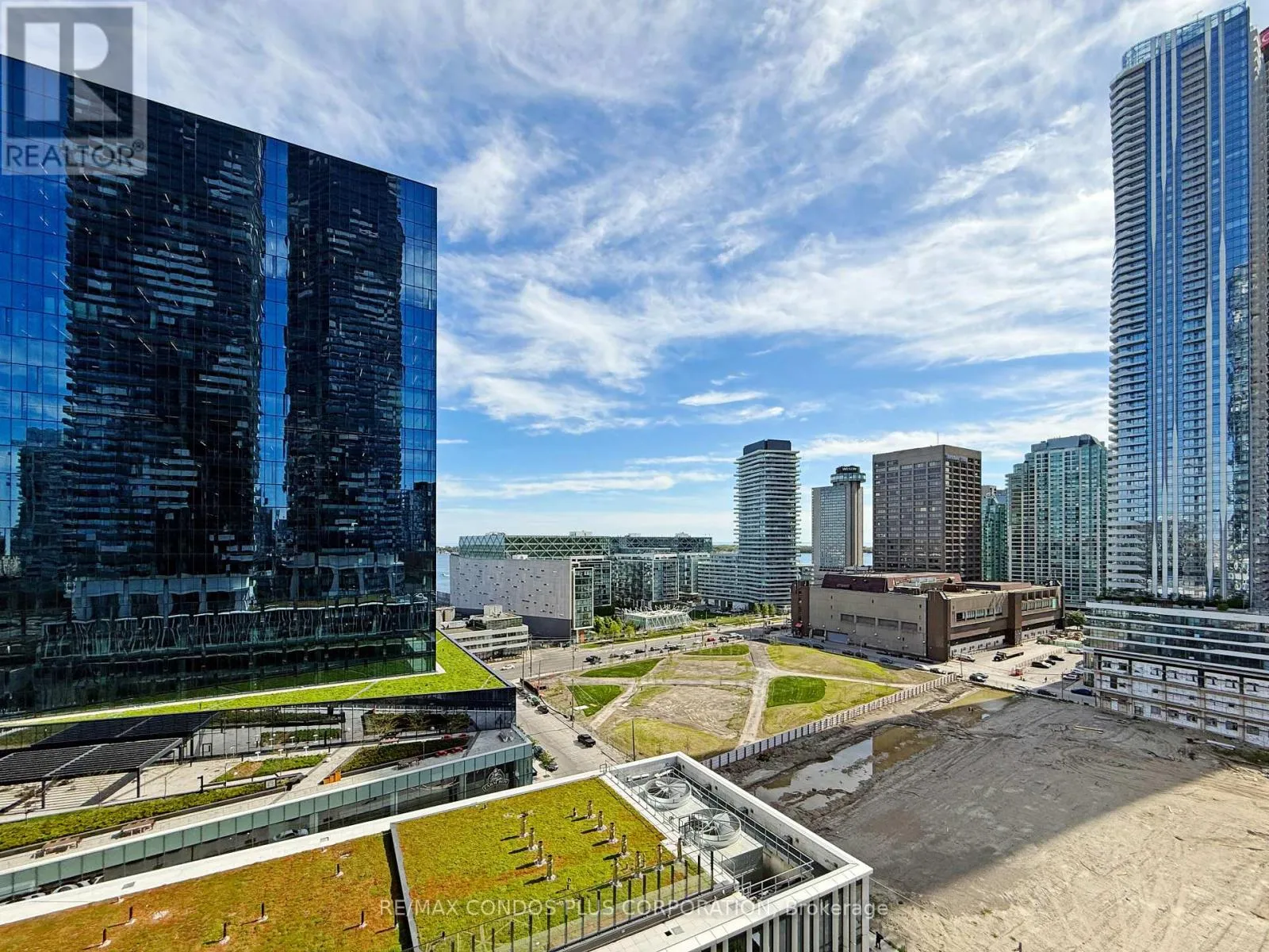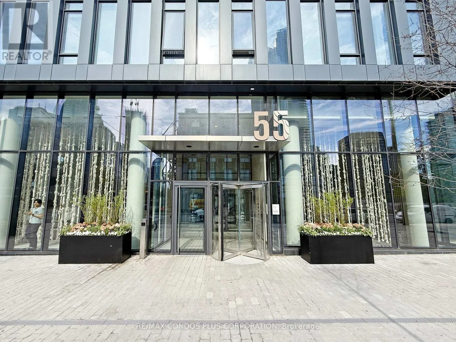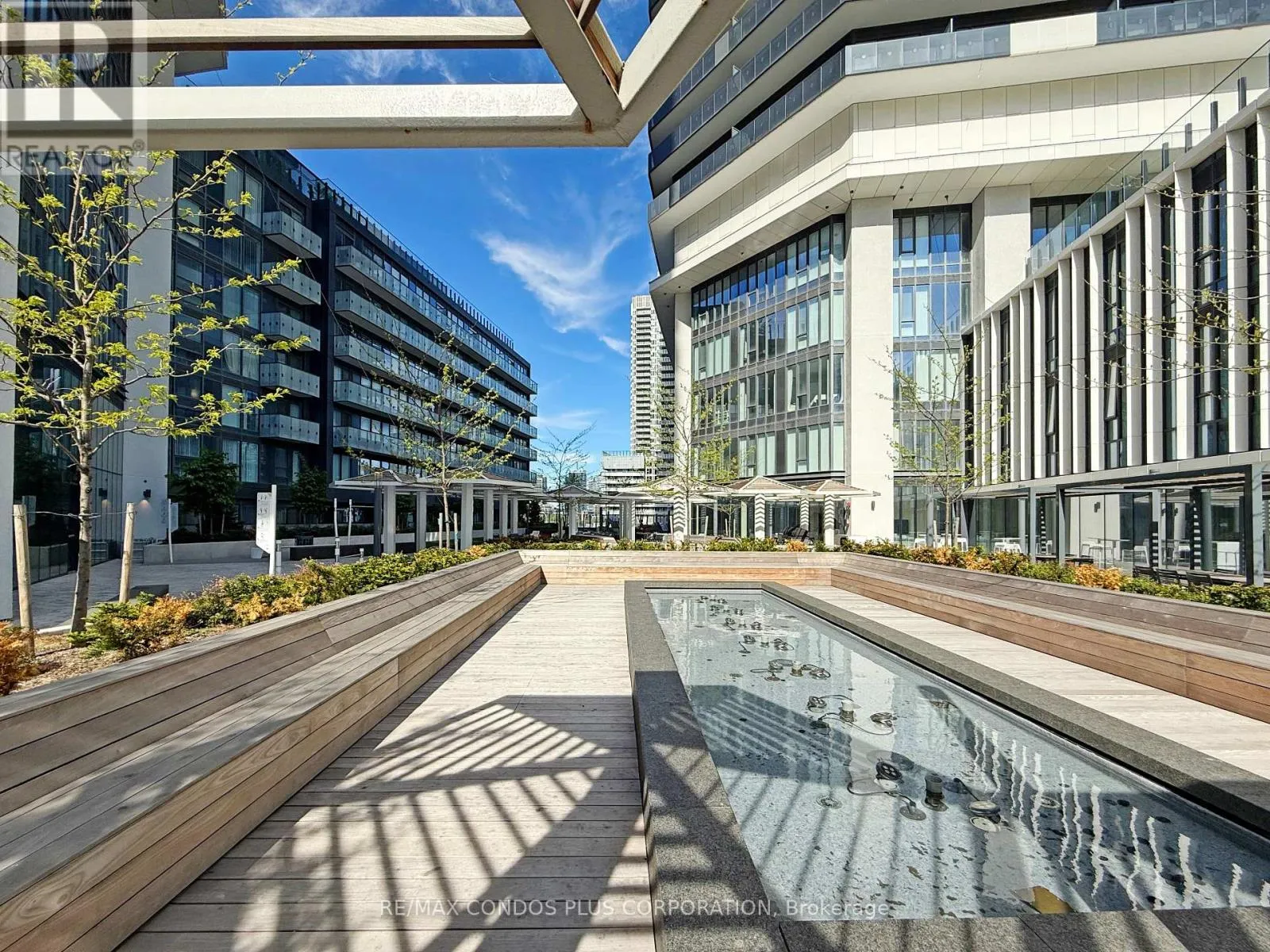 Queens Quay E & Cooper St 1+Den unit with 1 bath in family-oriented Sugar Wharf condos by Menkes, offering 664 sq. ft. of interior space plus a 157 sq. ft. balcony. This suite features 9' smooth-finish ceilings, laminate flooring throughout, and floor-to-ceiling windows. The open-concept kitchen includes custom-designed cabinetry with a pantry, engineered quartz countertops, a porcelain slab backsplash, integrated appliances, and track lighting. The primary bedroom offers a walk-in closet. The spacious den can function comfortably as a second bedroom. The modern 4-piece bathroom features a shower with a frameless clear glass door and open wall-mounted shelving for extra storage. The angled, architecturally designed balcony offers a partial south-facing view of the lake. Residents enjoy premium amenities including a grand 2-storey lobby with 24-hour concierge, a state-of-the-art fitness centre with aerobics and basketball courts, indoor lap pool, co-working rooms, party room with kitchen, social lounges, theatre rooms, hobby studio, kids play zone, hammock lounge, BBQ terrace, and hotel-style guest suites. Walking distance to the waterfront, Sugar Beach, parks, Union Station, St. Lawrence Market, and the Financial District. Just steps to shops, restaurants, Farm Boy, Loblaws, LCBO, and future direct PATH access with an on-site school planned. (id:27476)