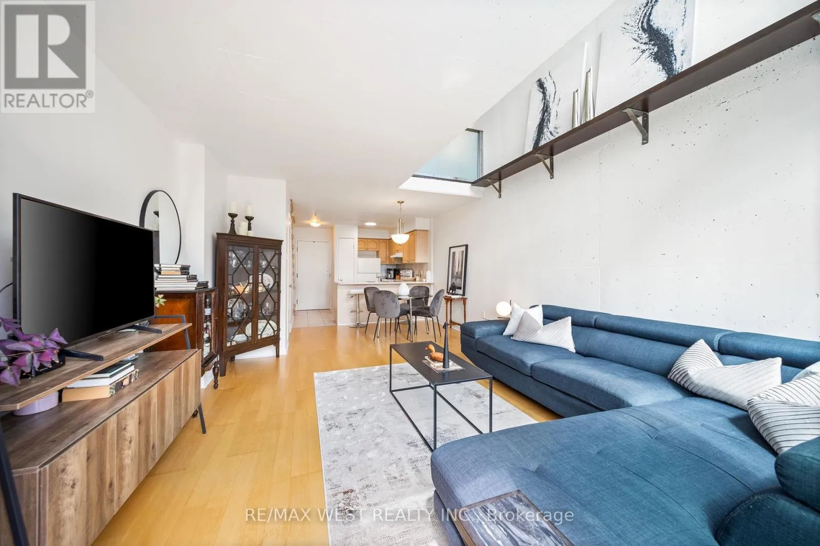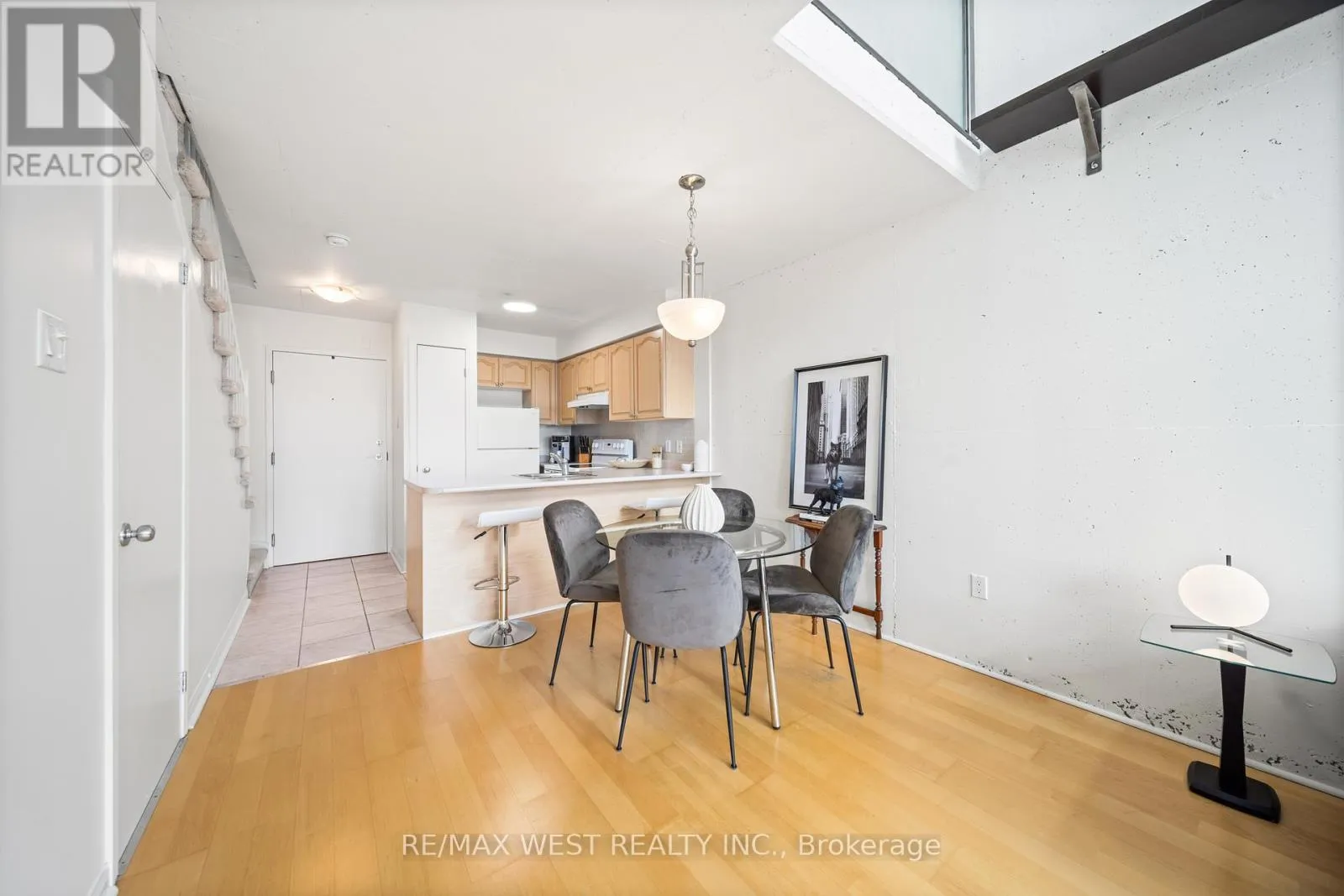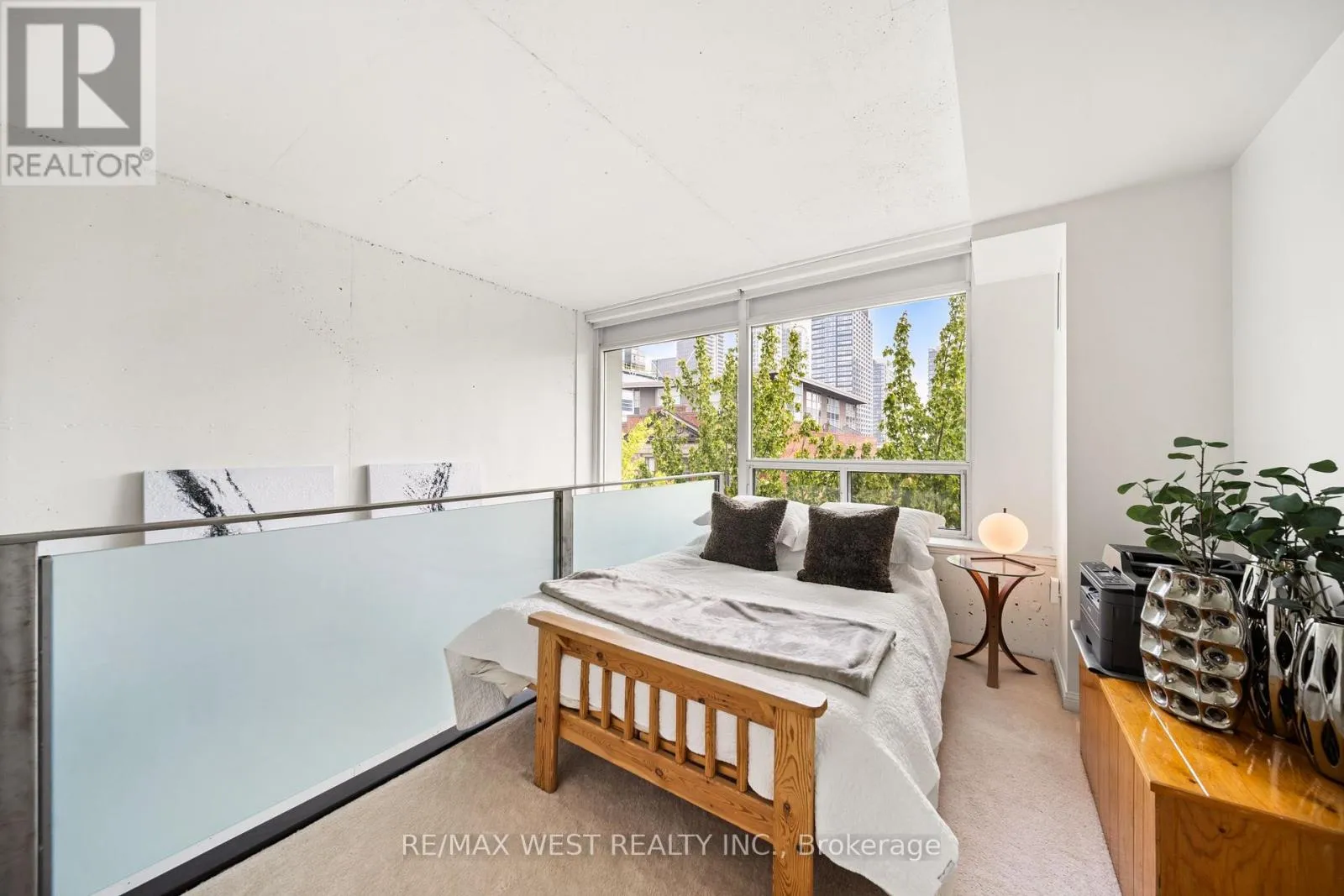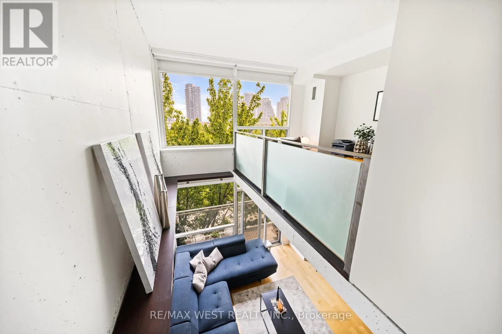 King St and Crawford Welcome to 954 King St West, suite 510, a bright and airy 2 storey, 1+1 bedroom, 2 bathroom unit in the King West Village Lofts.Nestled in the heart of King West, this condo is within easy walking distance of the fashion, entertainment, dining, shopping and night life attractions of this vibrant downtown neighbourhood. You can walk to Trinity Bellwoods Park and have a picnic, or stroll down to Liberty Village and the Exhibition grounds.We are also close to many local TTC routes as well as the Exhibition GO station. This suite features an open plan main level with hardwood floors and double height floor-to-ceiling windows letting in an abundance of natural light.The spacious living room has soaring 17ft ceilings, amplifying the sense of spaciousness, and a quiet balcony where you can enjoy your morning coffee.The functional kitchen is open to the living and dining area and has a large breakfast bar - perfect for entertaining. There is also a powder room on the main level. Upstairs there are two bright rooms; the primary bedroom with a double closet and ensuite 4 peice bathroom with a laundry room, as well as a second speacious room can be used as a bright, open office or even a spare bedroom. This unit comes with a parking spot and a locker. The building amenities include a gym, a party room, a meeting room and a media room. What a great opportunity to enjoy a downtown life style in the sought after King West neighbourhood! (id:27476)