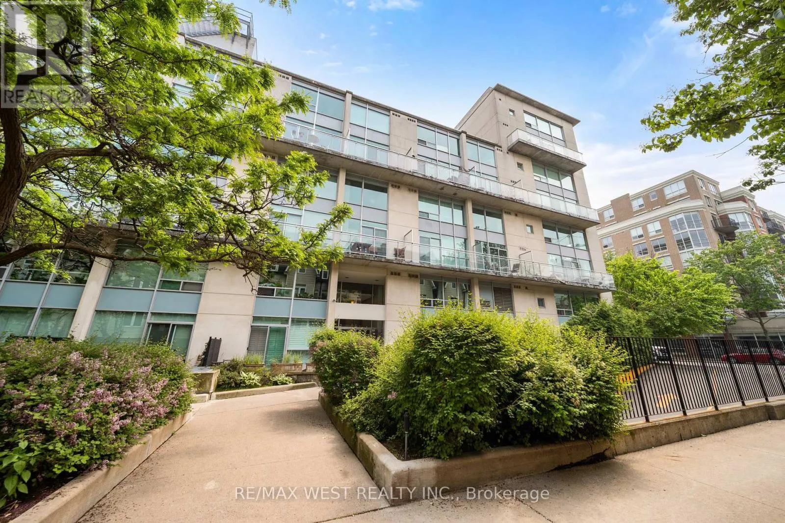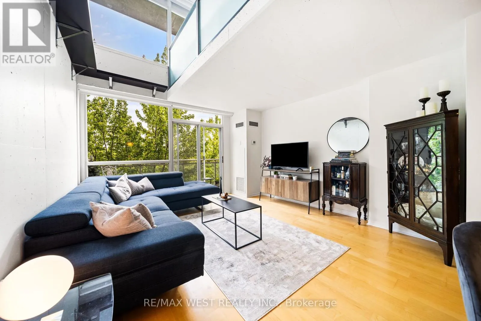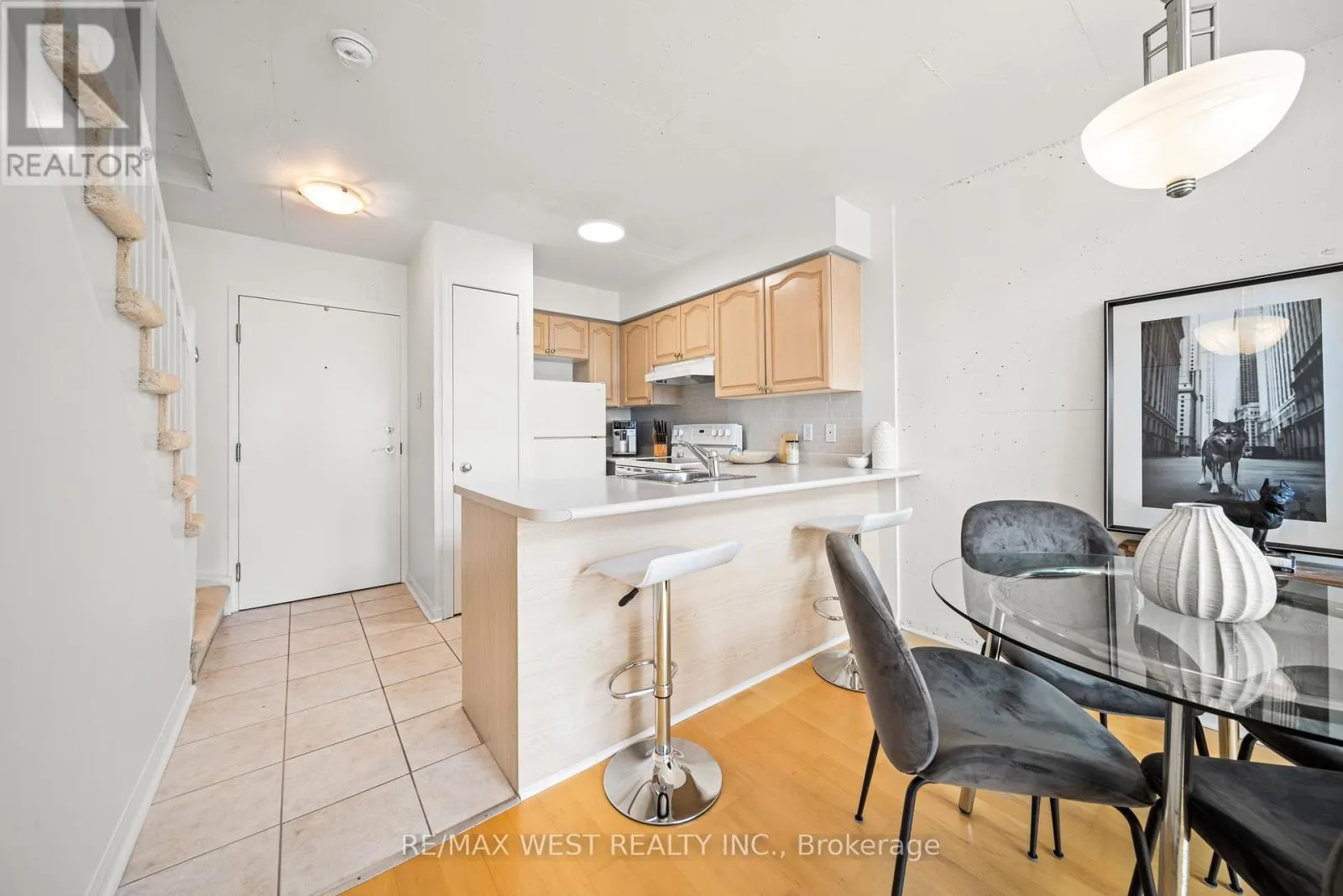 King St and Crawford Welcome to 954 King St West, suite 510, a bright and airy 2 storey, 1+1 bedroom, 2 bathroom unit in the King West Village Lofts.Nestled in the heart of King West, this condo is within easy walking distance of the fashion, entertainment, dining, shopping and night life attractions of this vibrant downtown neighbourhood. You can walk to Trinity Bellwoods Park and have a picnic, or stroll down to Liberty Village and the Exhibition grounds.We are also close to many local TTC routes as well as the Exhibition GO station. This suite features an open plan main level with hardwood floors and double height floor-to-ceiling windows letting in an abundance of natural light.The spacious living room has soaring 17ft ceilings, amplifying the sense of spaciousness, and a quiet balcony where you can enjoy your morning coffee.The functional kitchen is open to the living and dining area and has a large breakfast bar - perfect for entertaining. There is also a powder room on the main level. Upstairs there are two bright rooms; the primary bedroom with a double closet and ensuite 4 peice bathroom with a laundry room, as well as a second speacious room can be used as a bright, open office or even a spare bedroom. This unit comes with a parking spot and a locker. The building amenities include a gym, a party room, a meeting room and a media room. What a great opportunity to enjoy a downtown life style in the sought after King West neighbourhood! (id:27476)