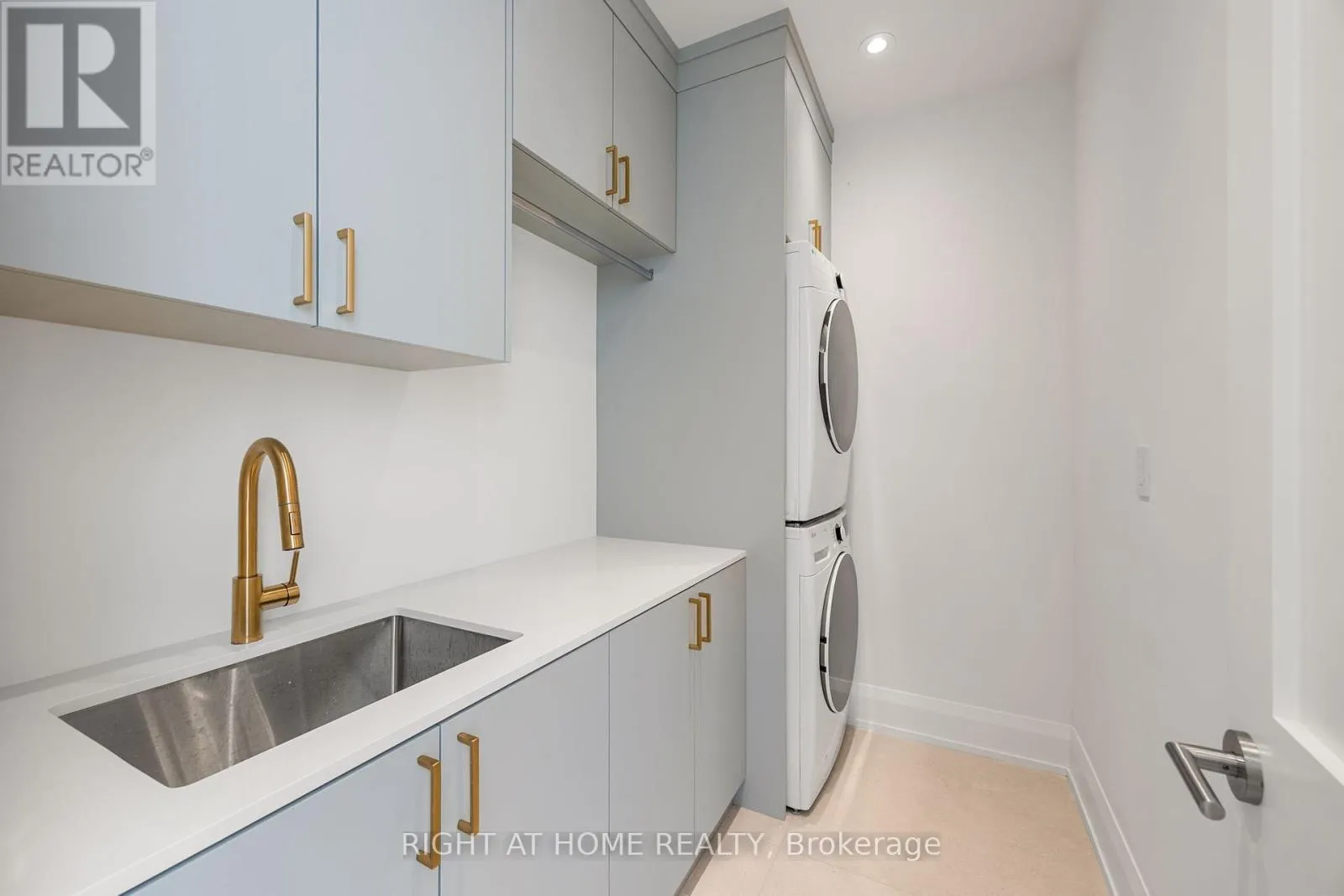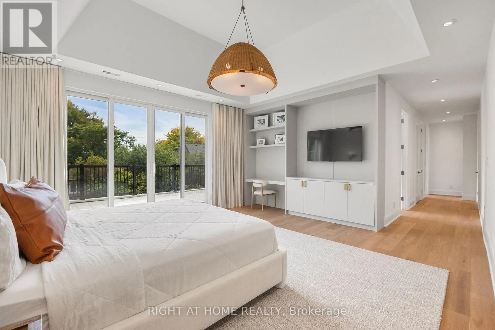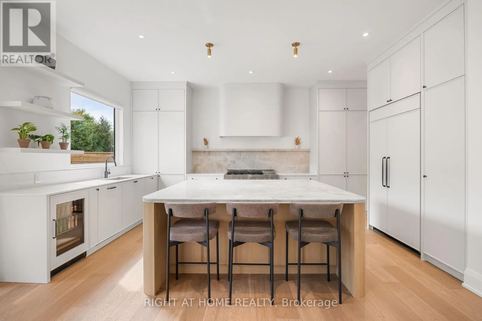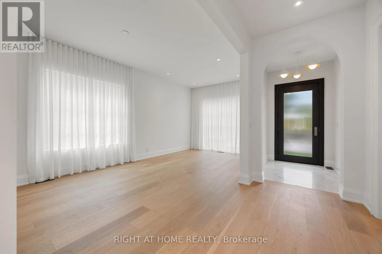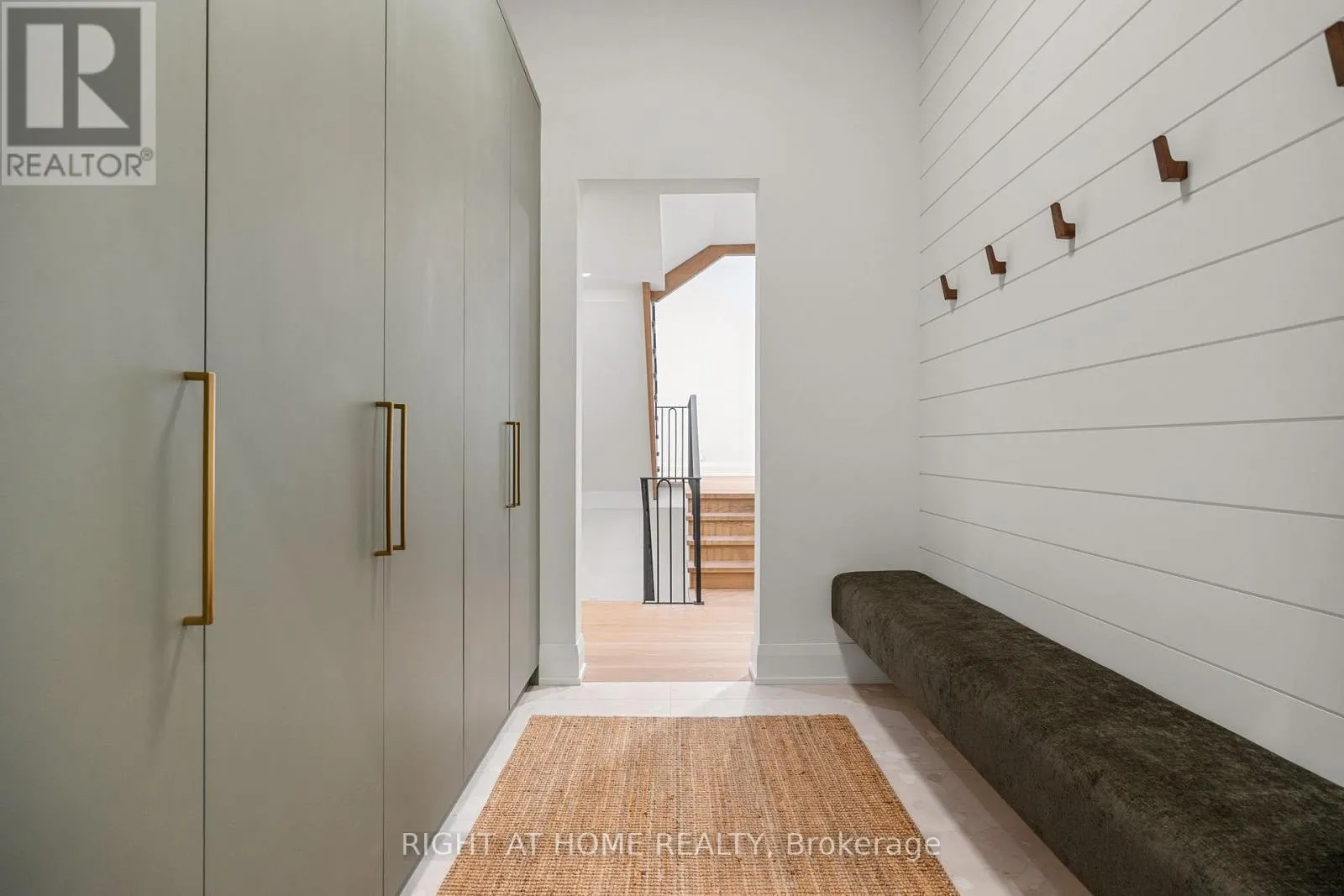 Cross Streets: Bathurst St. & Sheppard Ave. W. ** Directions: South West. Welcome to this meticulously crafted 5-bedroom custom home, tucked away on a rare and quiet cul-de-sac. With 5,700 SF of refined living space, this residence is set on an ultra-wide, south-facing lot, allowing for a distinctive design and layout rarely found on narrower properties. The architectural detail is unmistakable: the bold inverted front roofline, elegant limestone and brick exterior, Kingshore windows with sleek drywall reveals, cantilevered porch, custom wrought-iron railings create a striking first impression. Beautiful arched doorways elegantly define the interior, leading to the private home office, mudroom w/ custom millwork & built-in bench, and family room w/ gas travertine fireplace set in a stylish built-in. The chefs kitchen has a dramatic rounded custom hood, an oversized Taj Mahal stone island, appliance garage, servery w glass cabinetry and second sink rough-in, and a walk-in pantry. Professional Kitchen Aid appliances, including a 48" gas range & 48" panel-ready fridge, complete the space. Fluted doors frame the bar area, finished with a bevelled white oak floating shelf and micro-cement accent wall. A striking white oak staircase w/ custom wrought-iron railings leads to the impressive 2nd floor foyer, crowned by massive skylights. The second floor offers five spacious bedrooms, each with generous closet space and ensuites. The grand primary suite, accessed through a private hallway, features a sitting room, custom TV built-in/desk, an oversized walk-in closet with vanity and linen closet. Its spa-like marble ensuite offers a double vanity with Taj Mahal countertops and handcrafted wood pulls, heated floors, private water closet & oversized shower with floating bench and travertine surround.The fully finished lower level features a home theatre, large rec area, home gym with rubber flooring, two bedrooms, secondary laundry, and ample storage. Large private yard with covered terrace, glass railings, green wall, and sleek ceiling design. (id:27476)