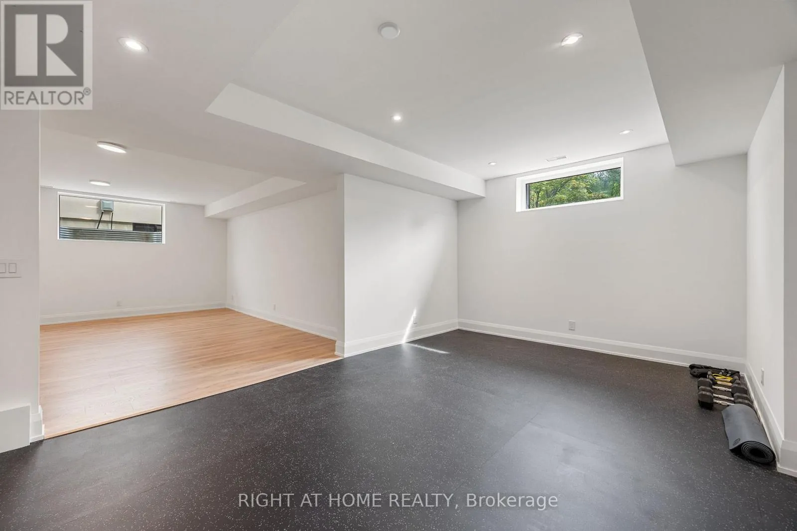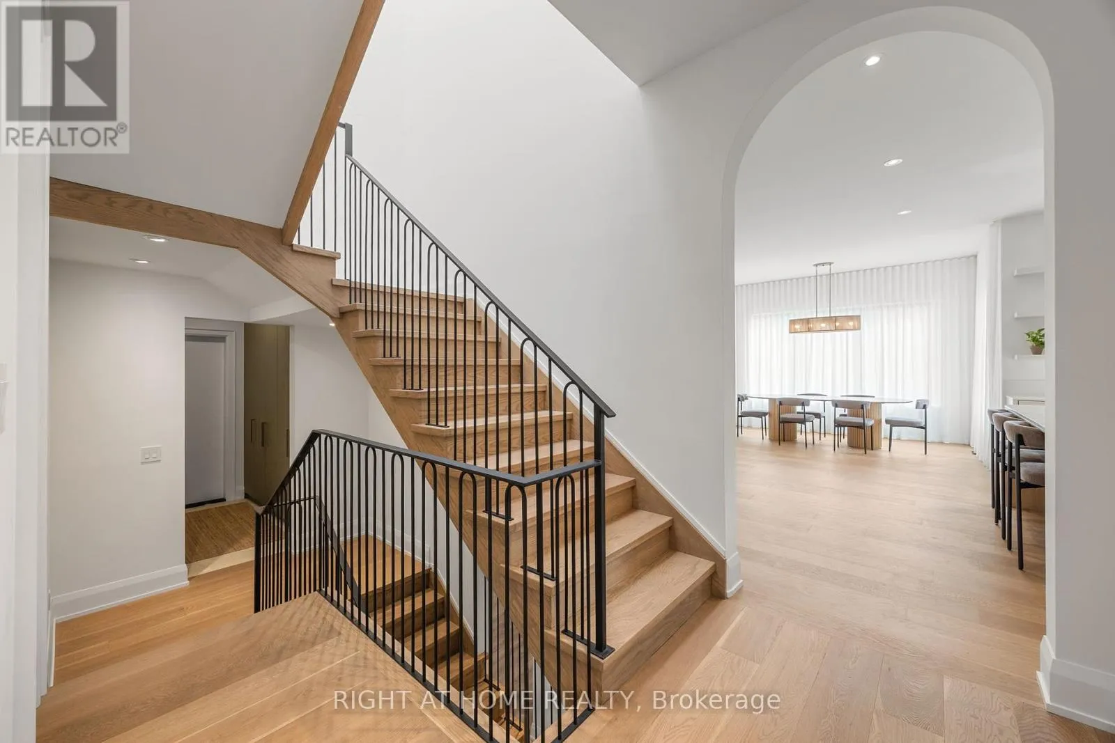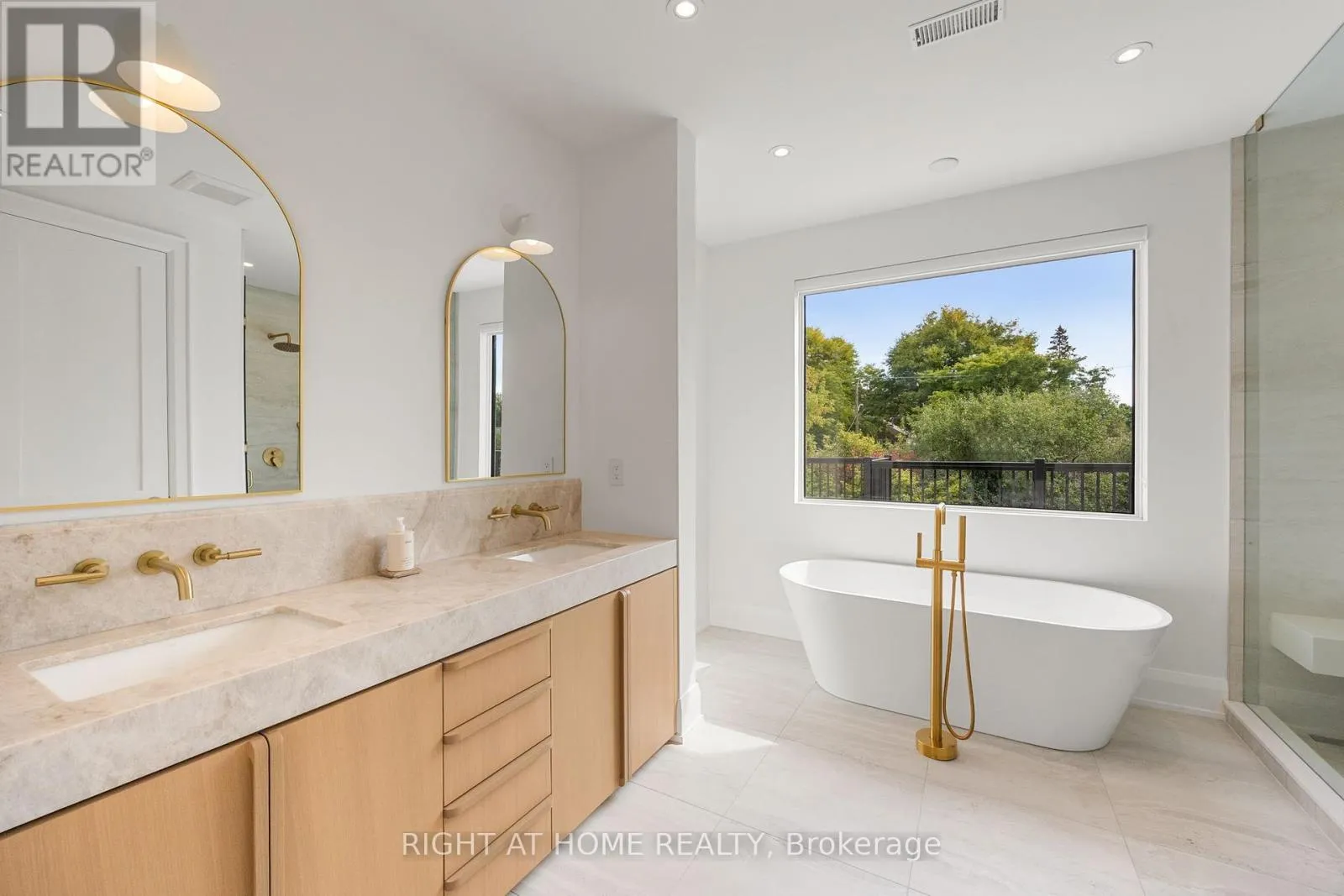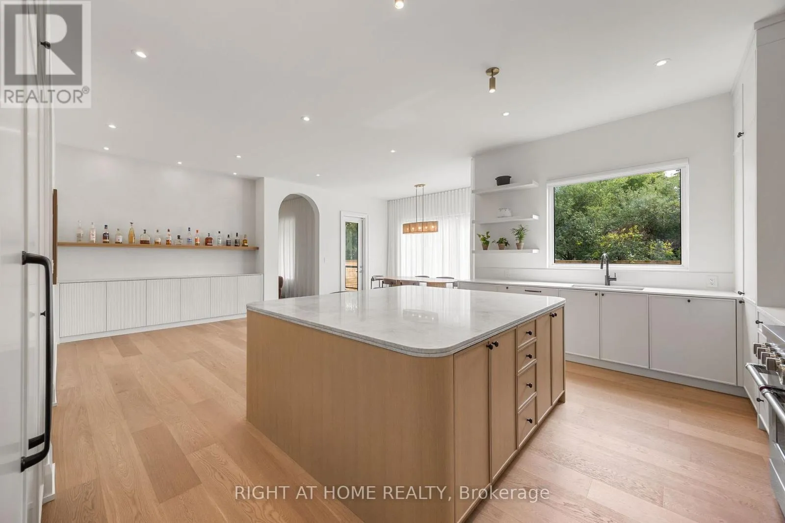 Cross Streets: Bathurst St. & Sheppard Ave. W. ** Directions: South West. Welcome to this meticulously crafted 5-bedroom custom home, tucked away on a rare and quiet cul-de-sac. With 5,700 SF of refined living space, this residence is set on an ultra-wide, south-facing lot, allowing for a distinctive design and layout rarely found on narrower properties. The architectural detail is unmistakable: the bold inverted front roofline, elegant limestone and brick exterior, Kingshore windows with sleek drywall reveals, cantilevered porch, custom wrought-iron railings create a striking first impression. Beautiful arched doorways elegantly define the interior, leading to the private home office, mudroom w/ custom millwork & built-in bench, and family room w/ gas travertine fireplace set in a stylish built-in. The chefs kitchen has a dramatic rounded custom hood, an oversized Taj Mahal stone island, appliance garage, servery w glass cabinetry and second sink rough-in, and a walk-in pantry. Professional Kitchen Aid appliances, including a 48" gas range & 48" panel-ready fridge, complete the space. Fluted doors frame the bar area, finished with a bevelled white oak floating shelf and micro-cement accent wall. A striking white oak staircase w/ custom wrought-iron railings leads to the impressive 2nd floor foyer, crowned by massive skylights. The second floor offers five spacious bedrooms, each with generous closet space and ensuites. The grand primary suite, accessed through a private hallway, features a sitting room, custom TV built-in/desk, an oversized walk-in closet with vanity and linen closet. Its spa-like marble ensuite offers a double vanity with Taj Mahal countertops and handcrafted wood pulls, heated floors, private water closet & oversized shower with floating bench and travertine surround.The fully finished lower level features a home theatre, large rec area, home gym with rubber flooring, two bedrooms, secondary laundry, and ample storage. Large private yard with covered terrace, glass railings, green wall, and sleek ceiling design. (id:27476)