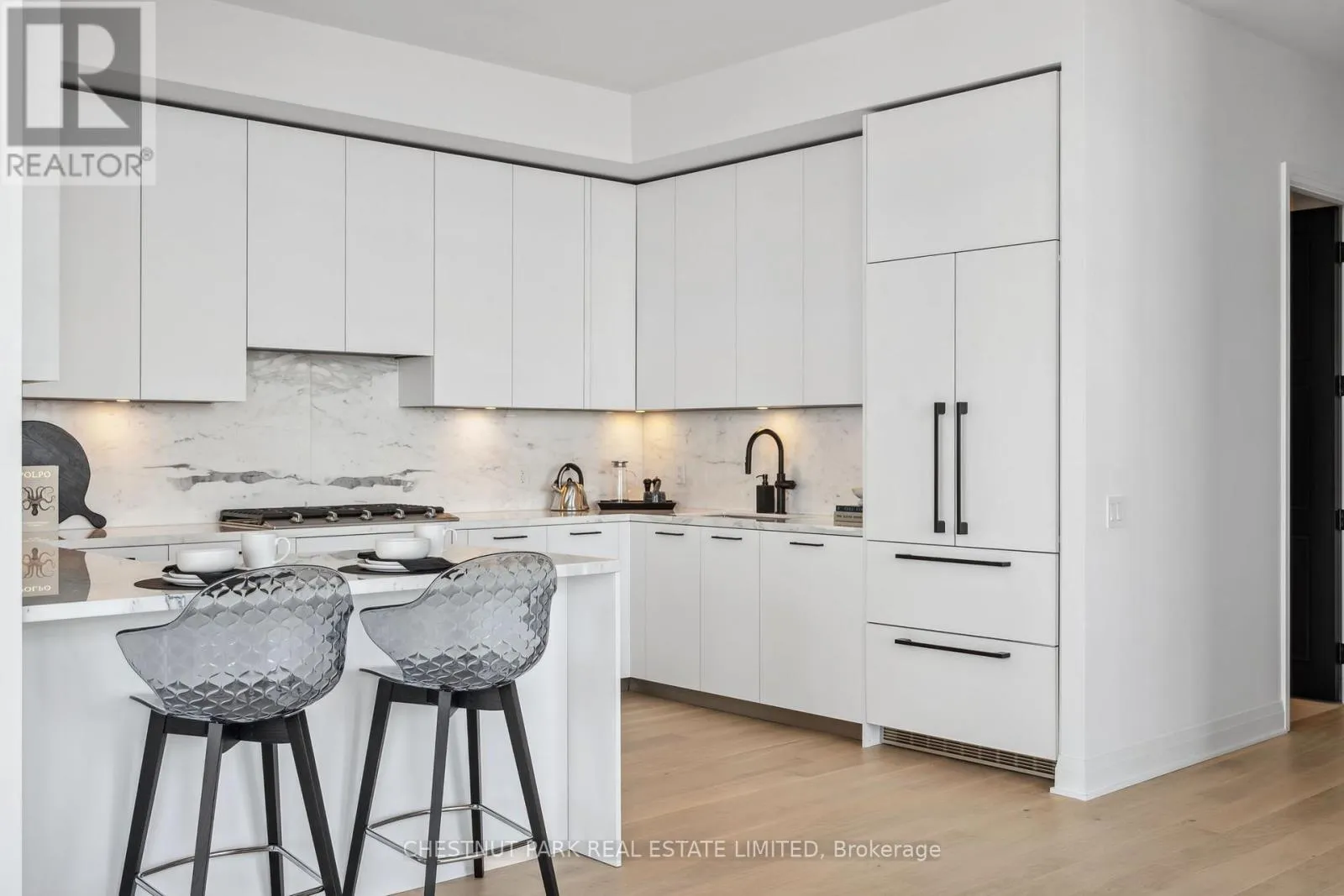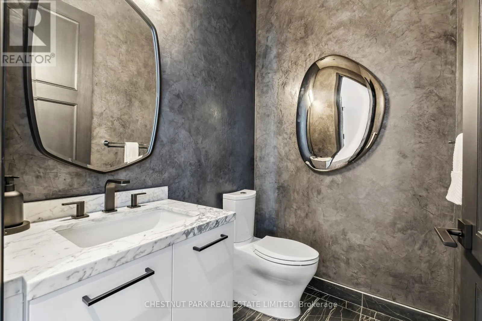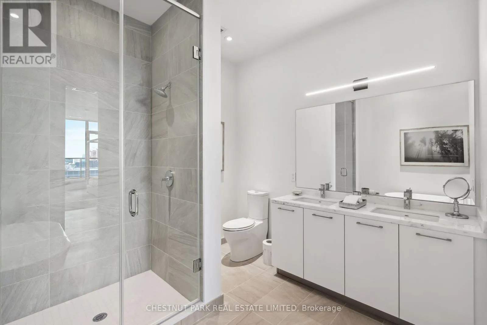 Eglinton & Brentcliffe Welcome to this stunning southeast corner upper penthouse in the heart of Leaside, boasting sweeping city views, 10-foot ceilings, and floor-to-ceiling windows. Enter through diamond-patterned porcelain tile and a custom granite archway into the expansive great room, featuring custom fluted millwork, open shelving with Christian Lacroix wallpaper, and four seamlessly integrated frameless TVs. The south-facing balcony is perfect for entertaining, while the dining room offers a separate balcony and another Lacroix feature wall. The custom Trevisana kitchen dazzles with Calacatta marble countertops, Miele appliances, a 5-burner gas cooktop, and breakfast bar seating. The primary suite includes a private balcony, walk-in closet, and spa-like 6-piece ensuite. A guest bedroom offers its own walk-in closet and 3-piece ensuite. With black granite archways, glass walls, marble finishes, and elegant hardware throughout, this home is a true slice of heaven in the sky. (id:27476)