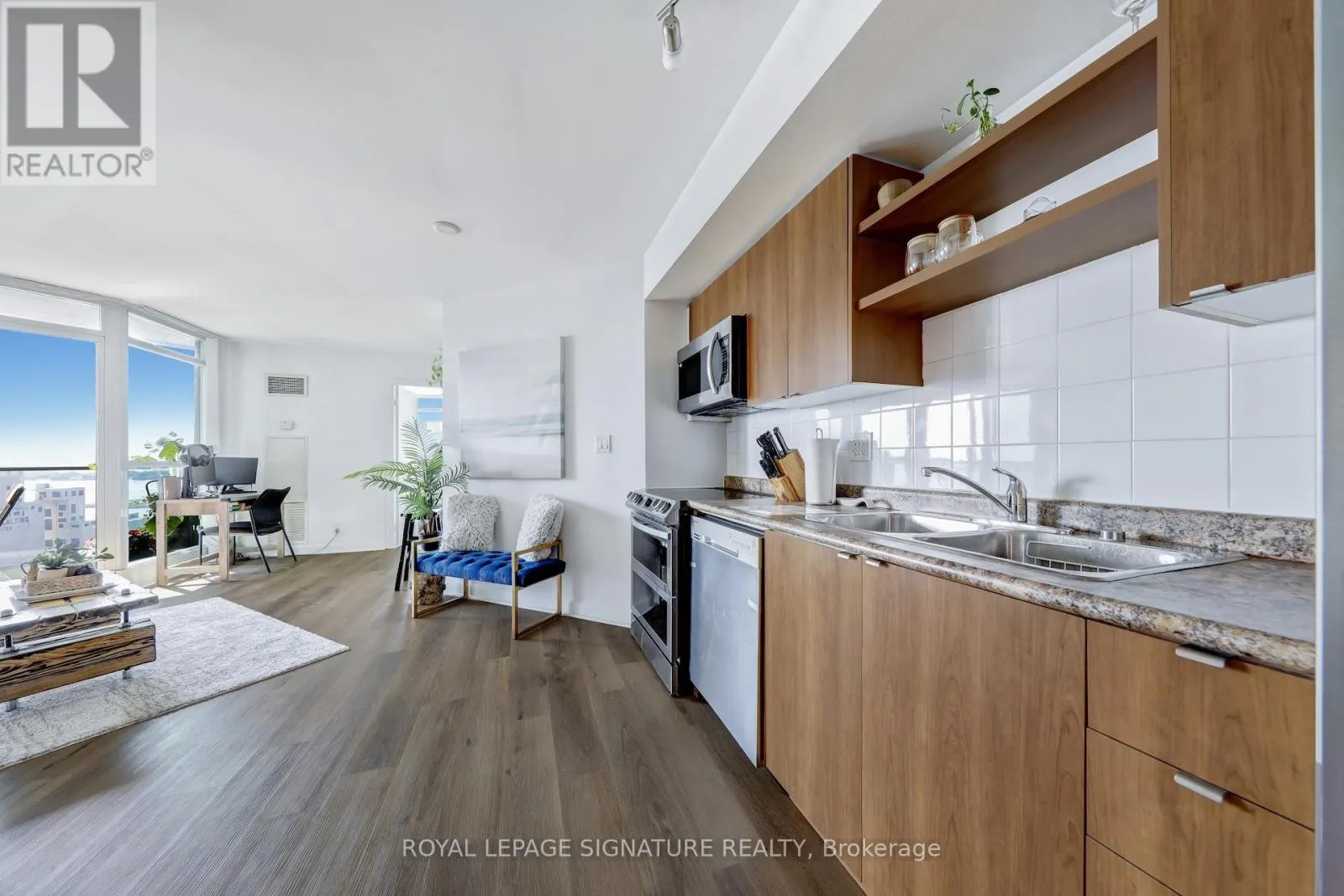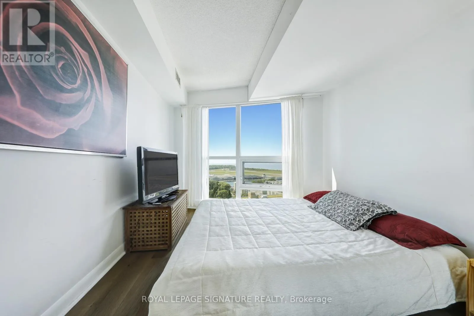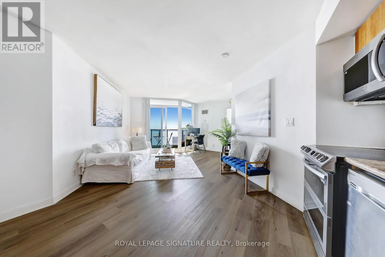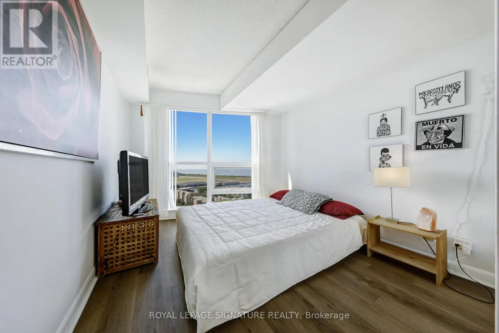 Bathurst/Lakeshore Welcome to this stunning South Lake-facing 2 Bedroom, 2 Bath Suite with unobstructed panoramic views of Toronto's lakefront. The spacious, open-concept living area and rooms are flooded with natural light, showcasing breathtaking city views. Newly renovated (hardwood floors, new appliances), high-end finishes, and thoughtful updates throughout, this modern condo exudes both comfort and style. The updated kitchen features sleek cabinet finishes, with a brand-new stove and overhead microwave. The well-appointed bedrooms and walk-in closet offer generous storage space and functional flexibility. The private balcony is the perfect spot for outdoor relaxation and sunset views overlooking the lake. The building offers a host of exceptional amenities, including a glass-enclosed pool with hot tub, an expansive outdoor BBQ deck, a community garden, party room, conference room, billiards room, and a fully equipped gym with a wraparound patio ideal for outdoor workouts or meditation. Additional features include a convenient pull-up and roundabout entry area and ample visitor parking. The suite comes with 1 parking space. Enjoy the convenience of the walkable location steps to the CNE, Lakeside Boardwalk, Billy Bishop Airport, and the TTC. You ask for it, Malibu Condos has it all. Perfect to live in or lease. Don't miss this opportunity to purchase a move-in-ready unit! (id:27476)
